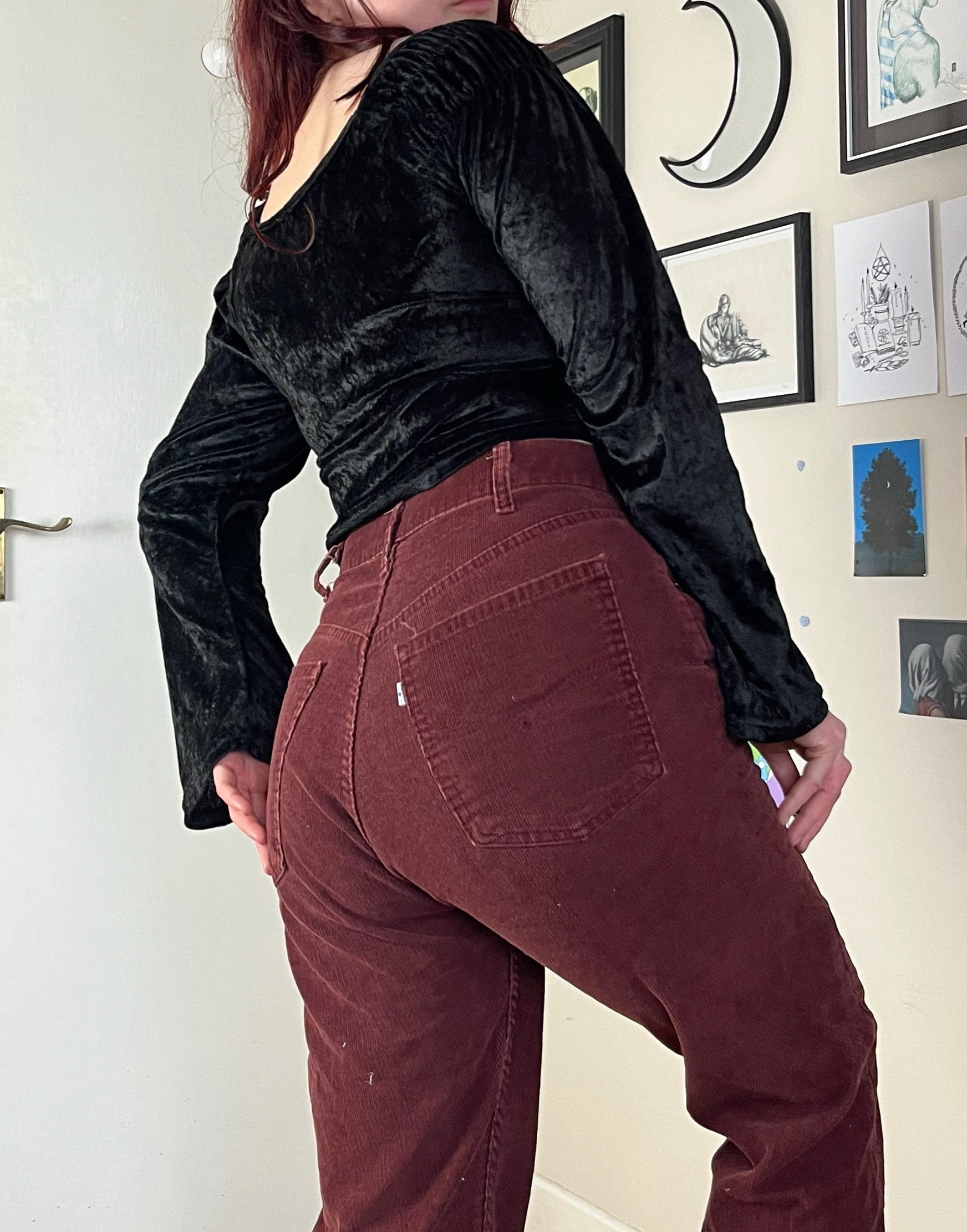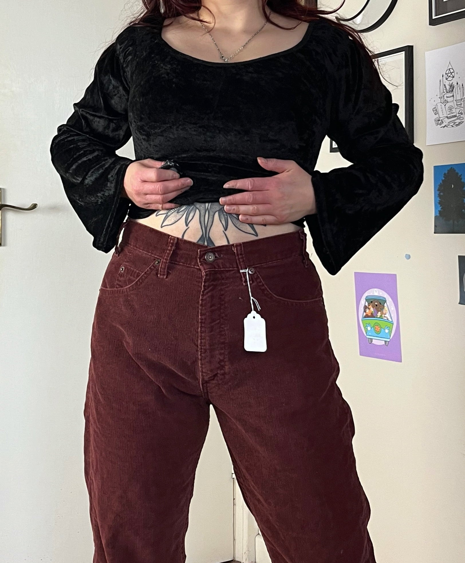 2000s burgundy corduroy pants by Levis! Zip up front with a slight flared leg and high waist.