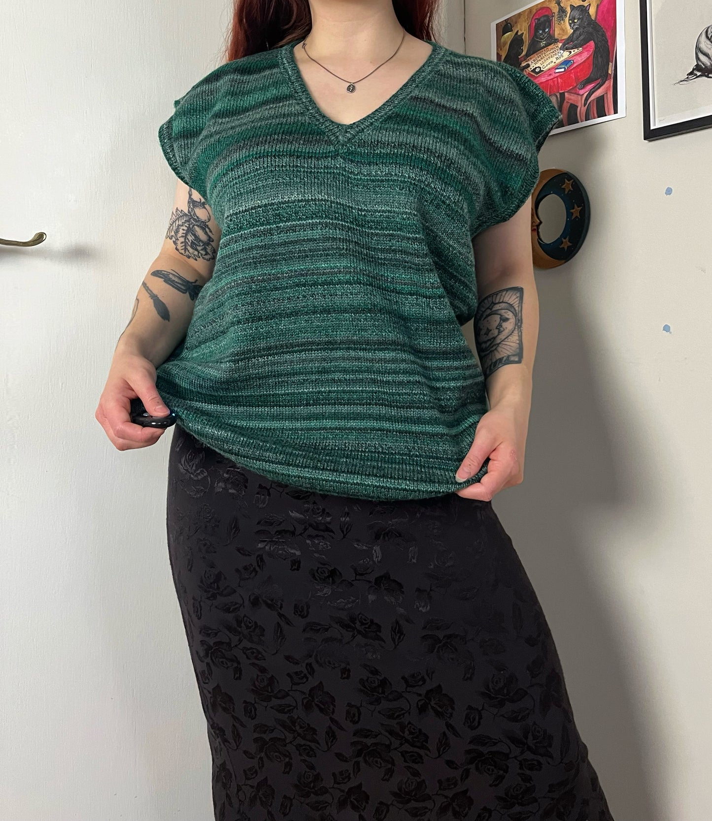 Super cute 90s green stripy sweater vest! Oversized cosy fit. In perfect vintage condition and would best fit UK 6-20 depending on desired fit.