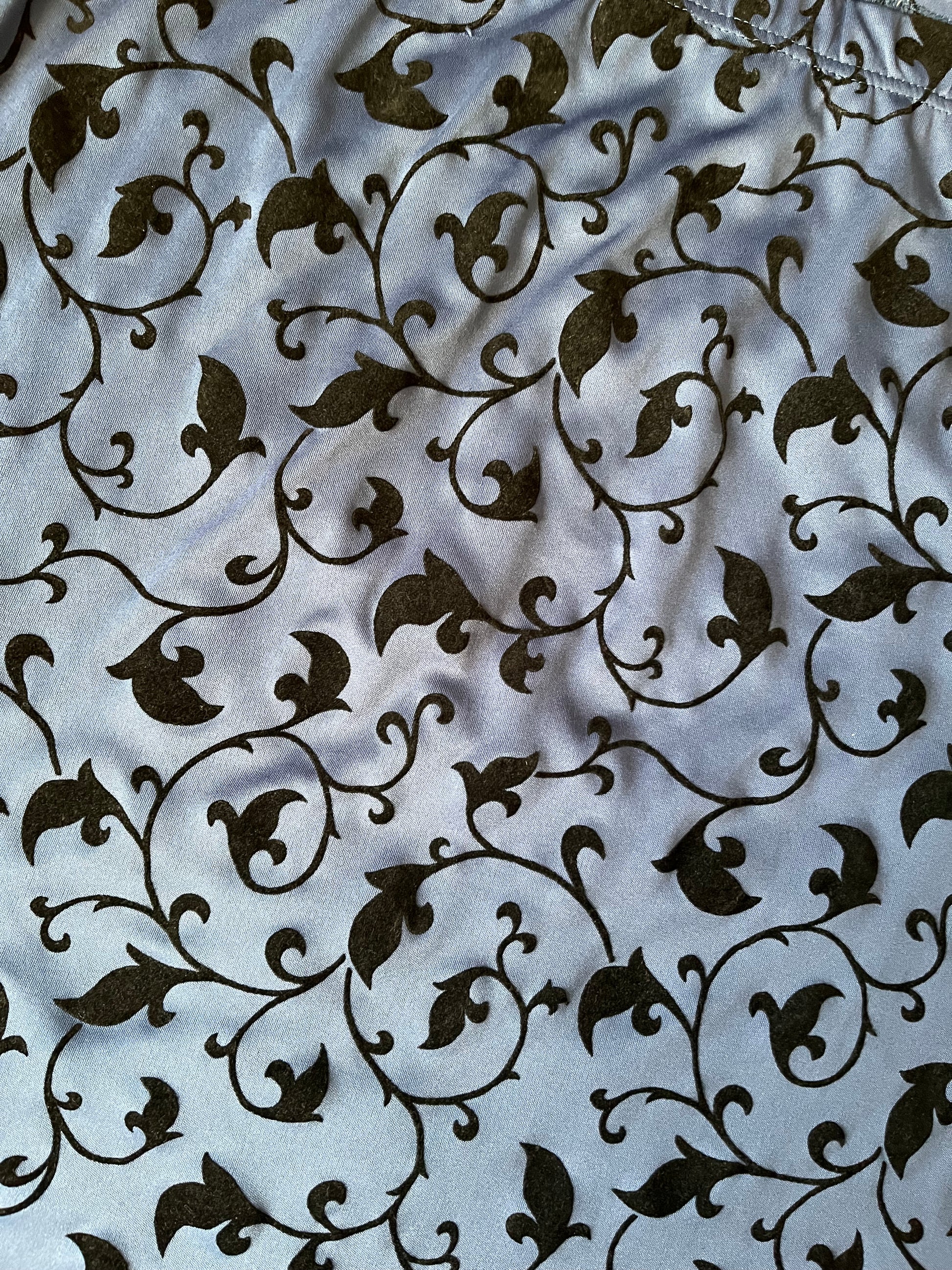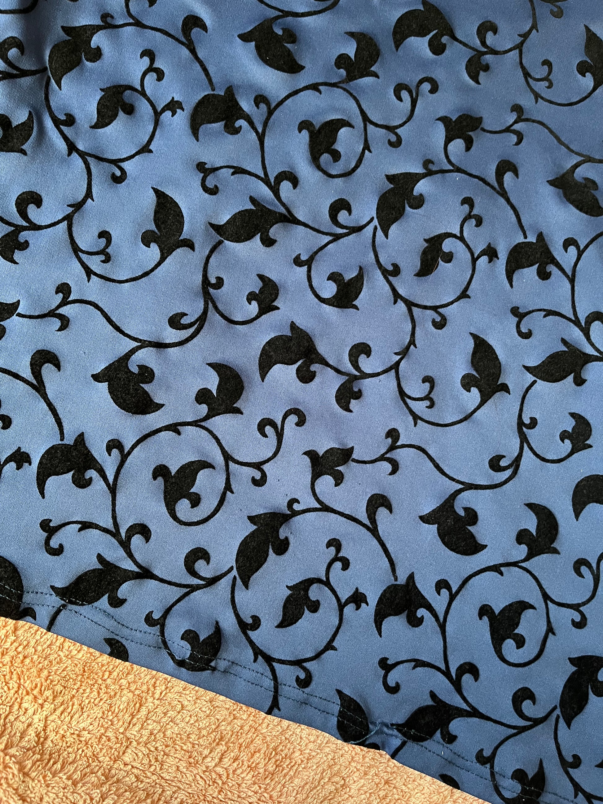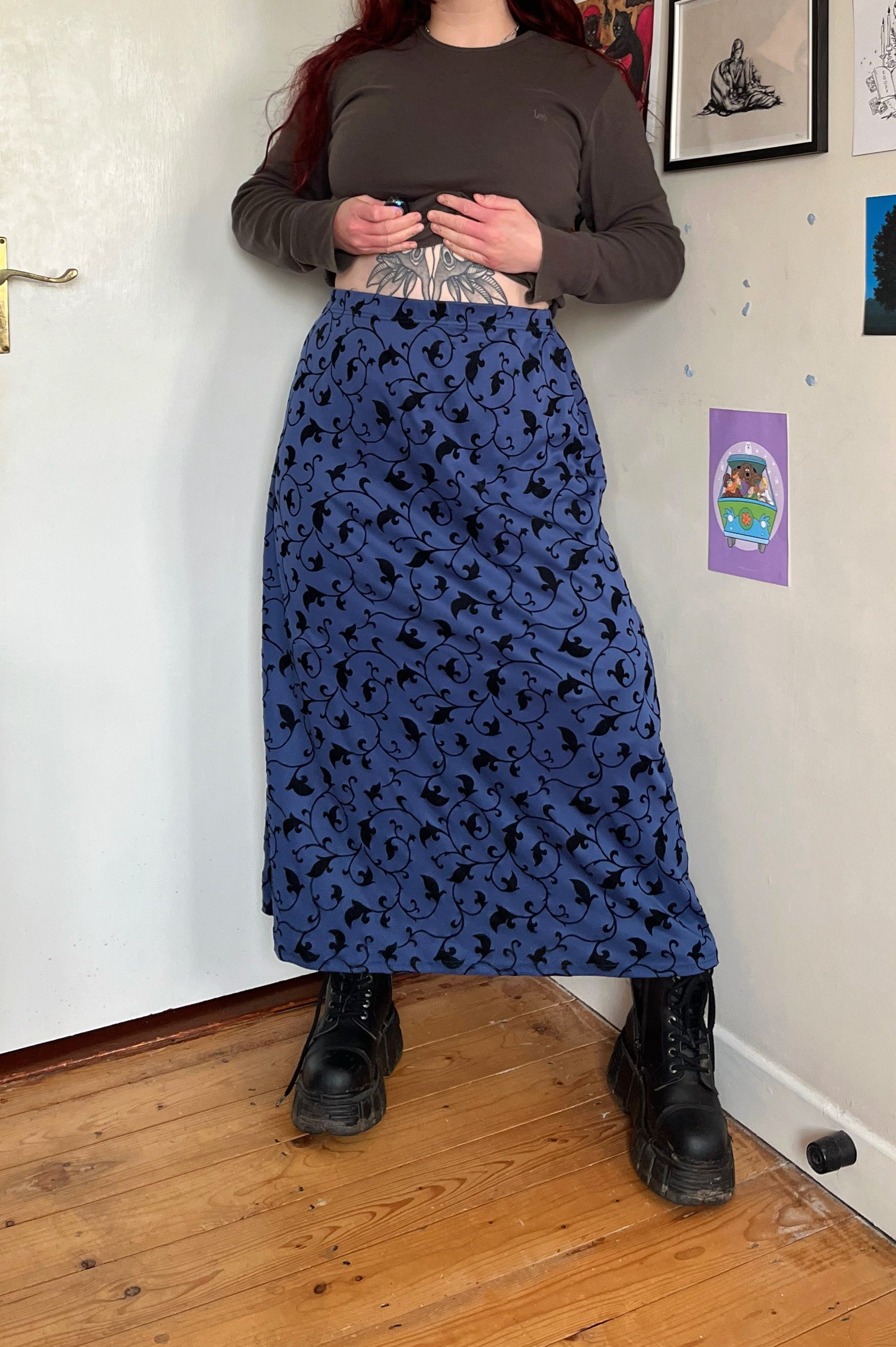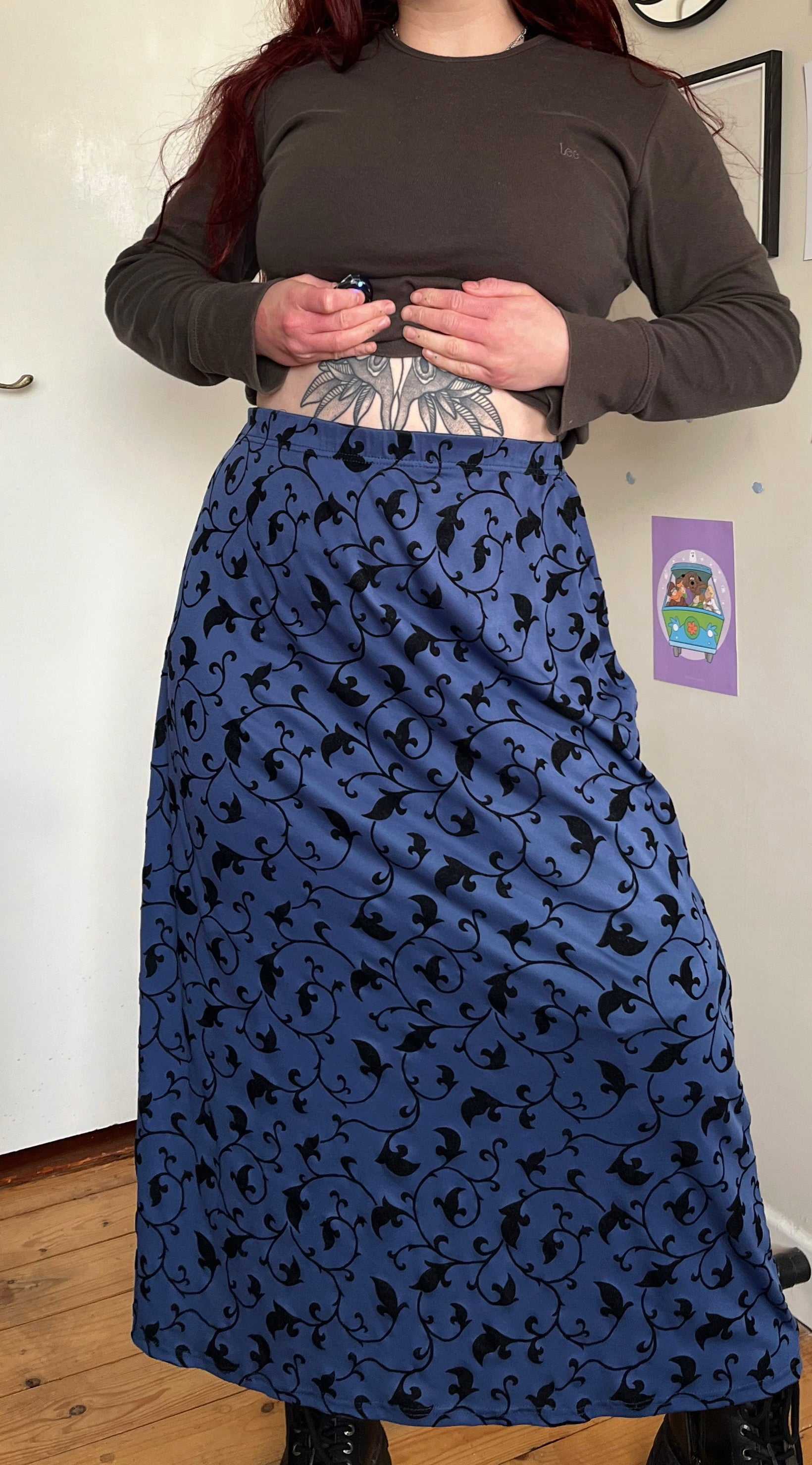 Gorgeous 1990s blue maxi skirt! This has a sttetchy waist and a filigree design in velvet all over. Would best fit a UK 16-20 as the waist is stretchy.