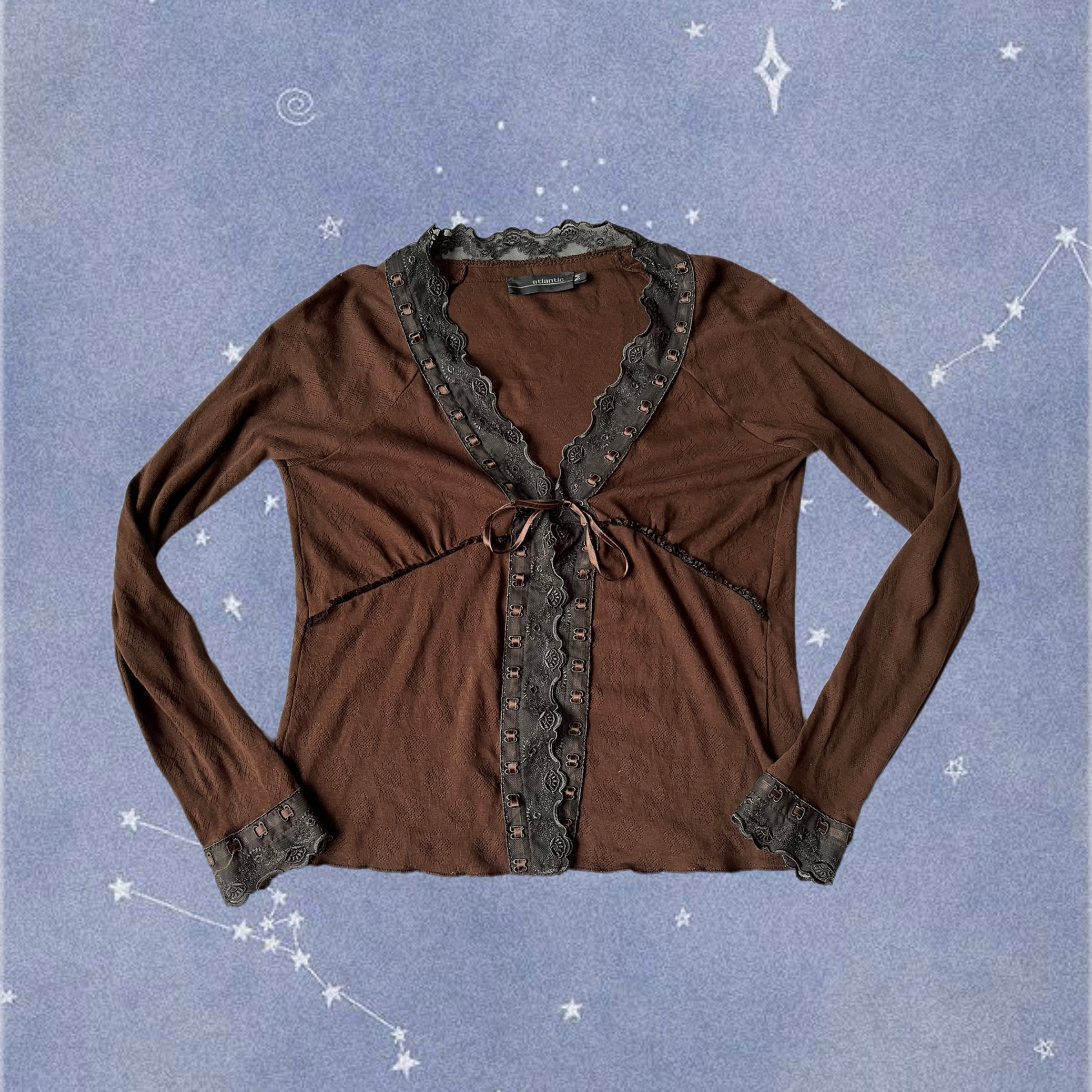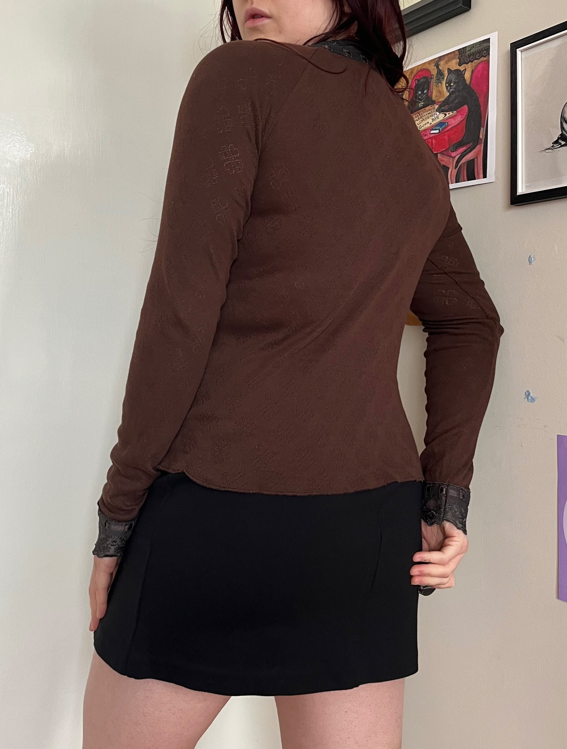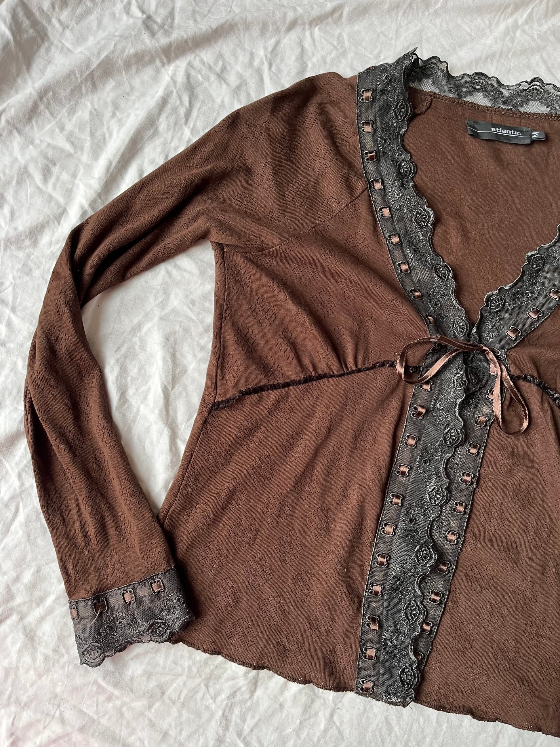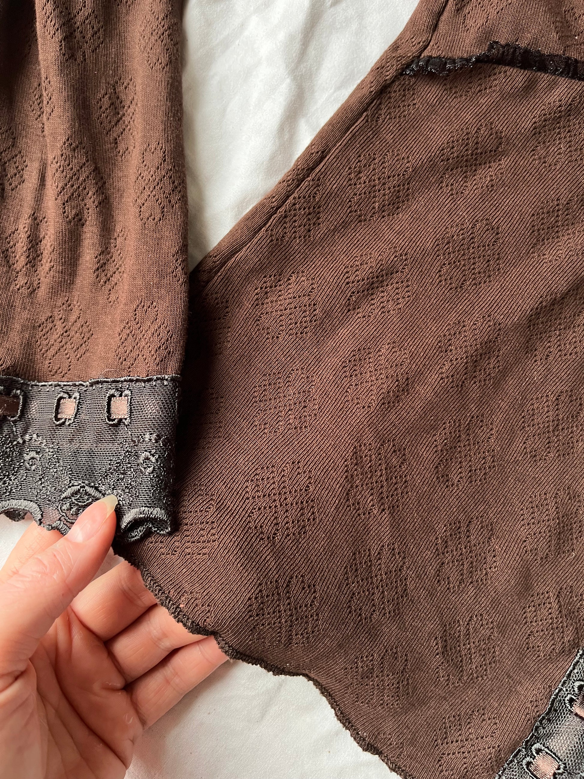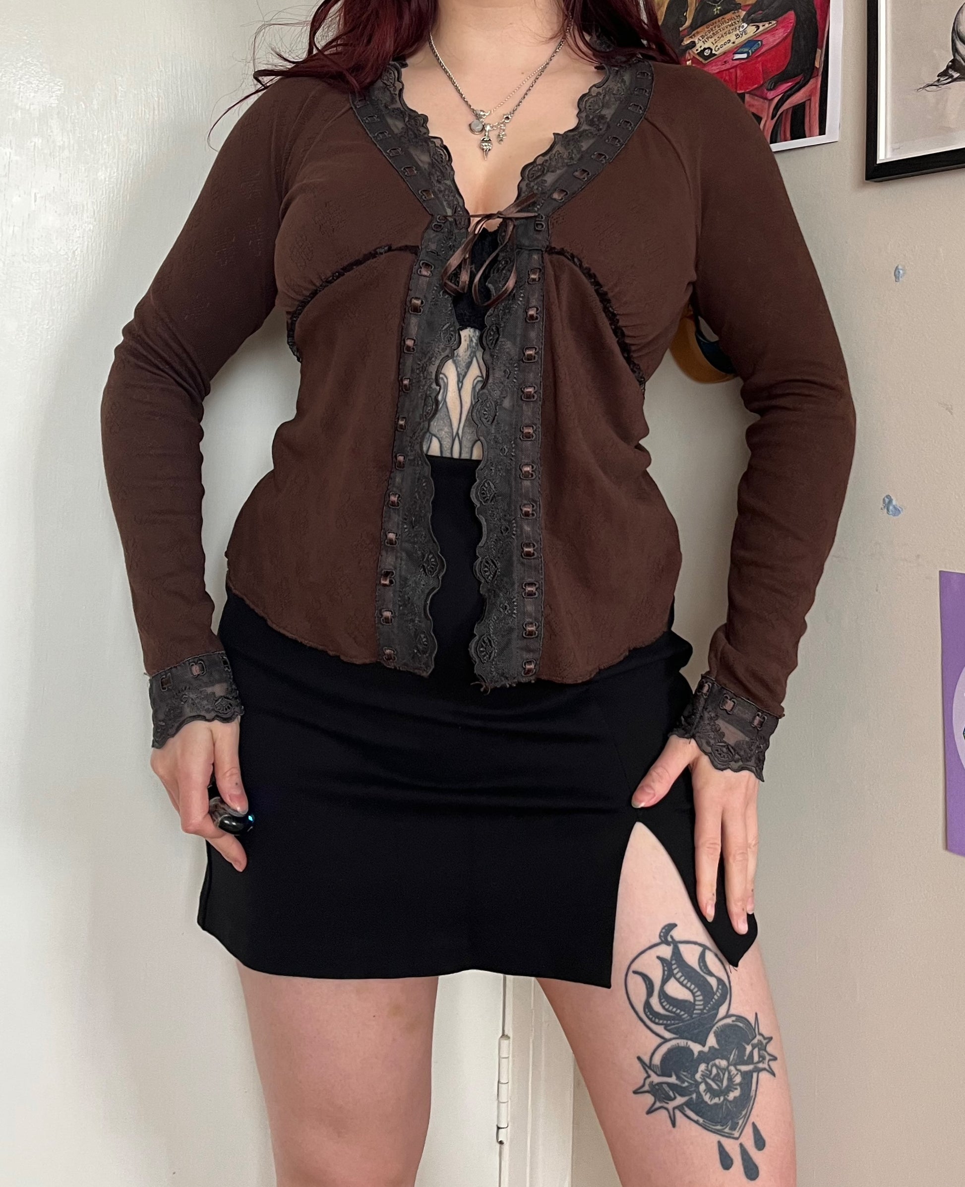 Beautiful 1990s brown babydoll tie front top! This has a pointelle design with lace trim on the front and sleeves.