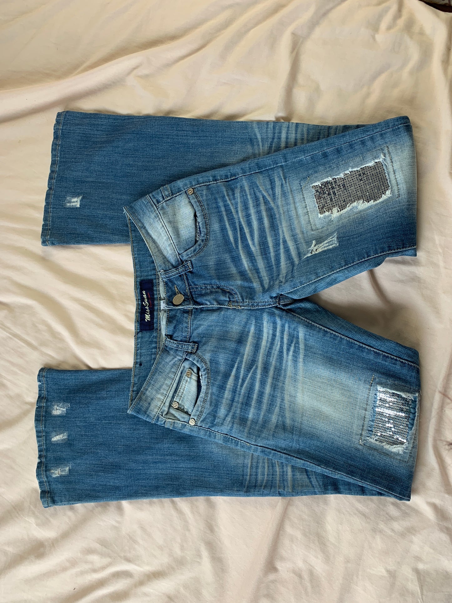 Amazing 00s flared jeans by Miss Swan! These have a low waist (but not super low), distressed and sequin details, and a flared leg. In perfect vintage condition and would best fit a UK 6 to small UK 8.