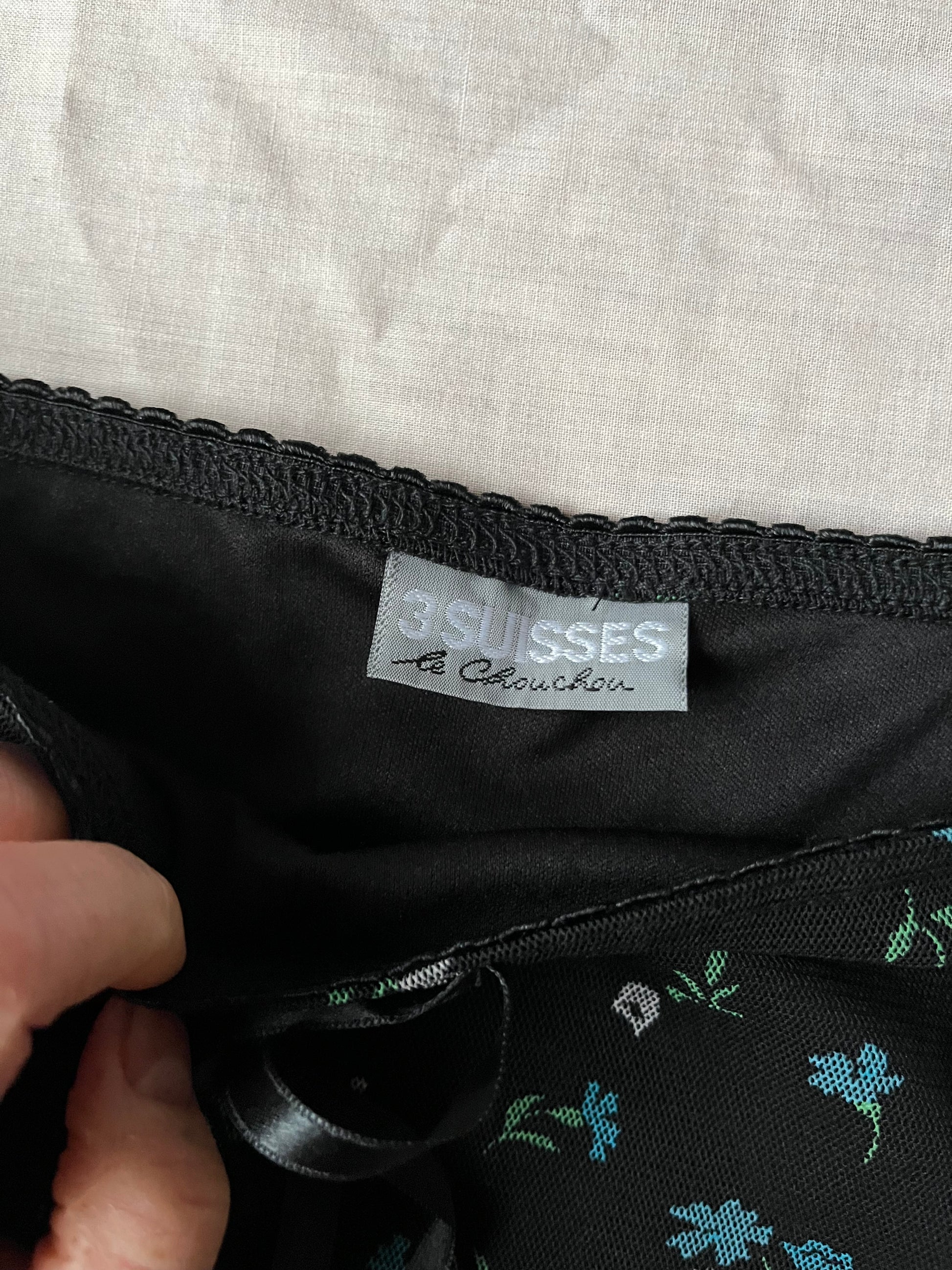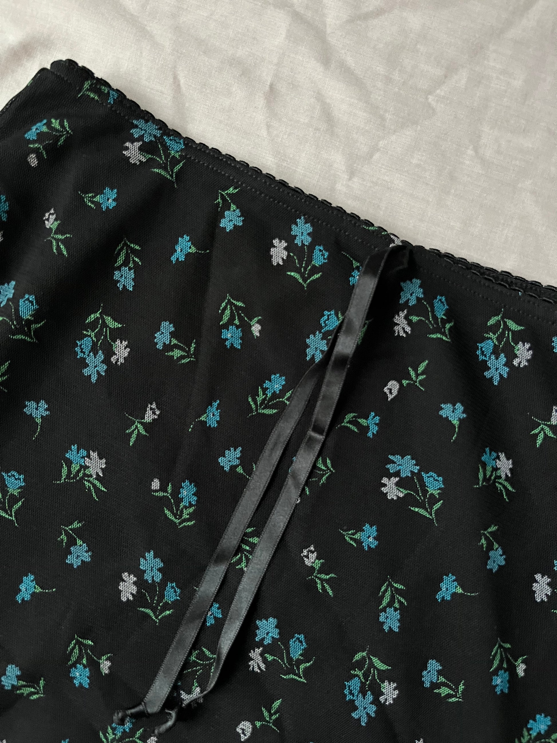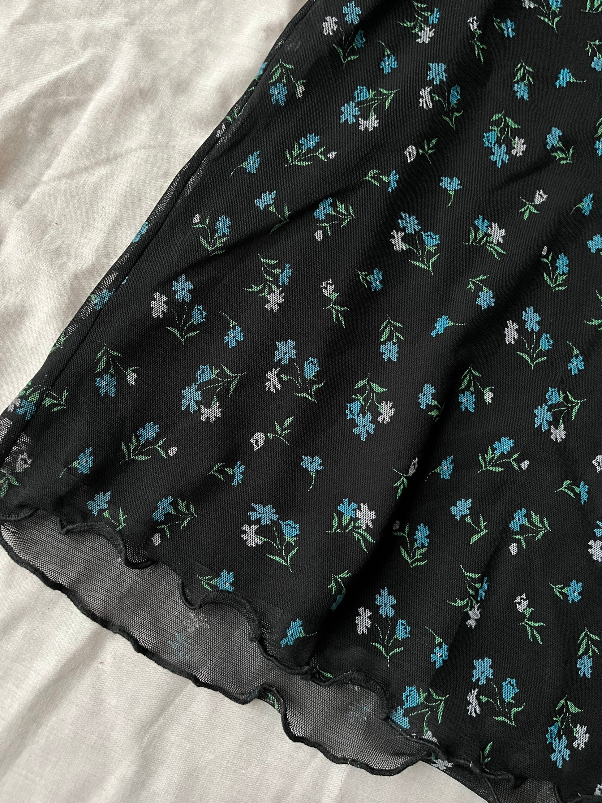2000s black mesh midi skirt with blue floral design! Stretchy fit with a flattering shape.