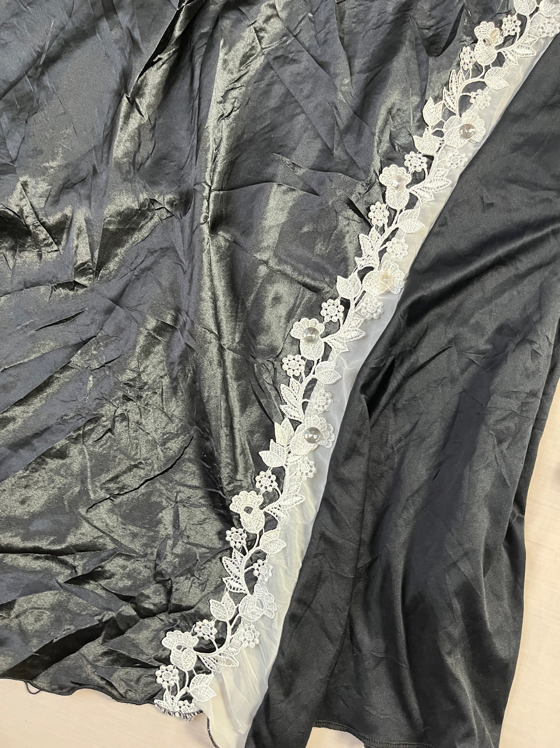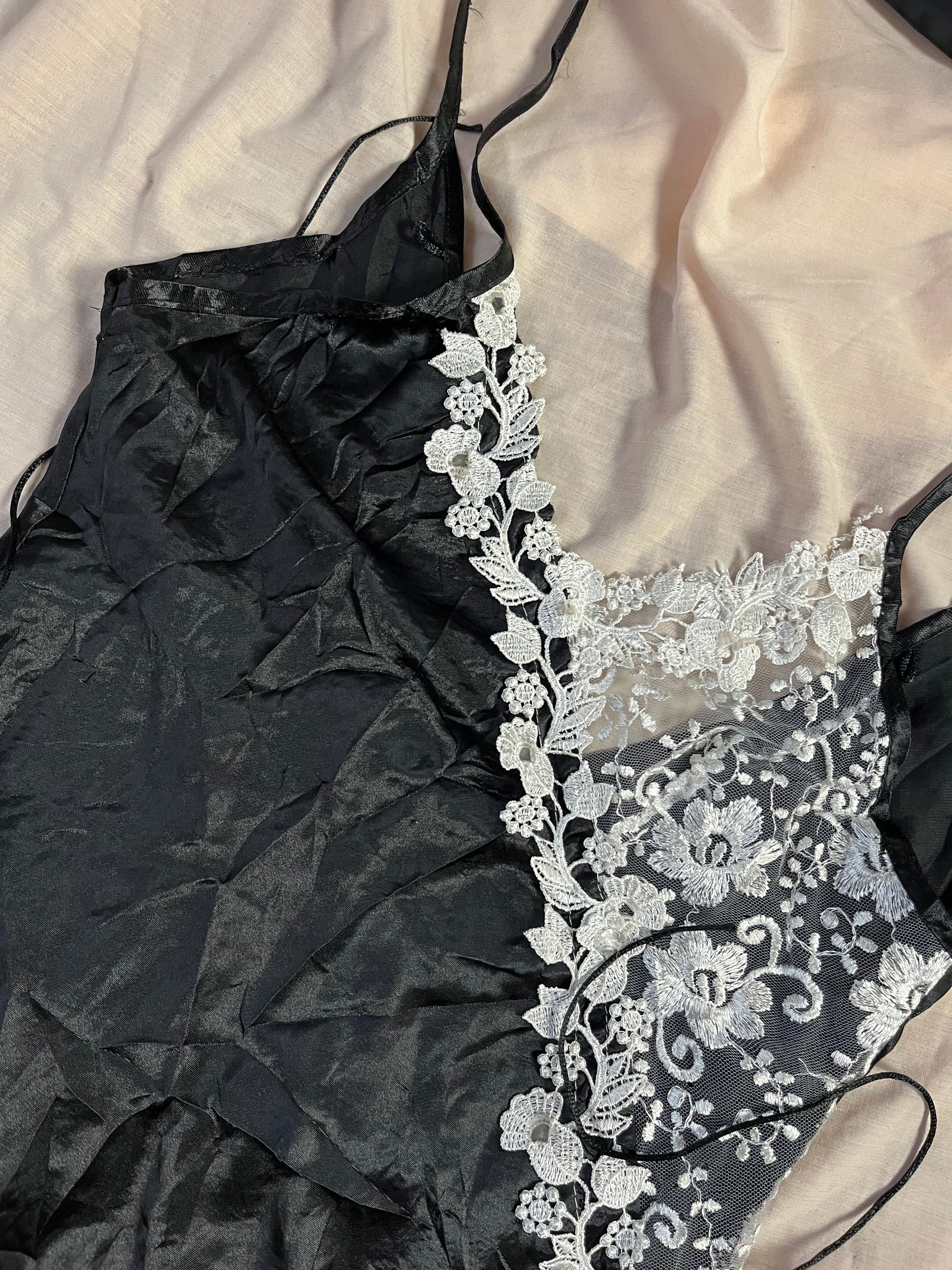 Super pretty 1990s black and white slip dress! Black satin material with a white lace design.