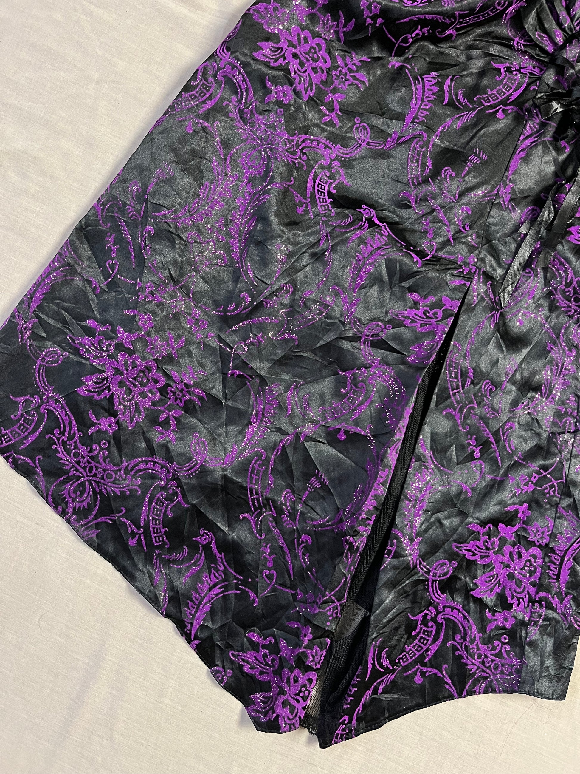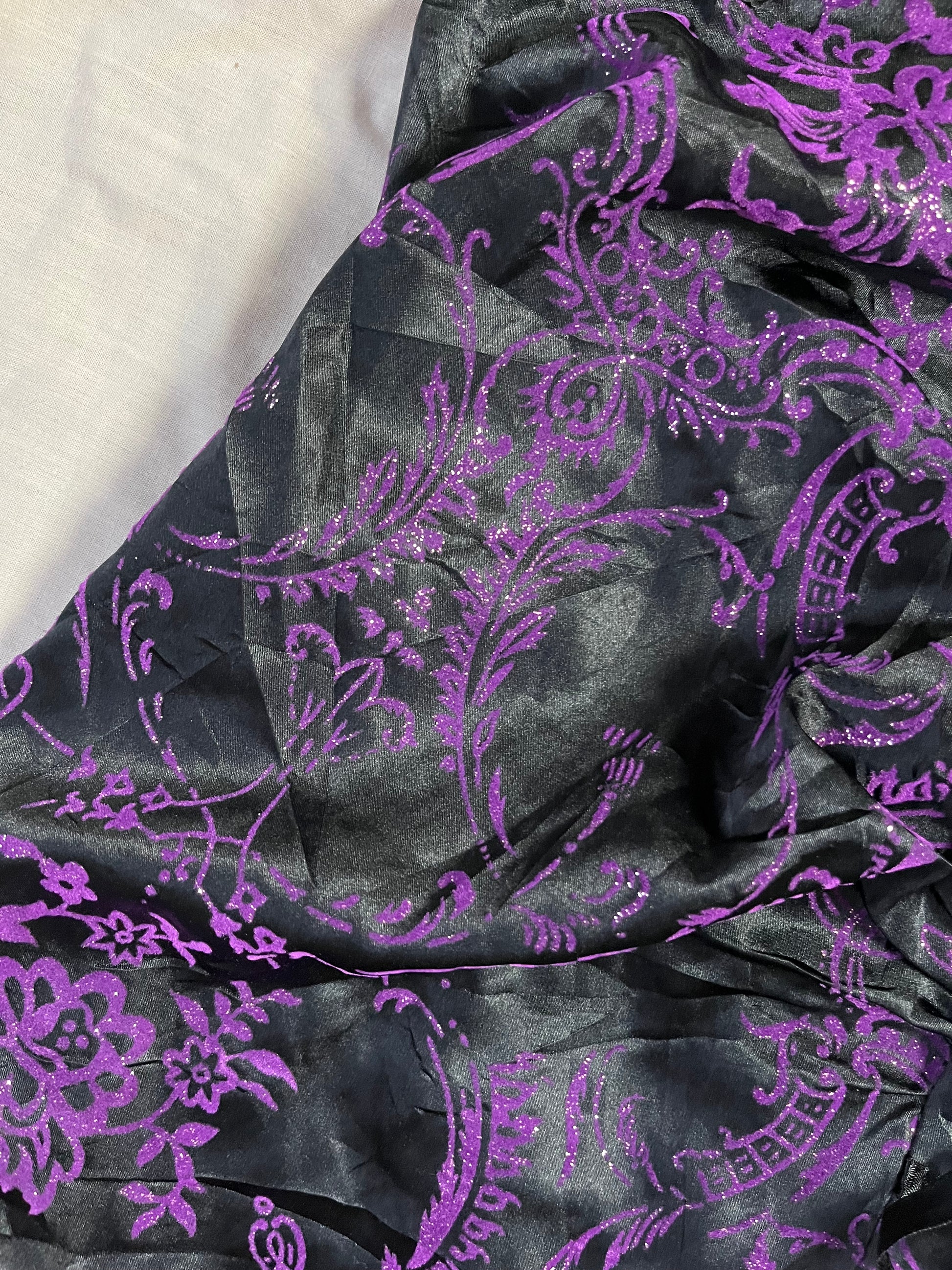 Beautiful 2000s black halter dress with a glittery purple floral velvet design!