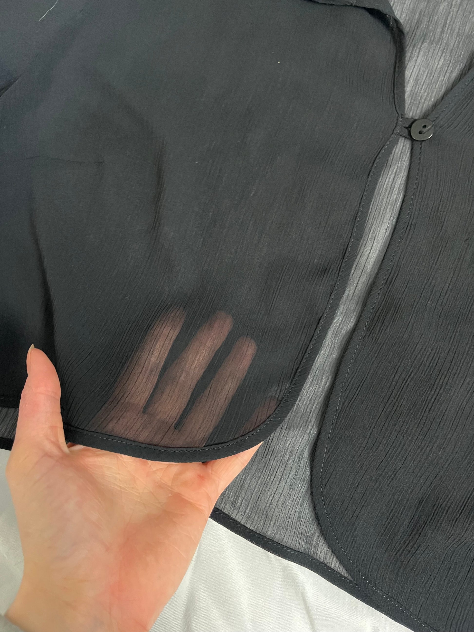 2000s black mesh top! This has a single button on the front and long sleeves, This can fit a UK 10 oversized or a UK 12-14 more fitted.