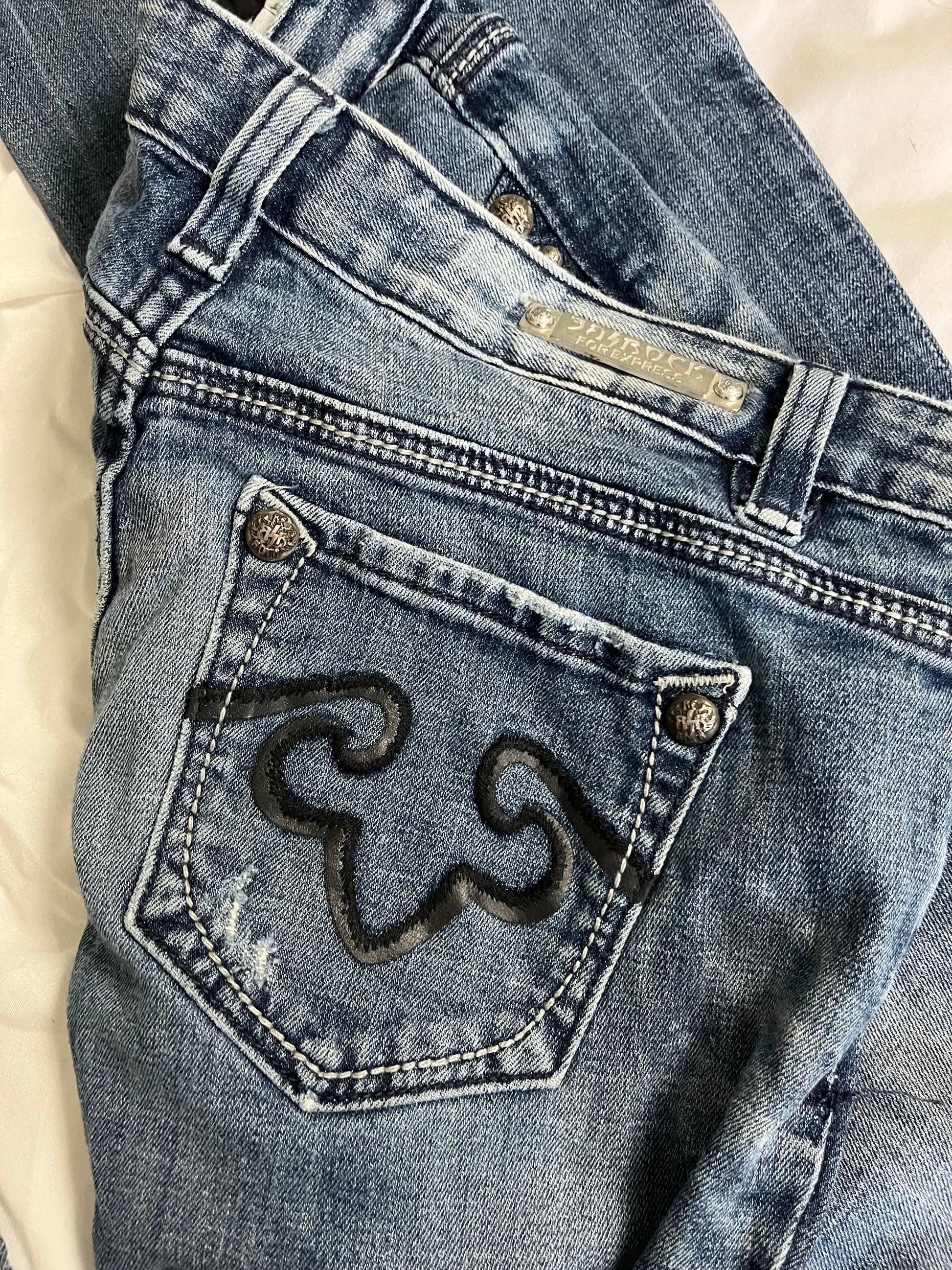 2000s flared leg jeans by Rock for Express! These have a flared leg, low waist and details on the back pockets.
