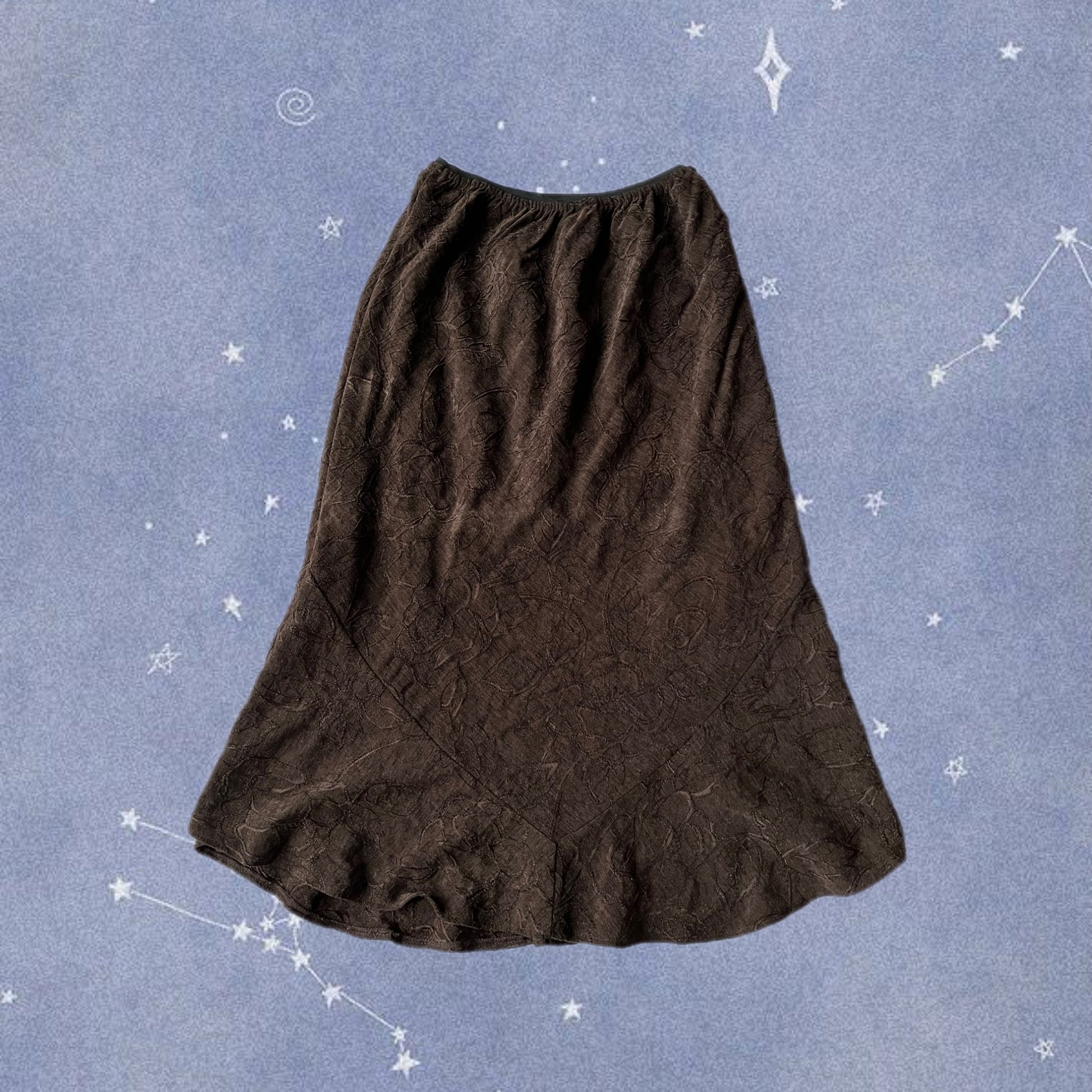 Amazing 1990s brown maxi skirt! This has a floral design and a stretchy waist.