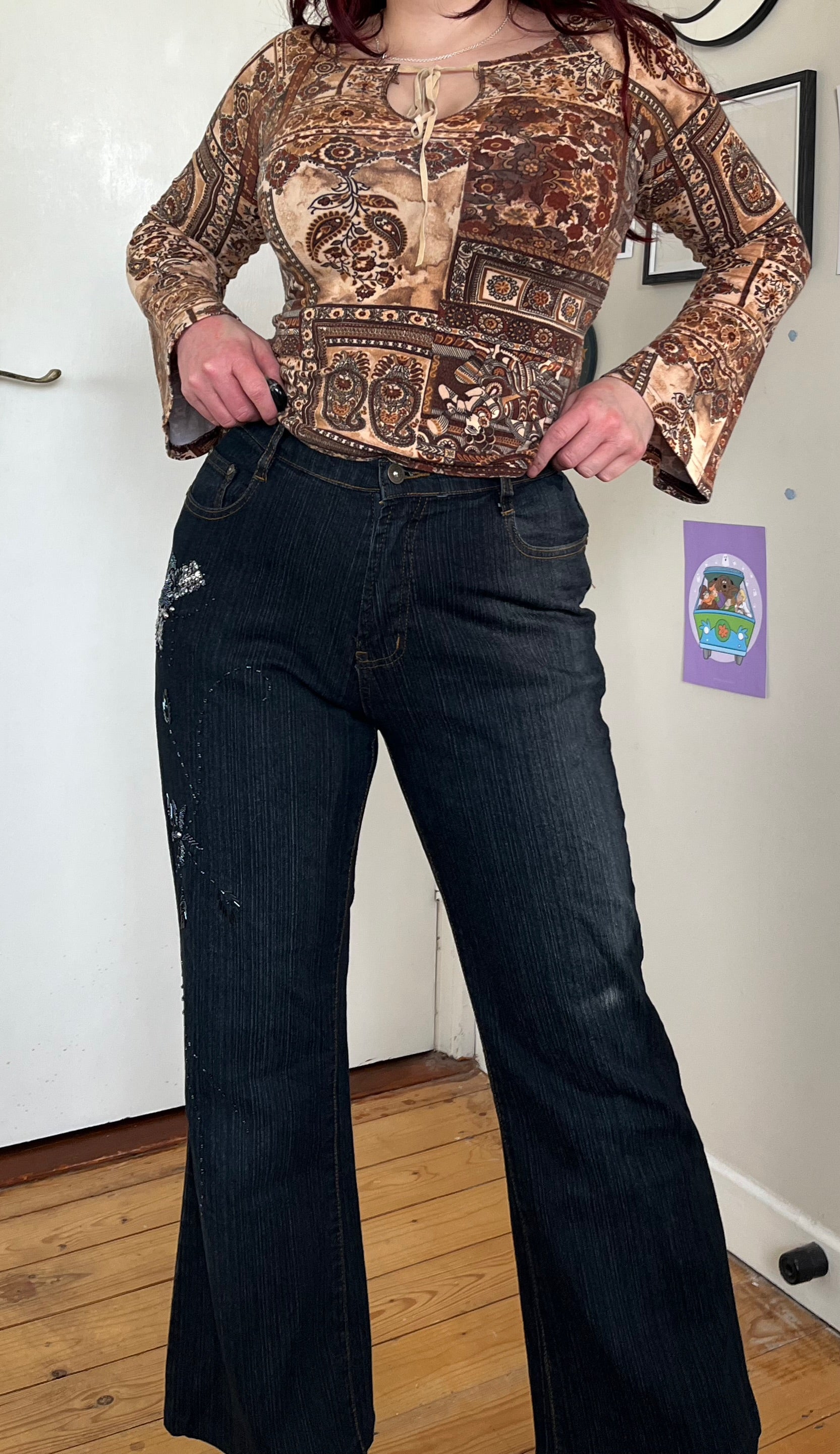 The most beautiful 1990s dark wash striped jeans with sequin butterfly embroidery on the leg! These have a slight flare to them and a high waist. Super flattering!