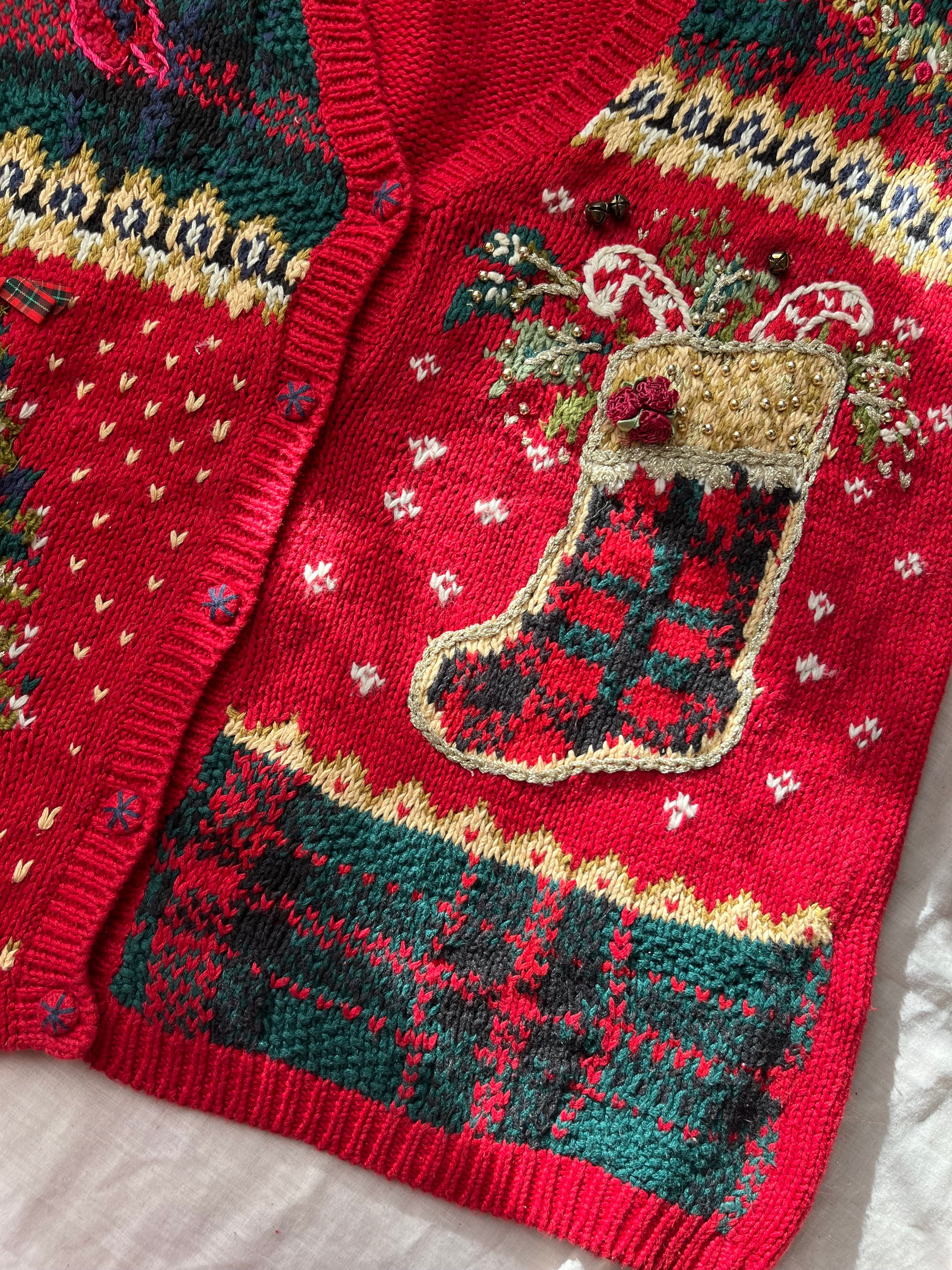 1990s red festive cardigan! Features a button up front and a design of winter scenes on the front, including a stocking, bells, a wreath, a tree and more.