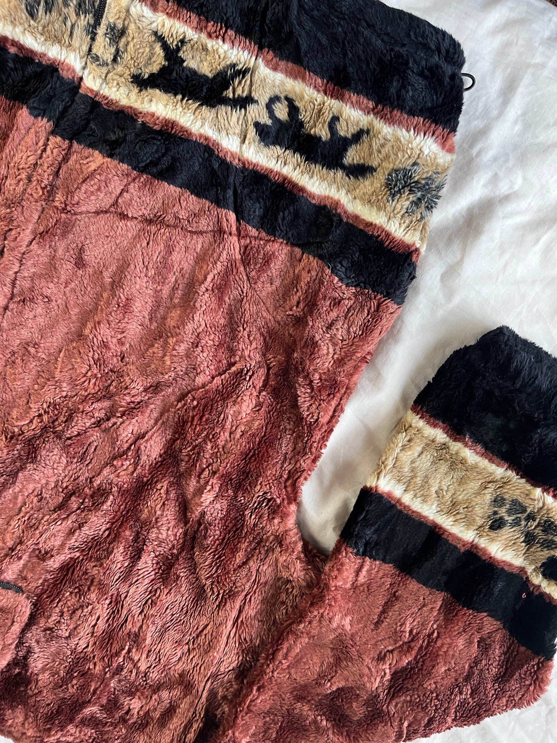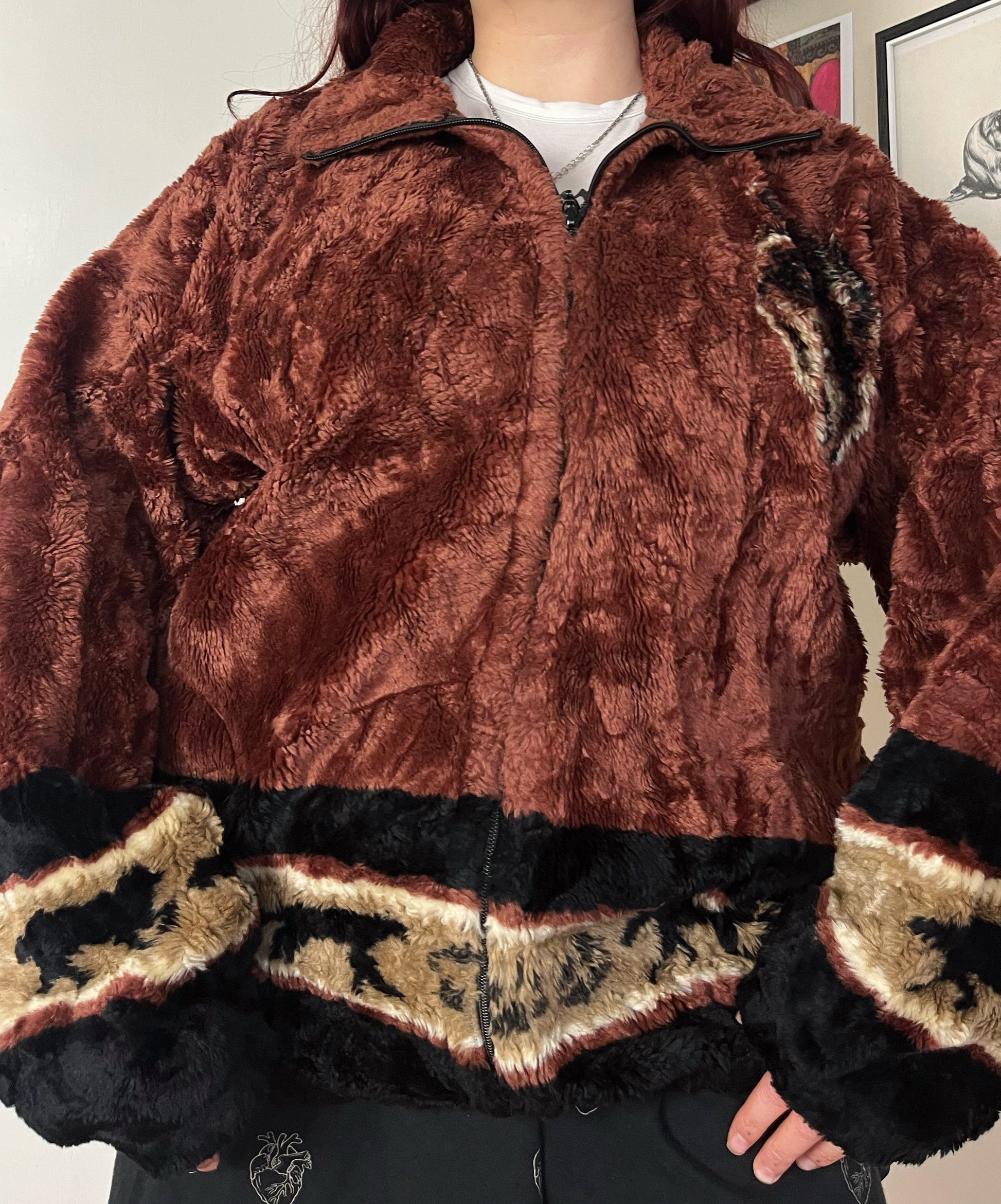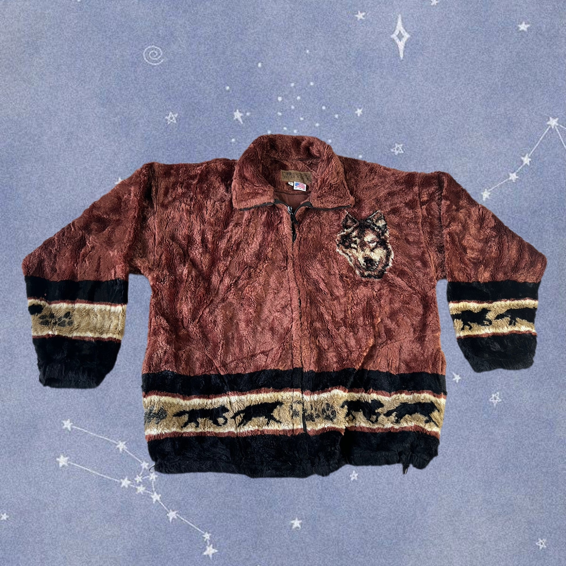 Amazing 1990s made in the USA fleece jacket! Zip up front with a cool wolf pattern all over. This has a broken zip (see photos) which is reflected in the price. In good vintage condition otherwise and would best fit UK 6-18 depending on desired fit.