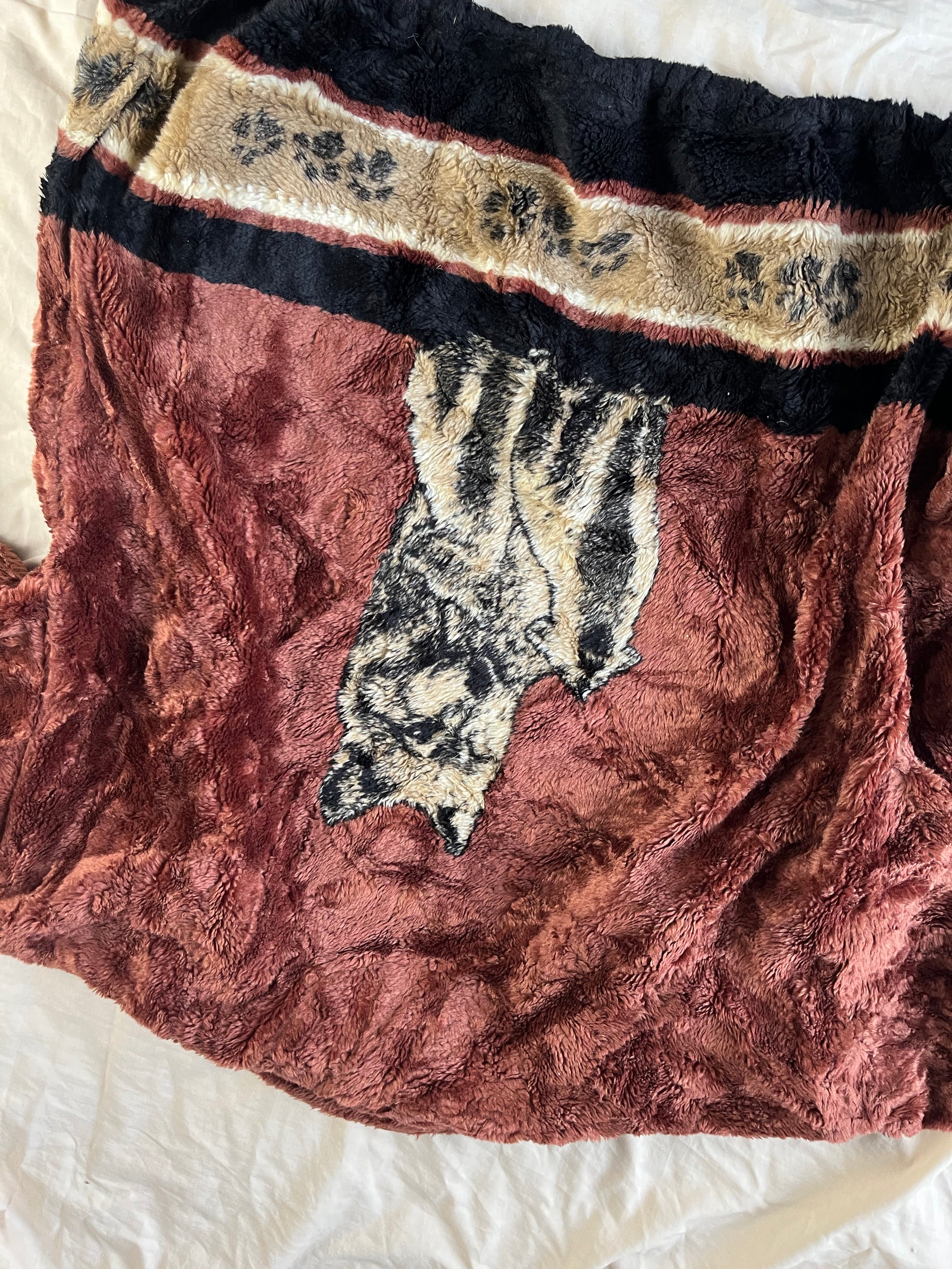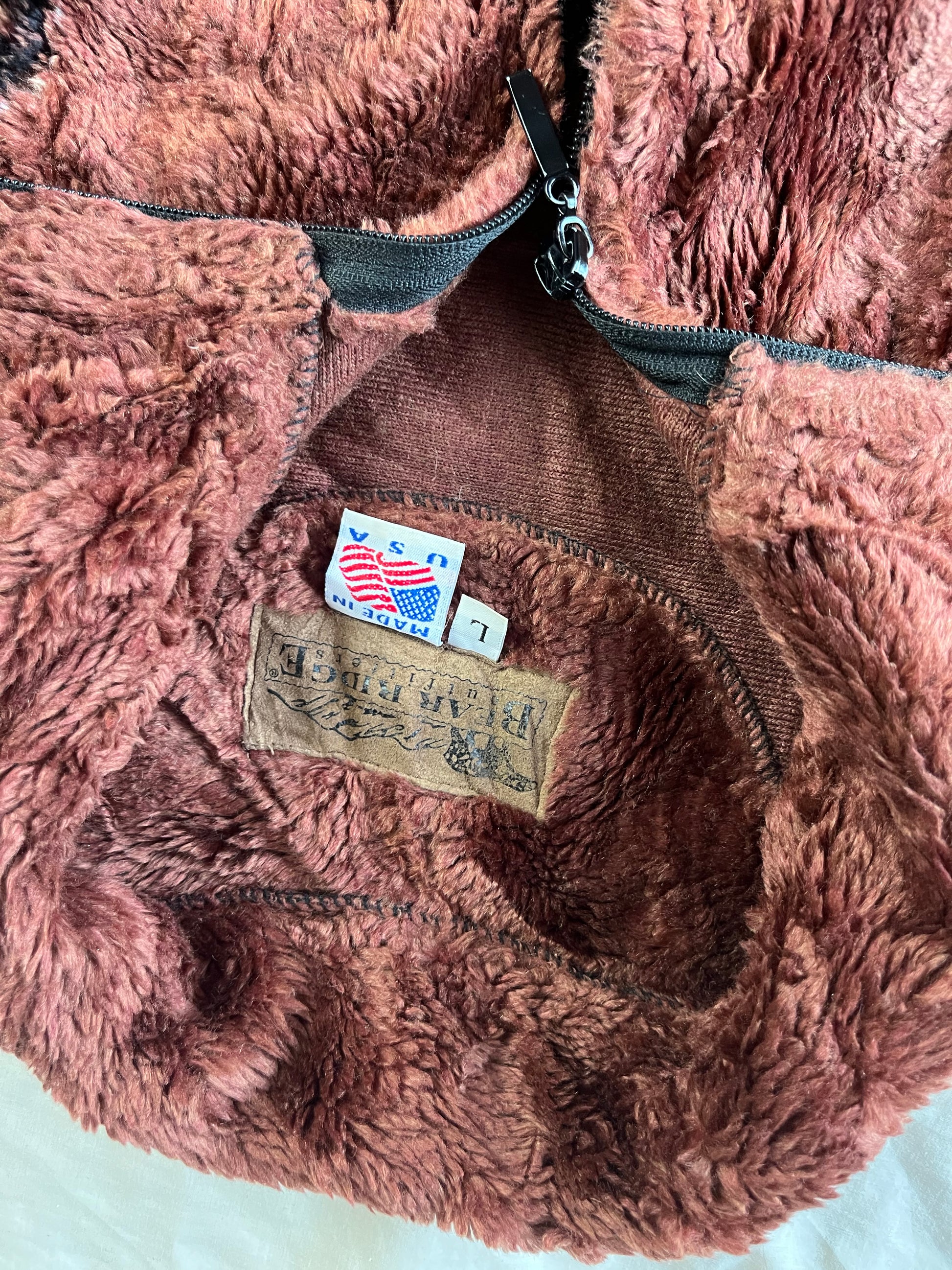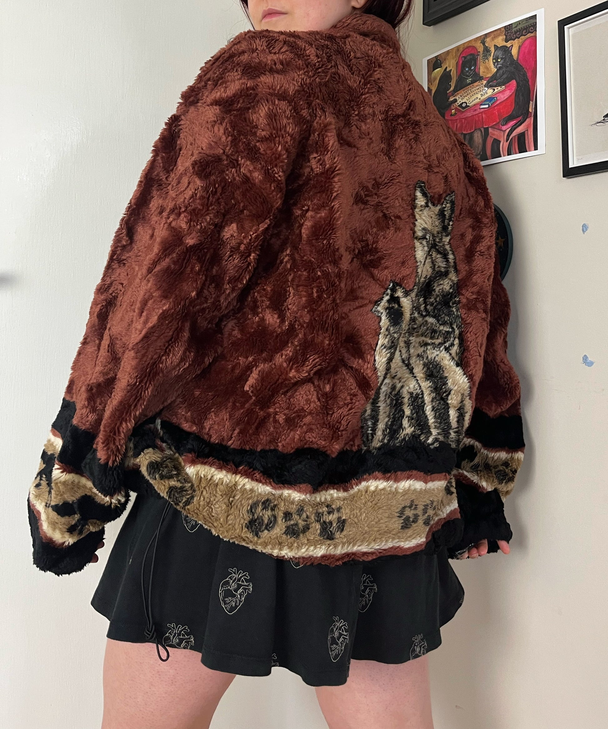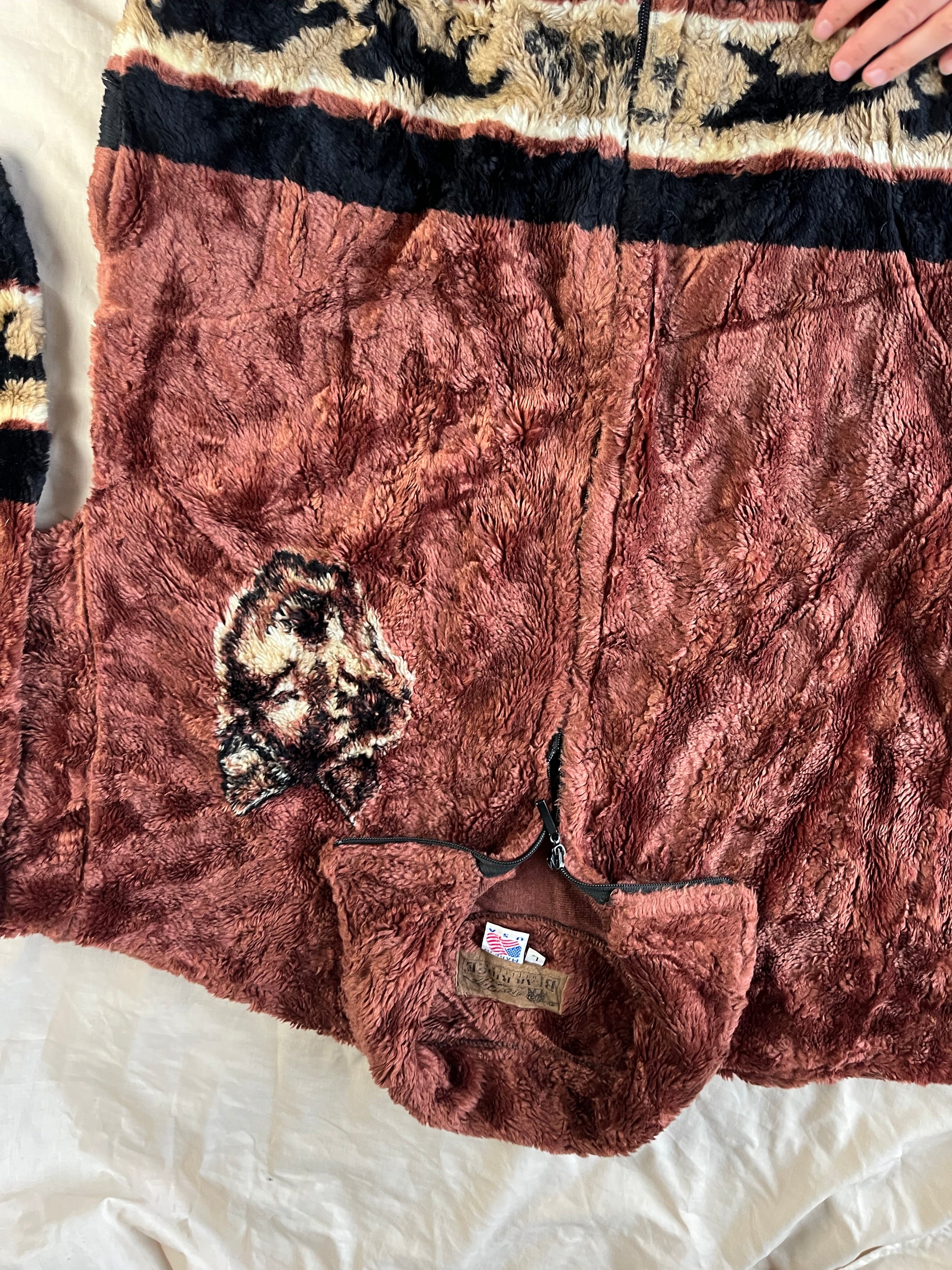 Amazing 1990s made in the USA fleece jacket! Zip up front with a cool wolf pattern all over. This has a broken zip (see photos) which is reflected in the price. In good vintage condition otherwise and would best fit UK 6-18 depending on desired fit.