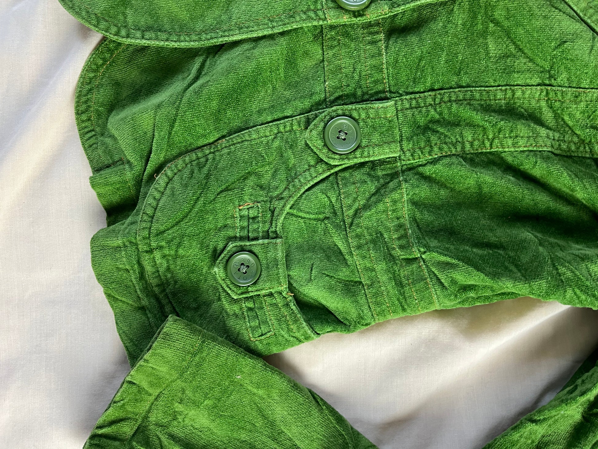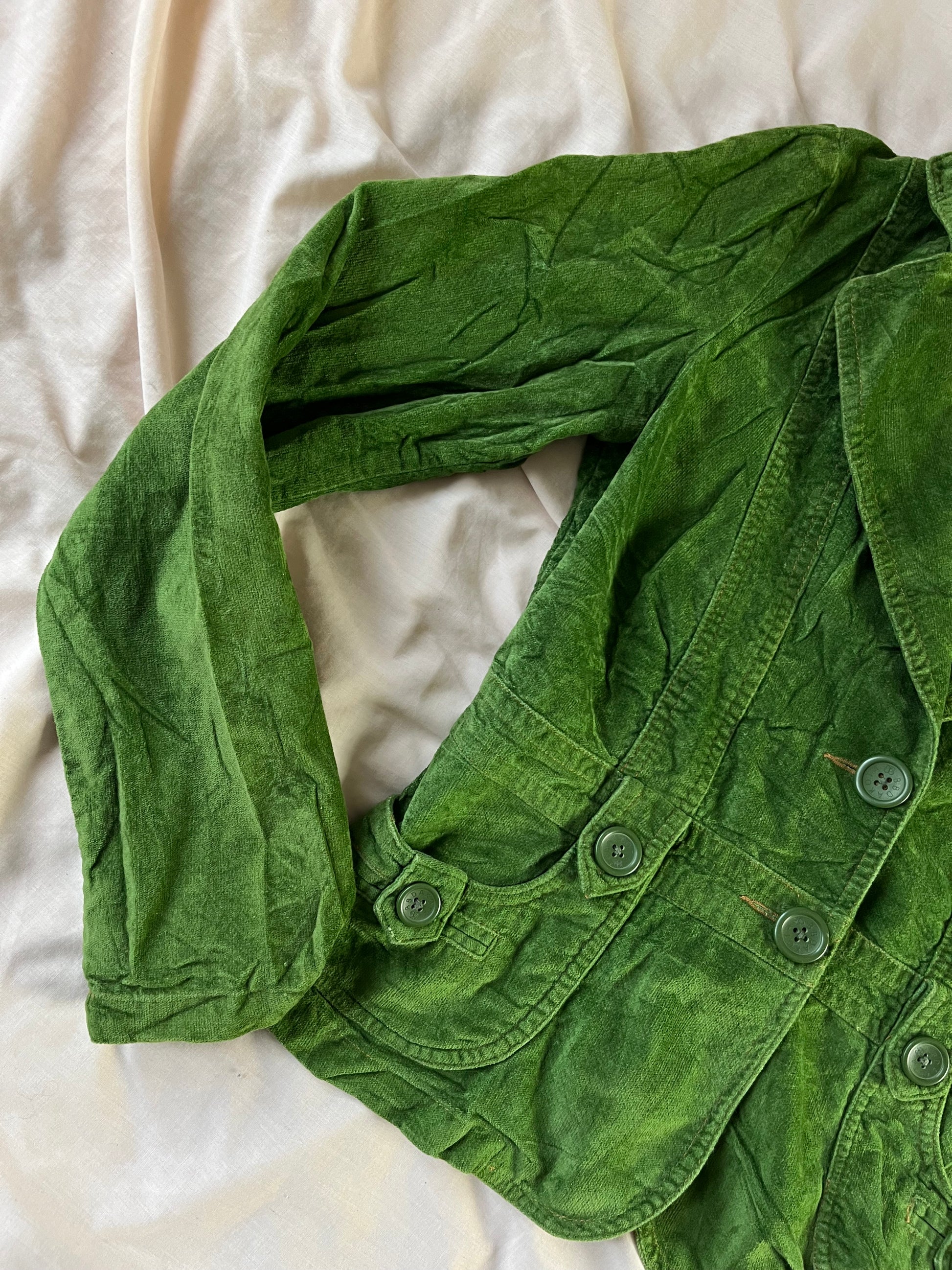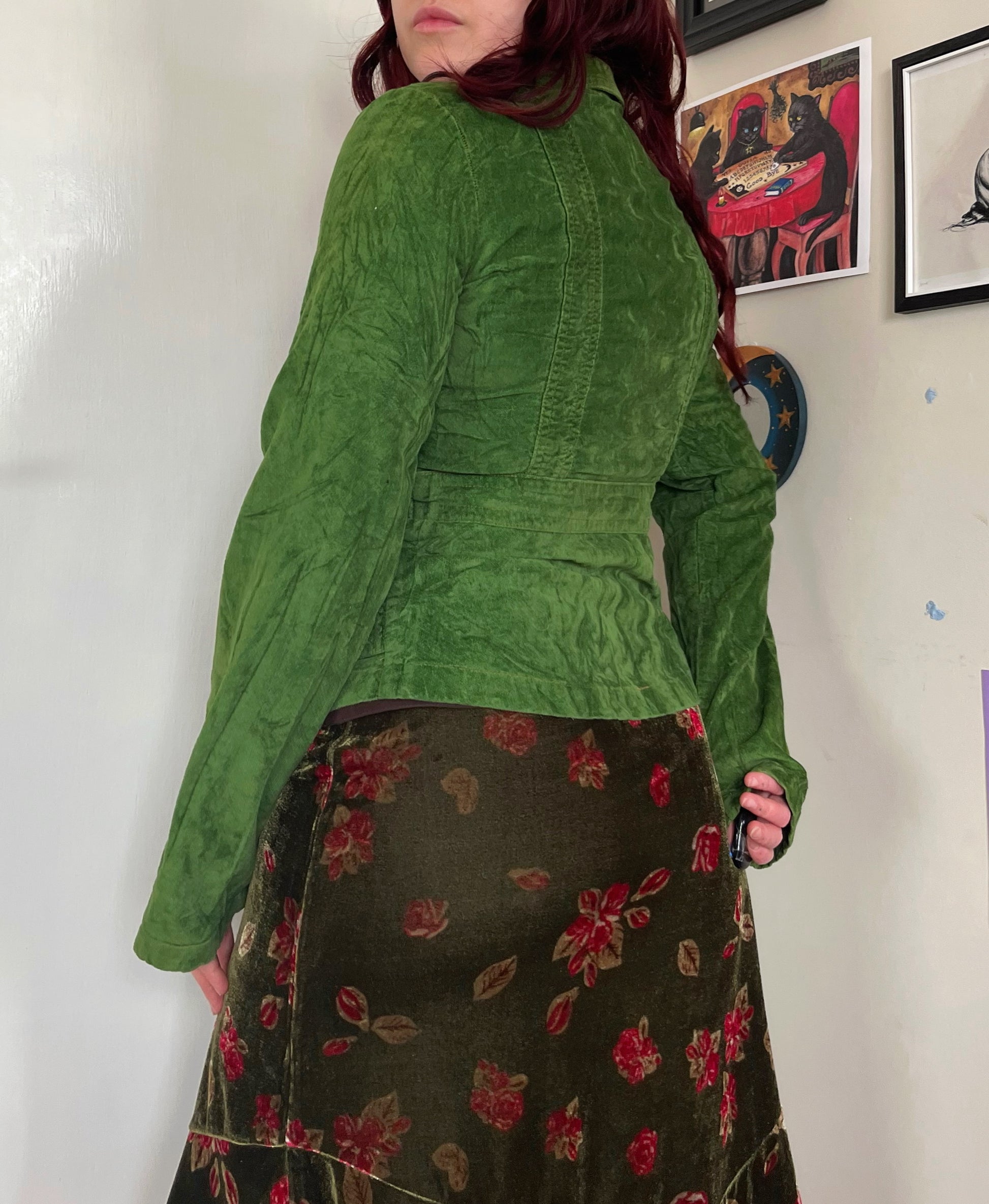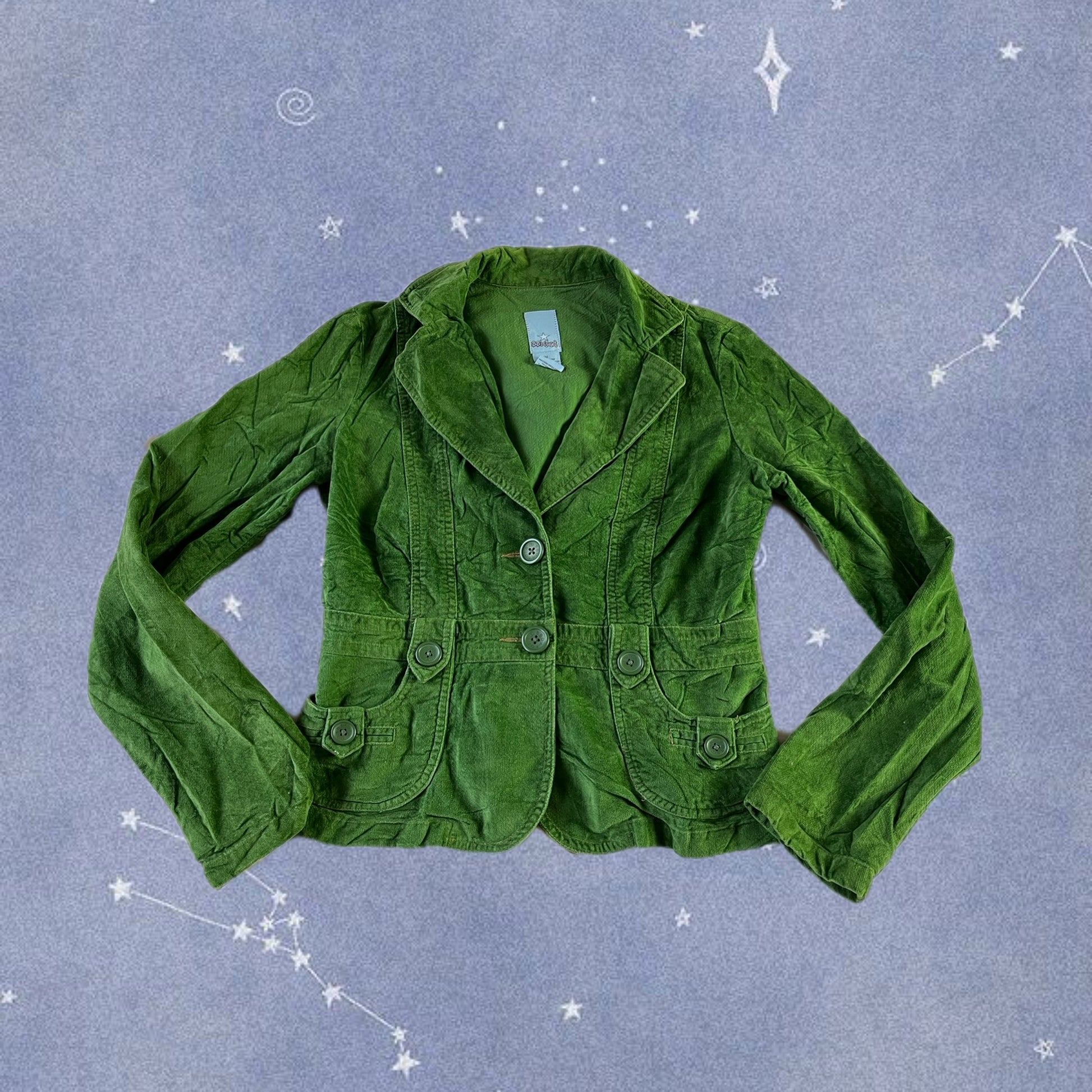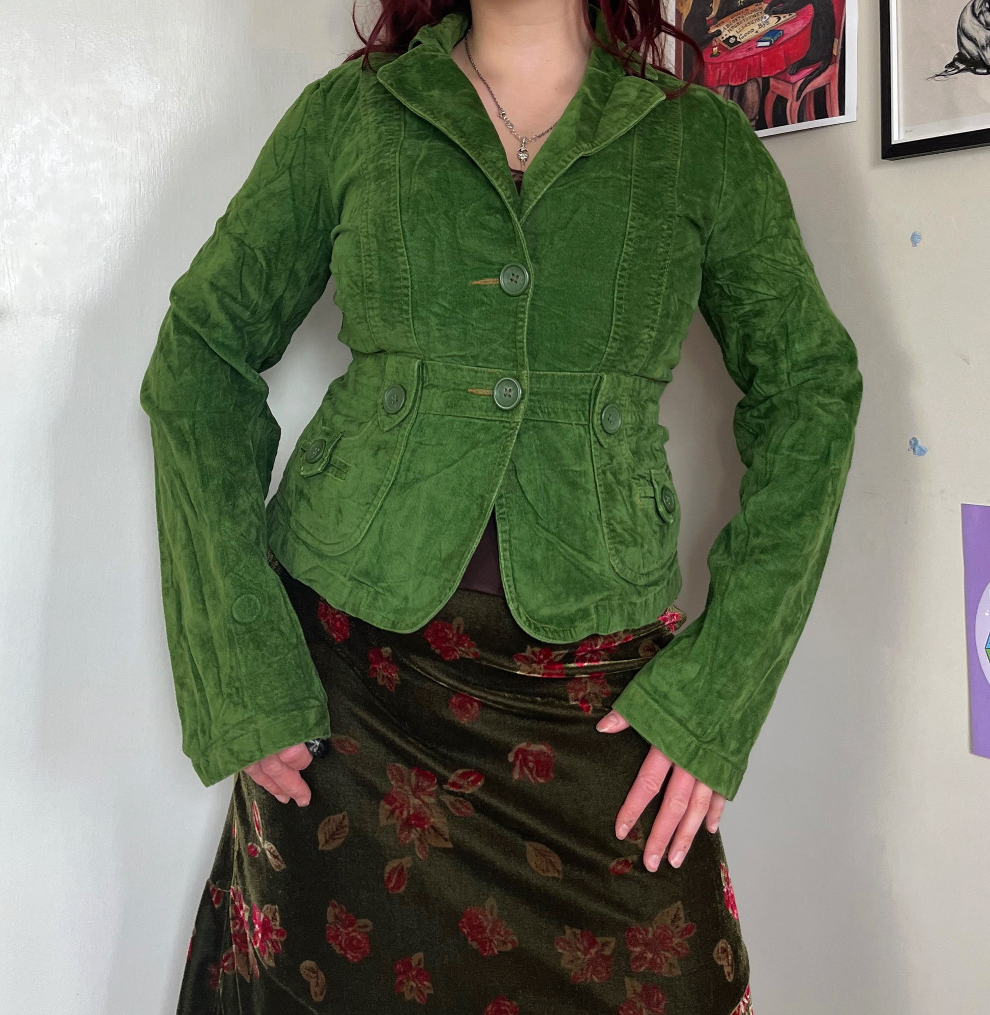 2000s green corduroy jacket! This has buttons on the front and a flattering fit.