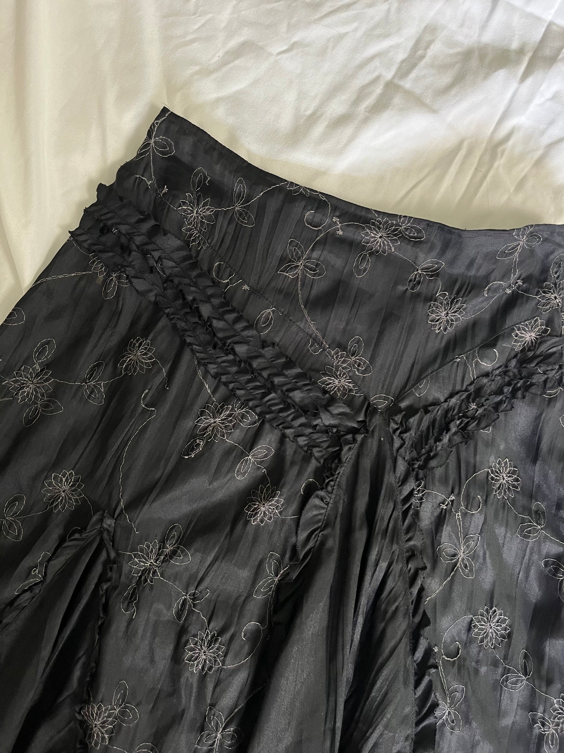 1990s satin like maxi skirt! Zips up at the side and has a floral design.
