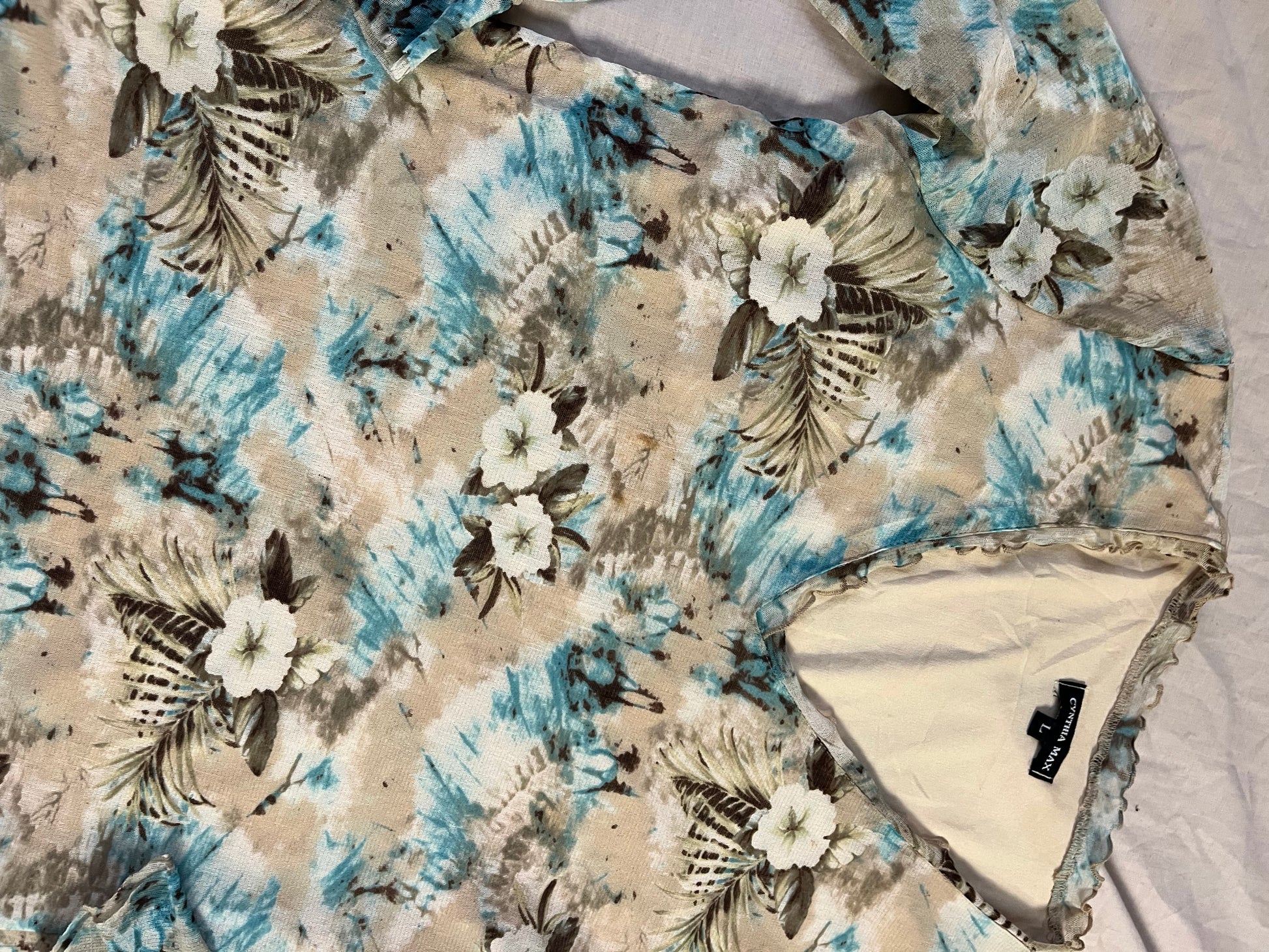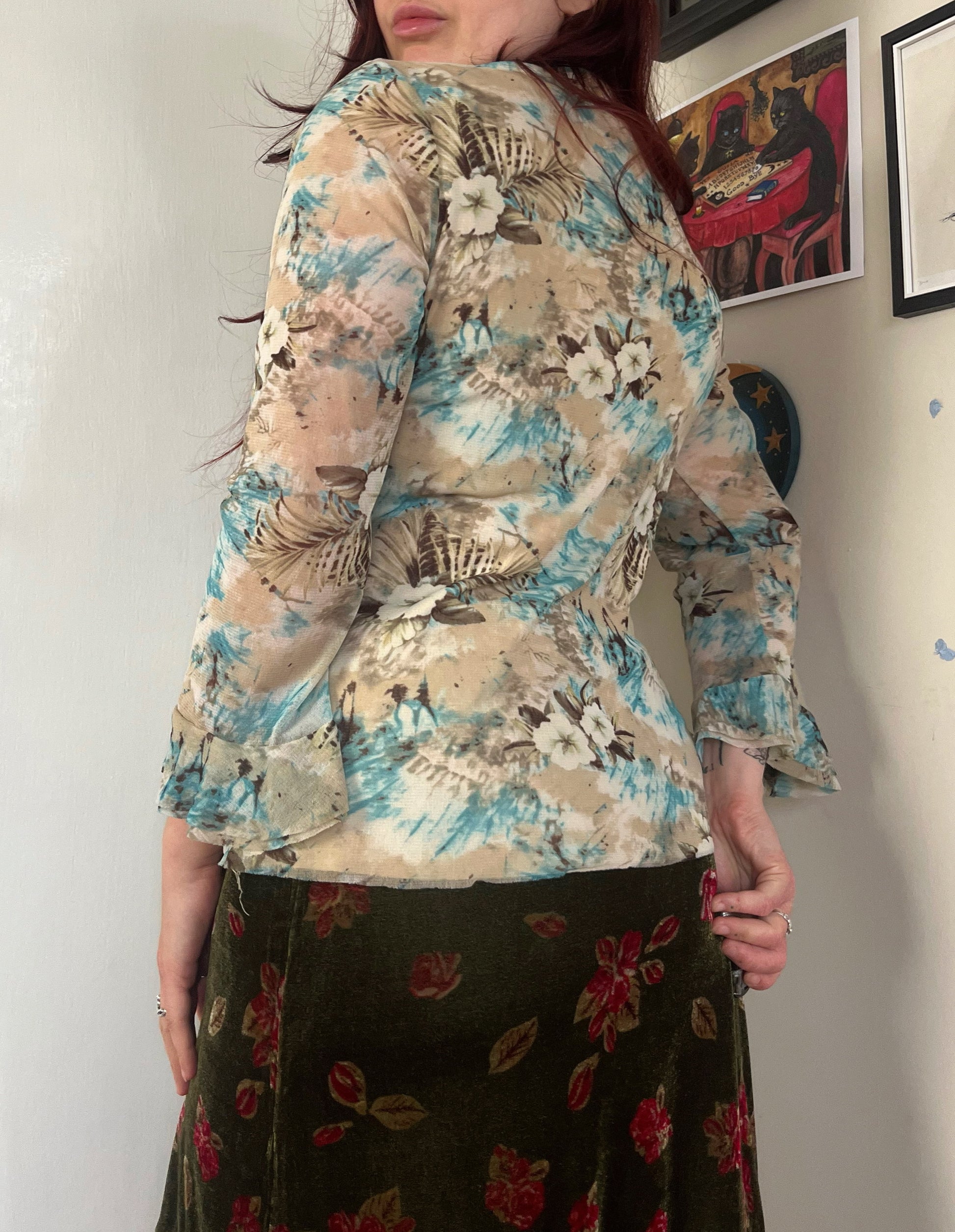 Gorgeous 2000s flared sleeve mesh top! This has a blue and beige floral pattern and a stretchy fit.
