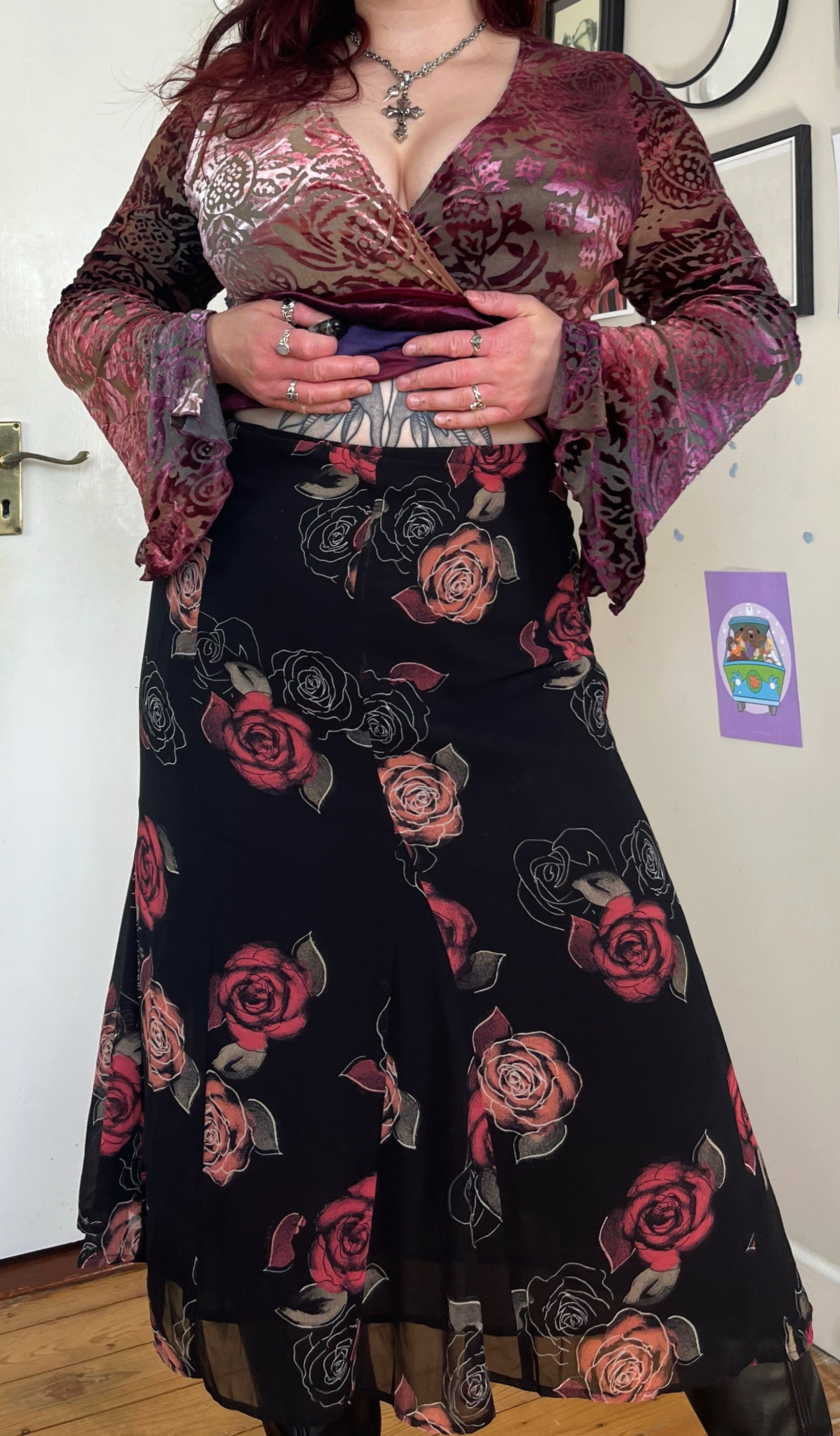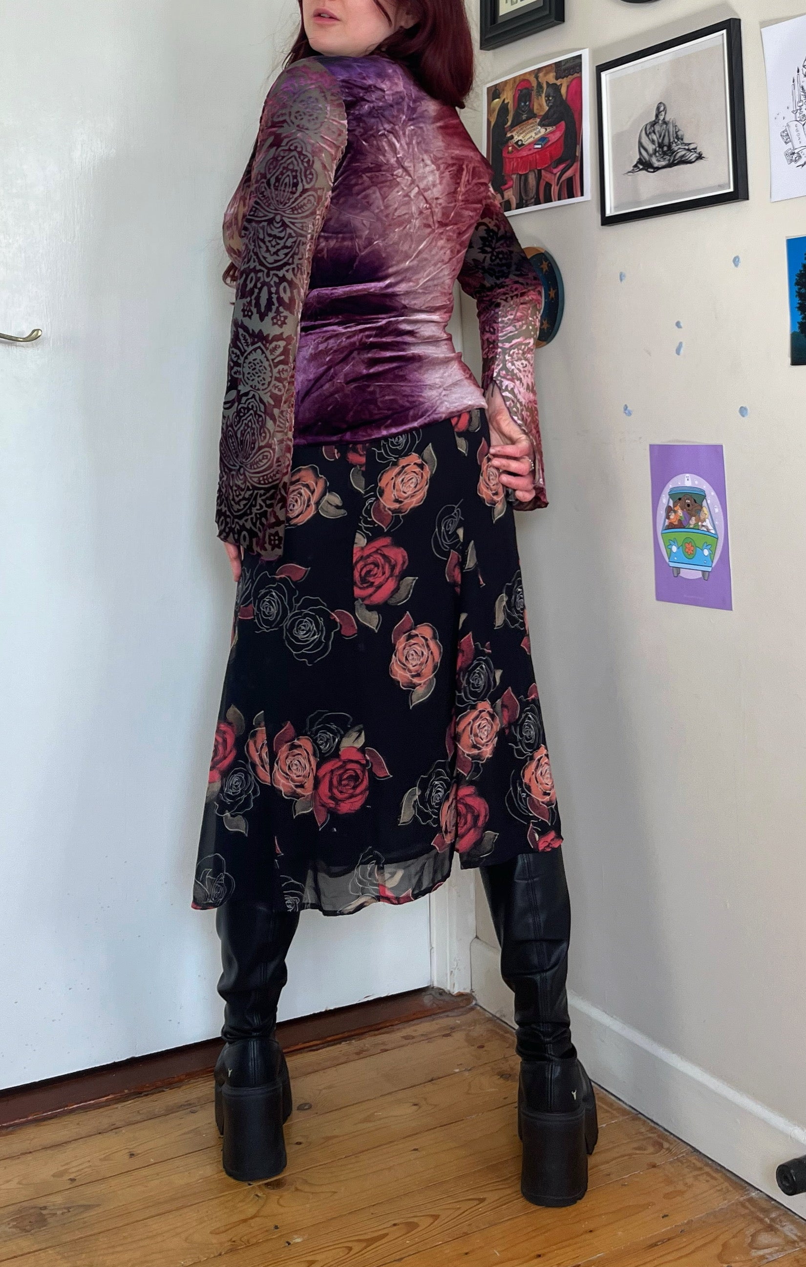 1990s black and pink floral pattern mesh skirt! Zips up on the side.