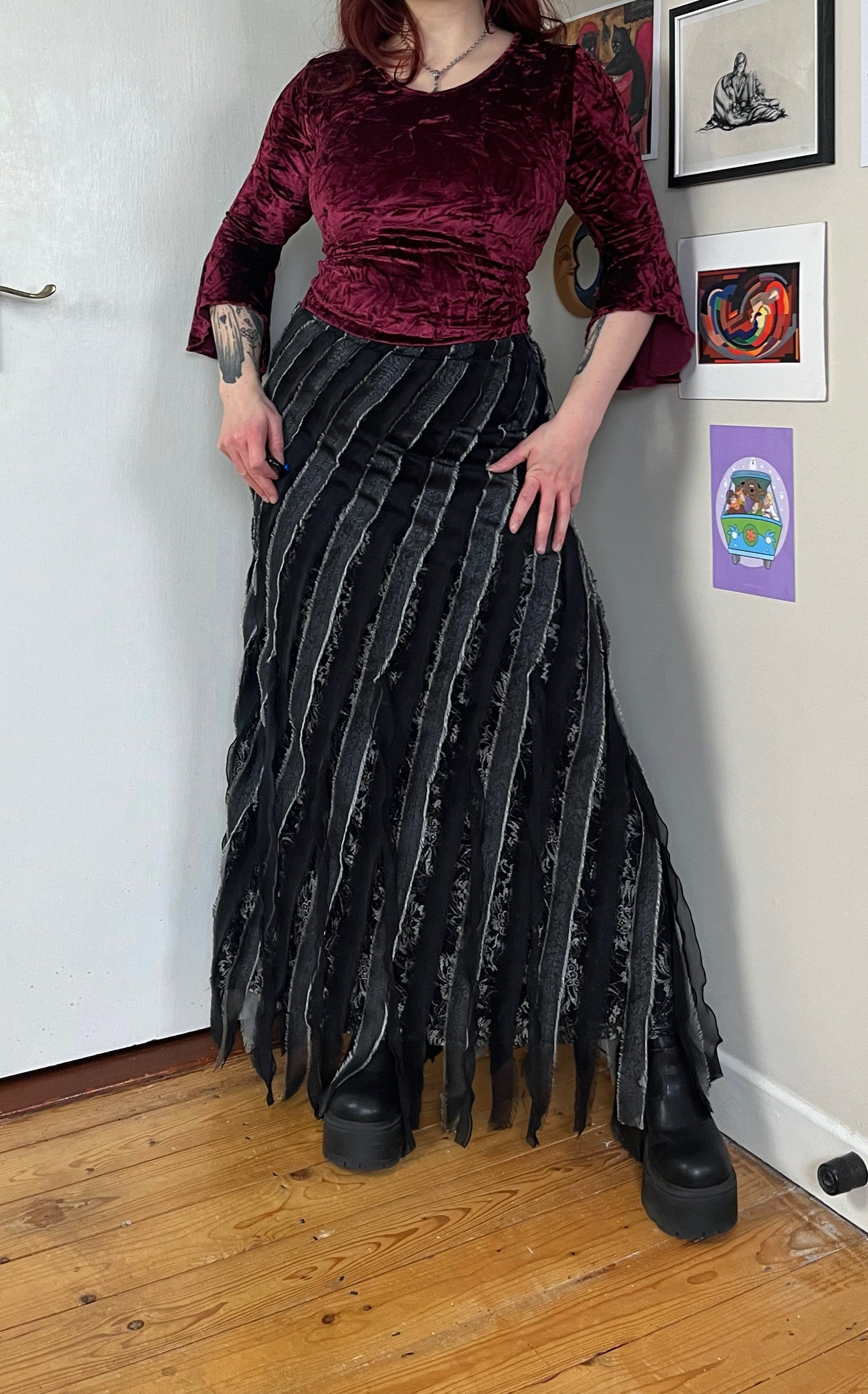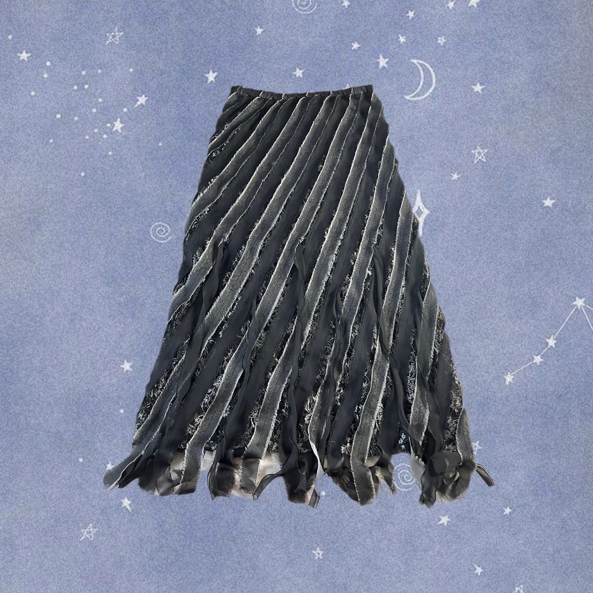 Gorgeous 1990s silver and black mesh skirt by Molly-Jo! This has a stretchy waist with hanging mesh parts! In perfect vintage condition and would best fit UK 12-14.