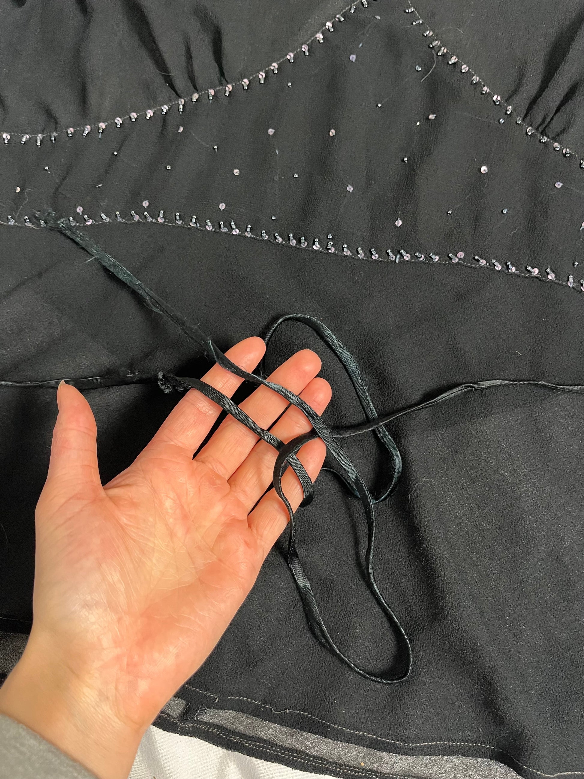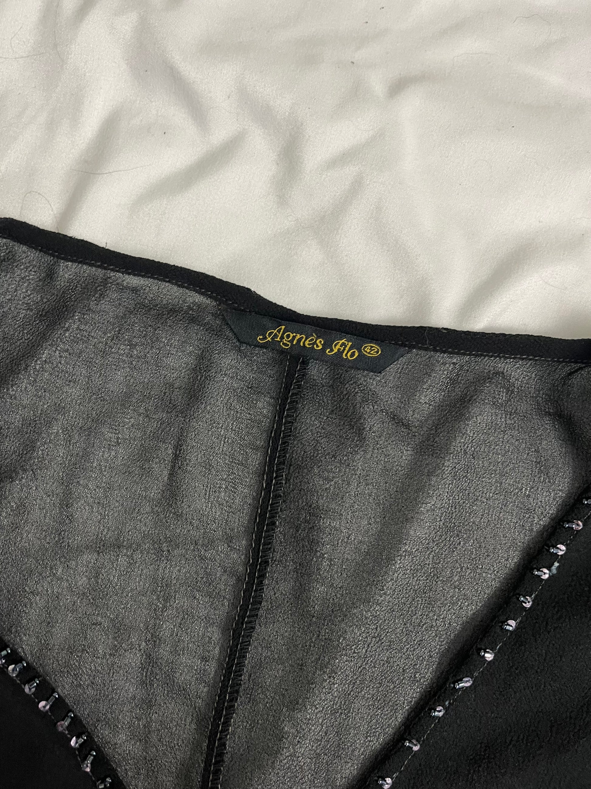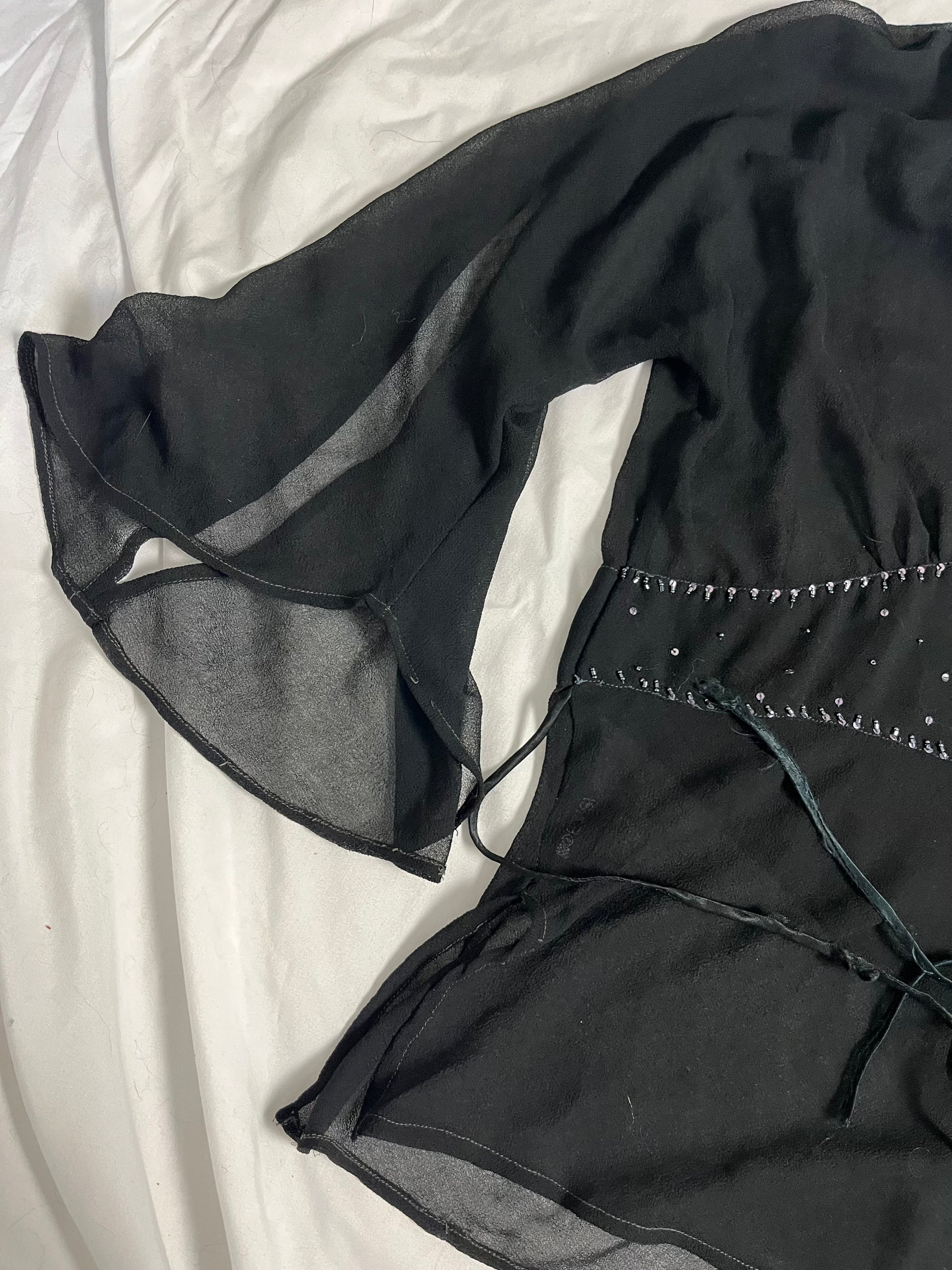 2000s black mesh top! This has flared sleeves and a see through material with a flattering fit. The ties at the back have some light wear to them but are in good condition otherwise.