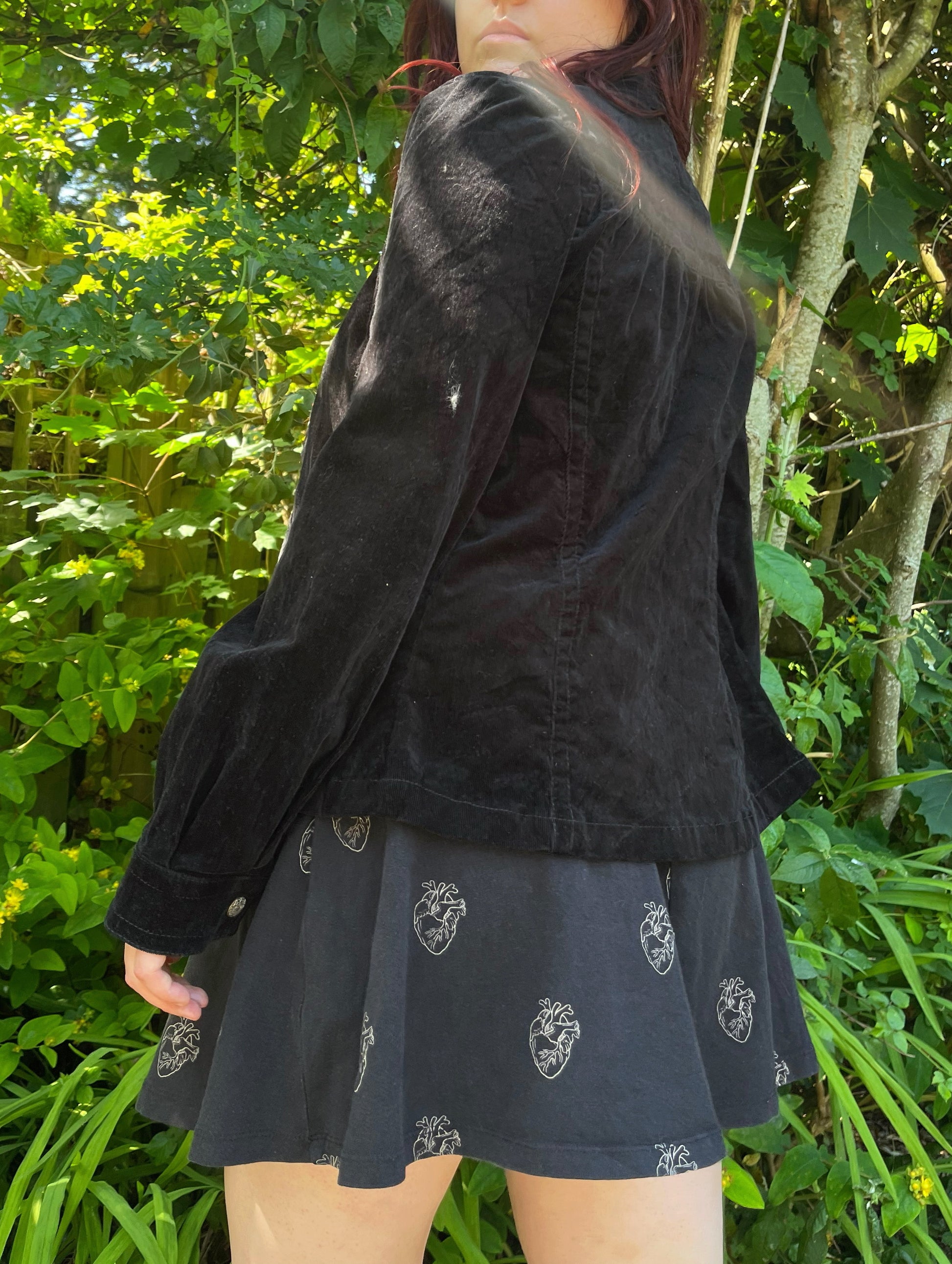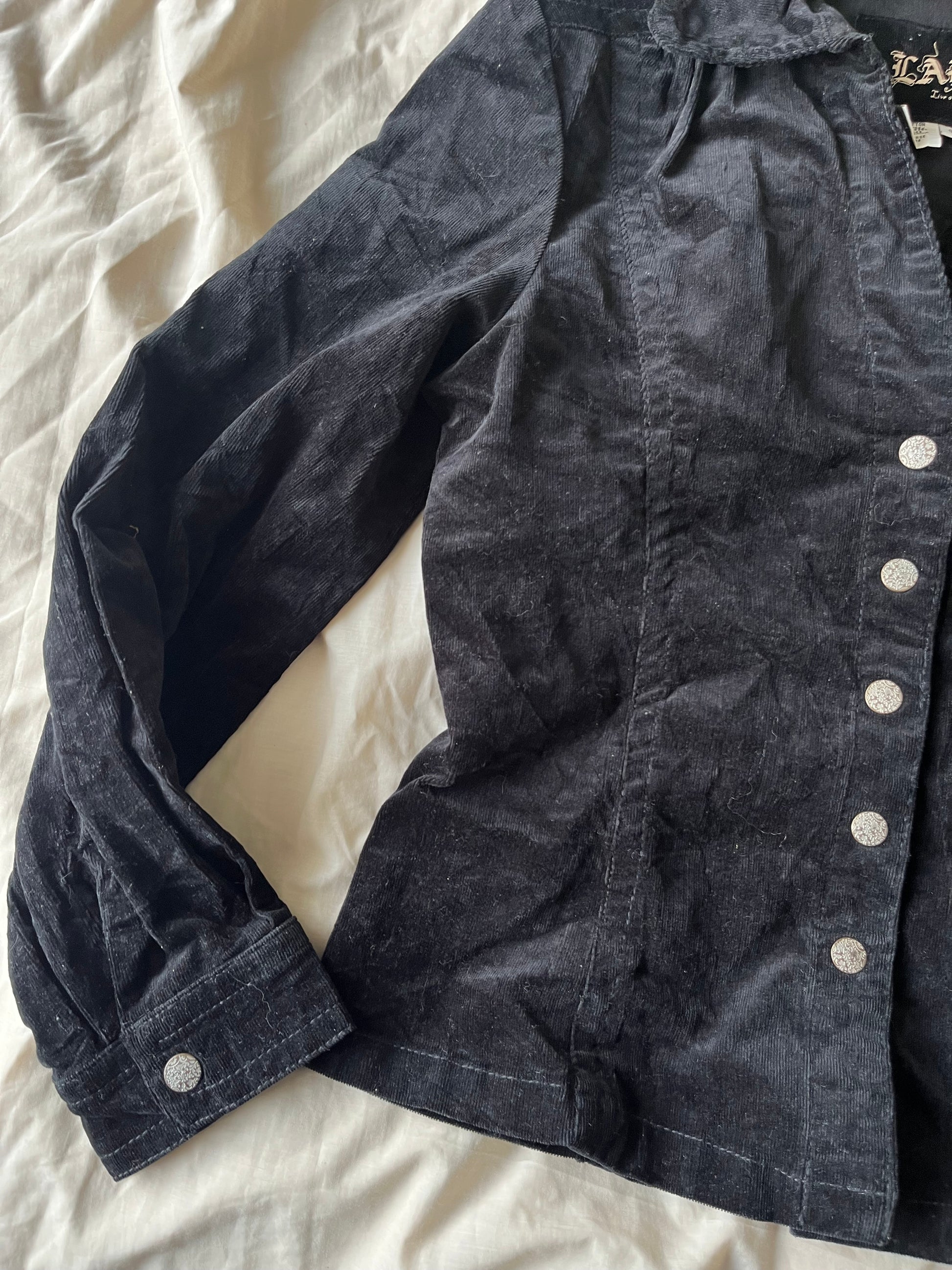 Amazing 1990s black corduroy jacket! Button up front with a flattering fit. In perfect vintage condition and would best fit UK 6-12 depending on desired fit.
