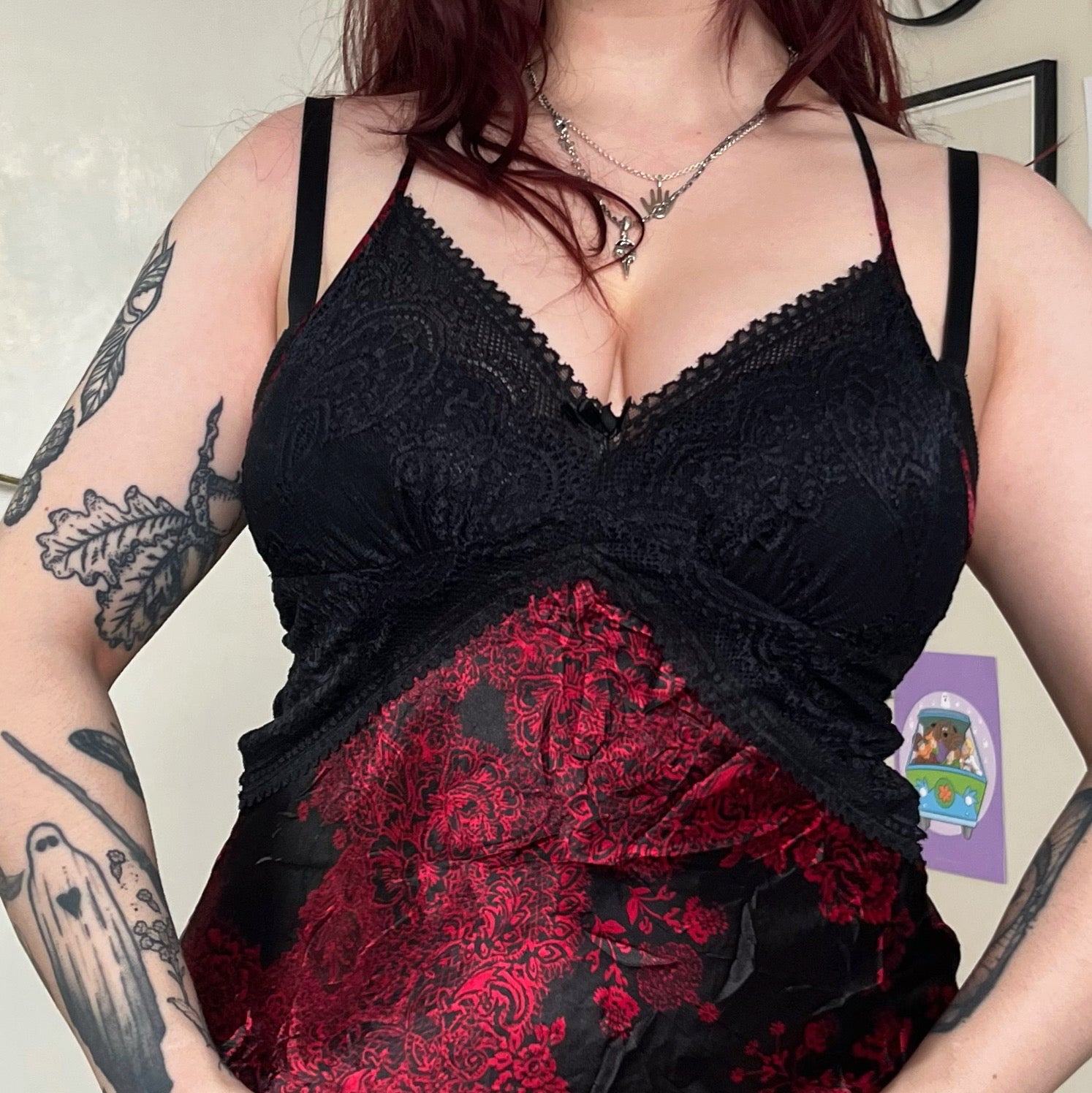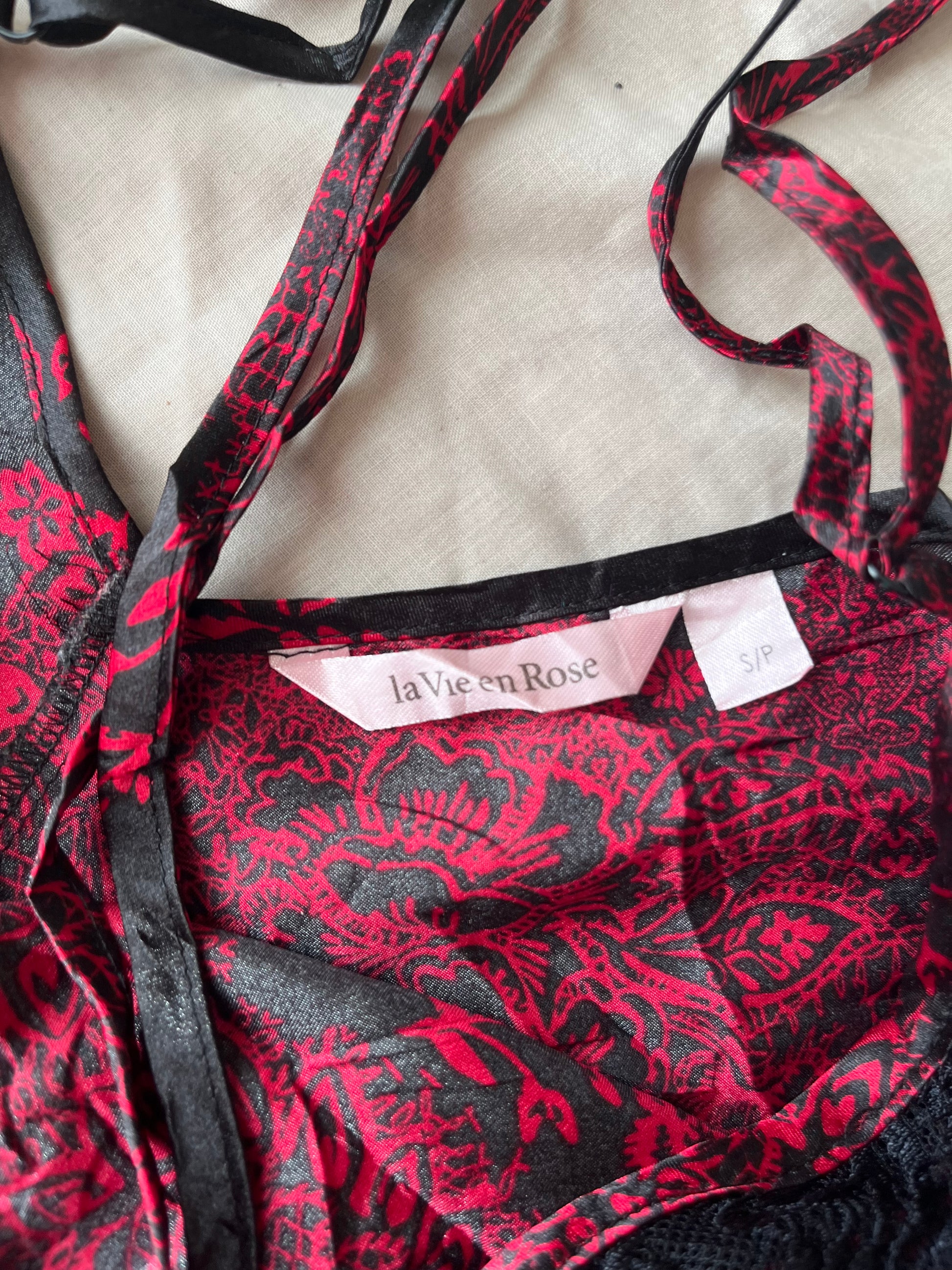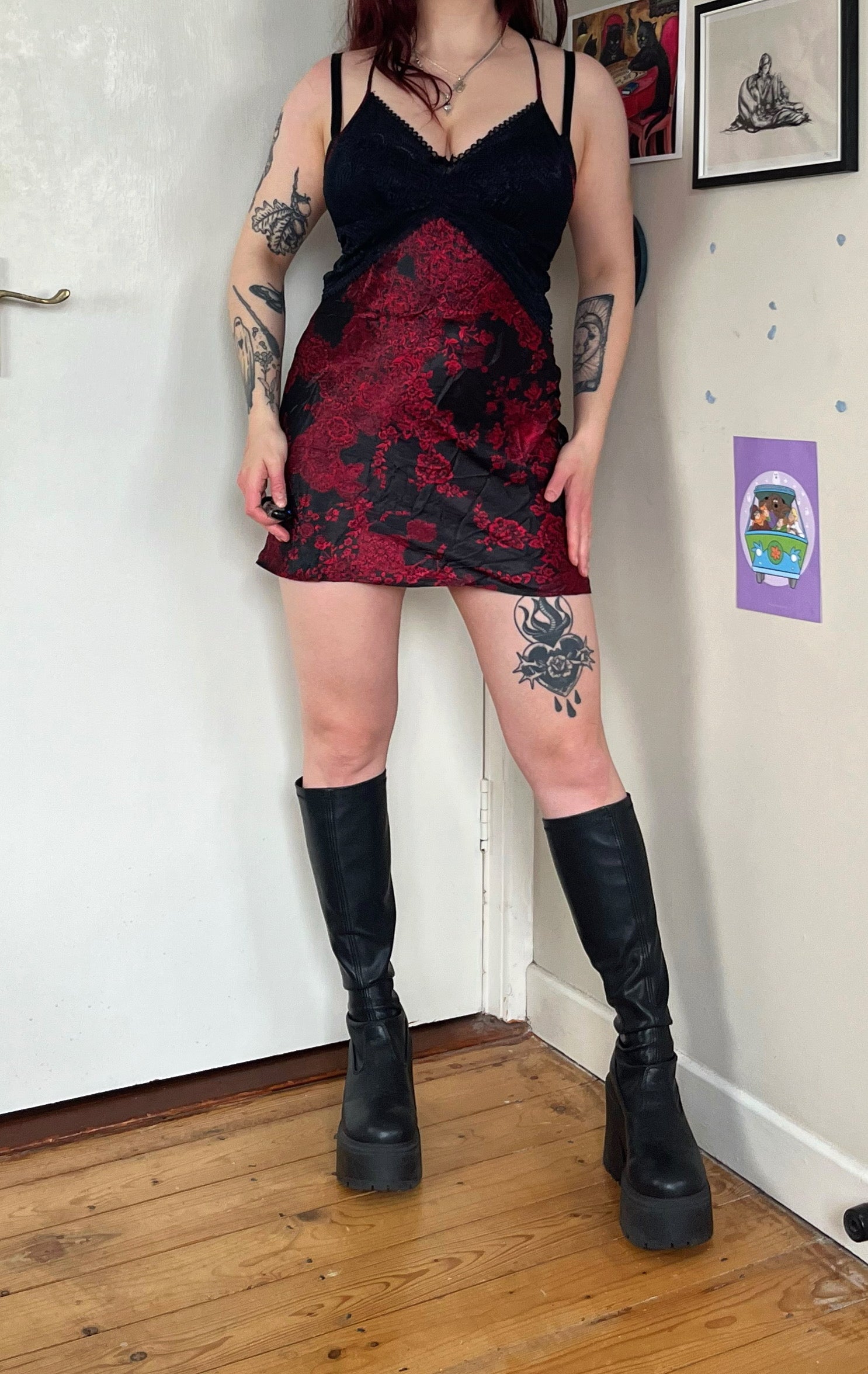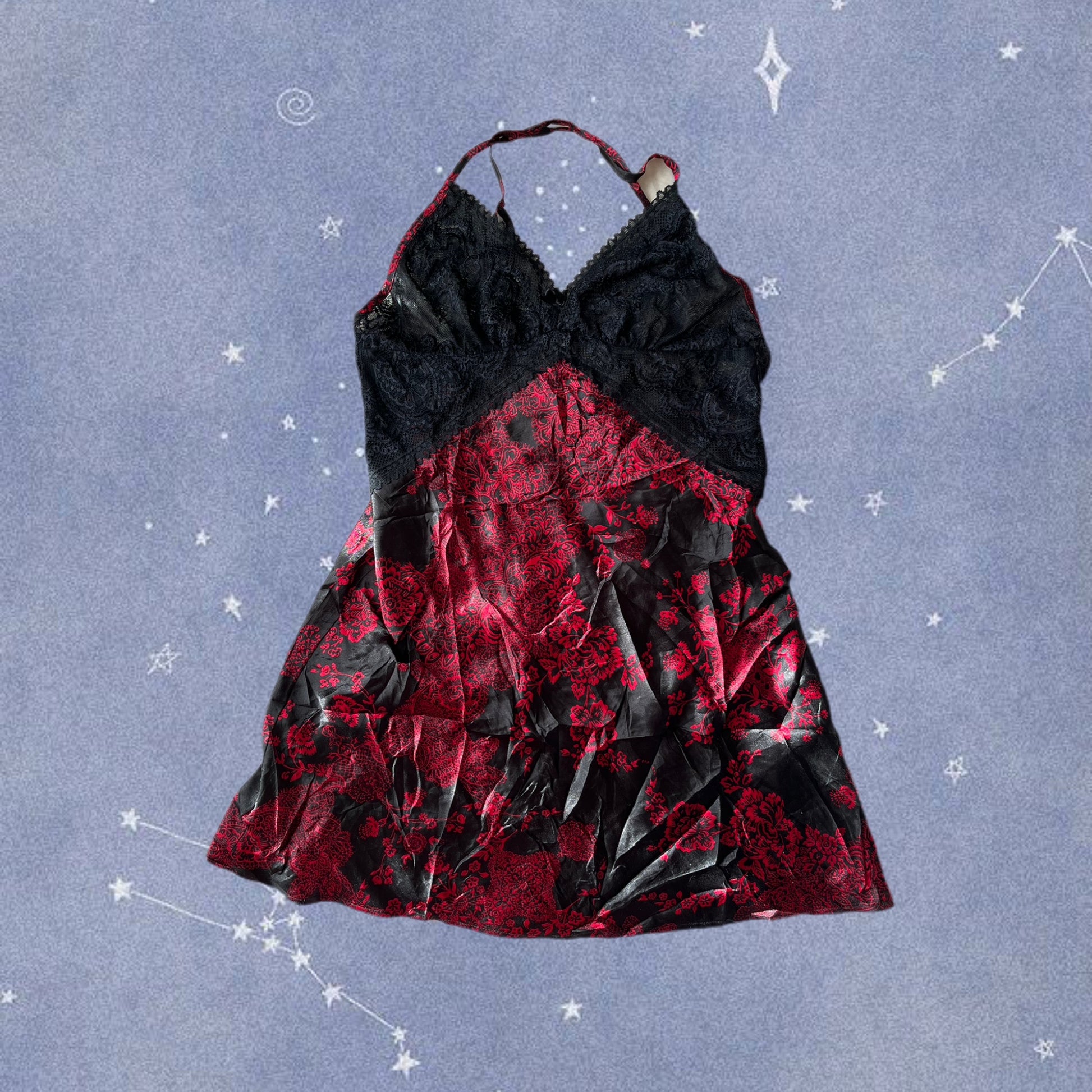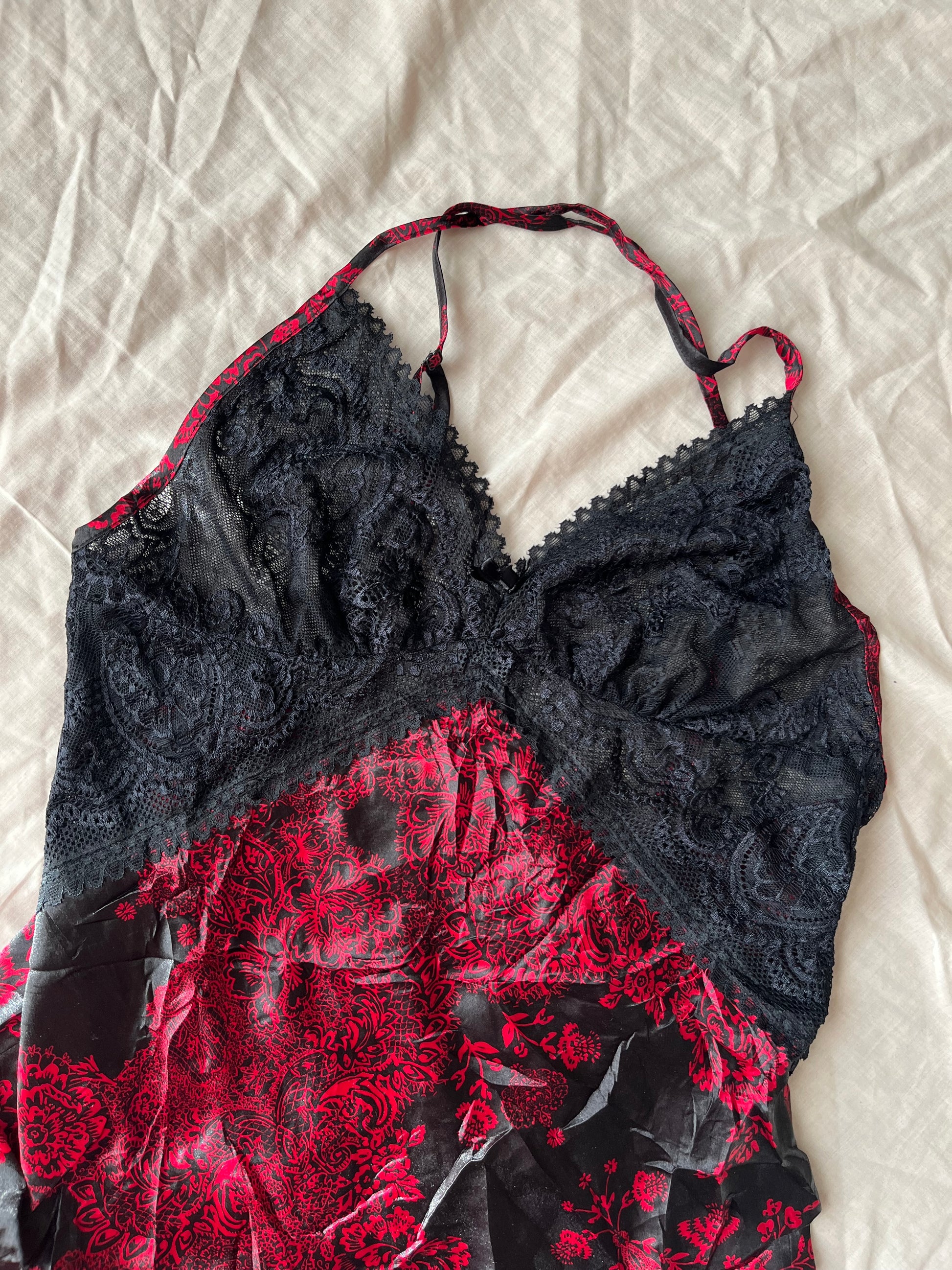 Gorgeous 200s black and red floral mini slip dress! Features lace details on the front.