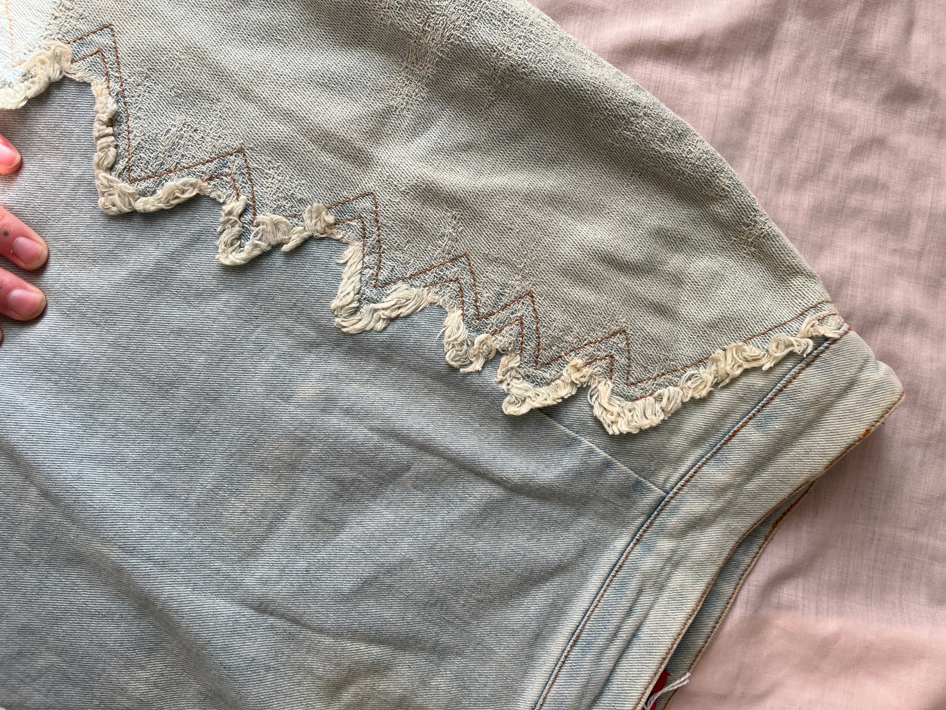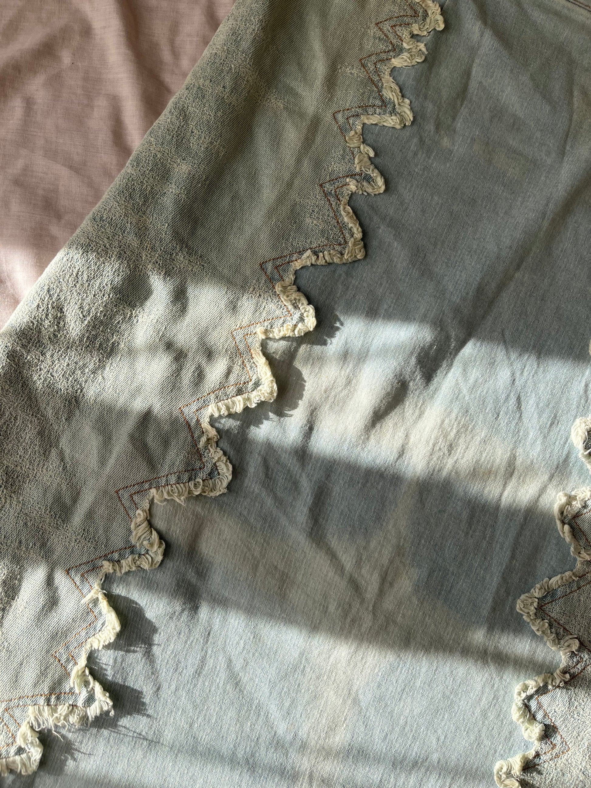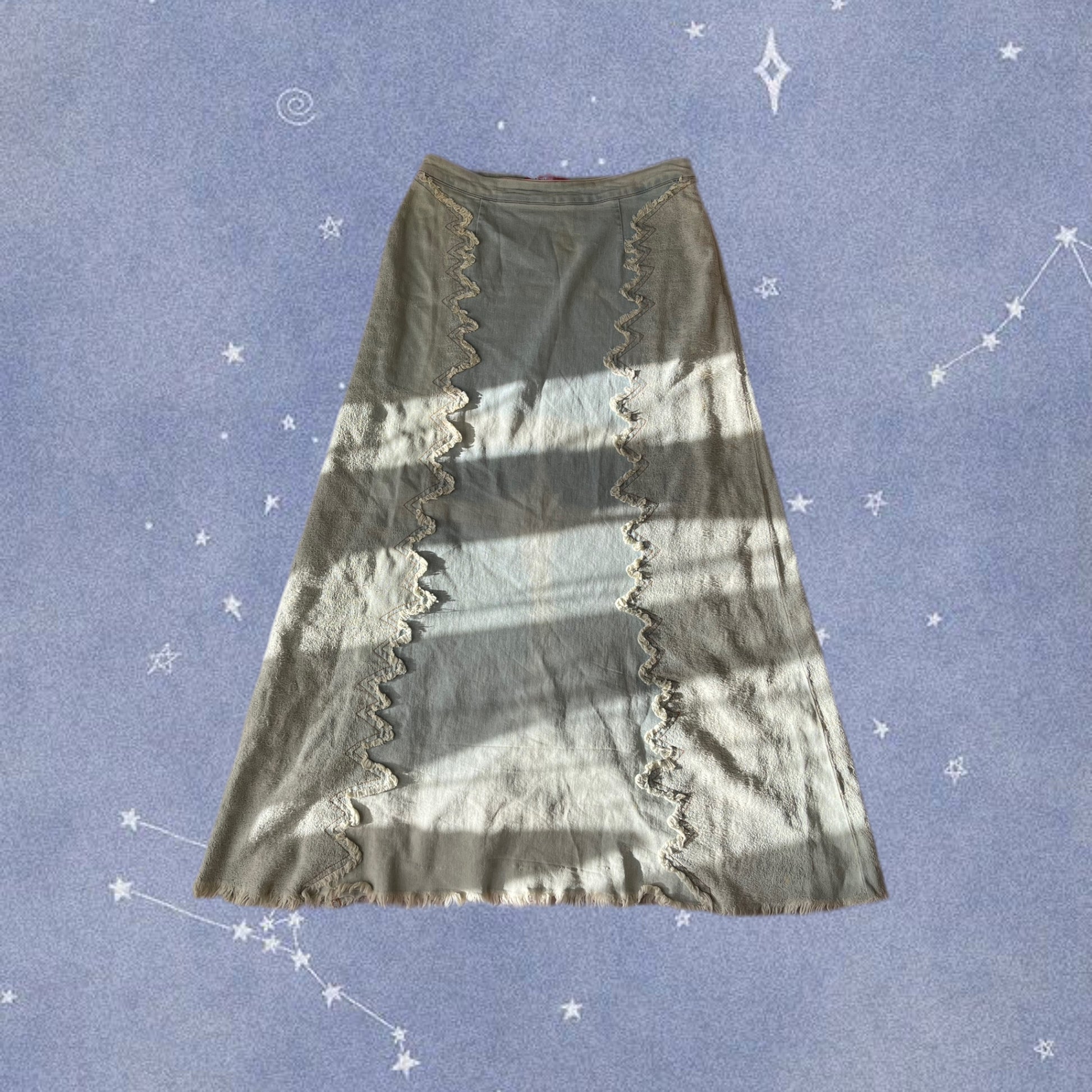 2000s light wash denim maxi skirt! This has zig zag trim and a flattering fit.