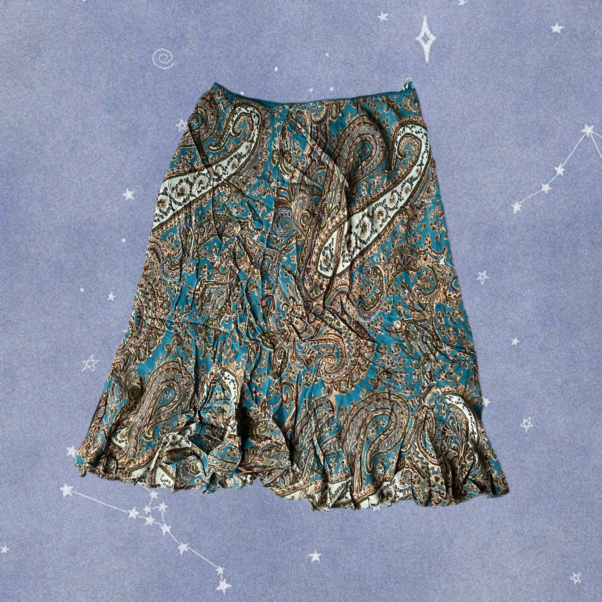 1990s blue and brown floral design mesh skirt! Flattering fit with a stretchy waist.