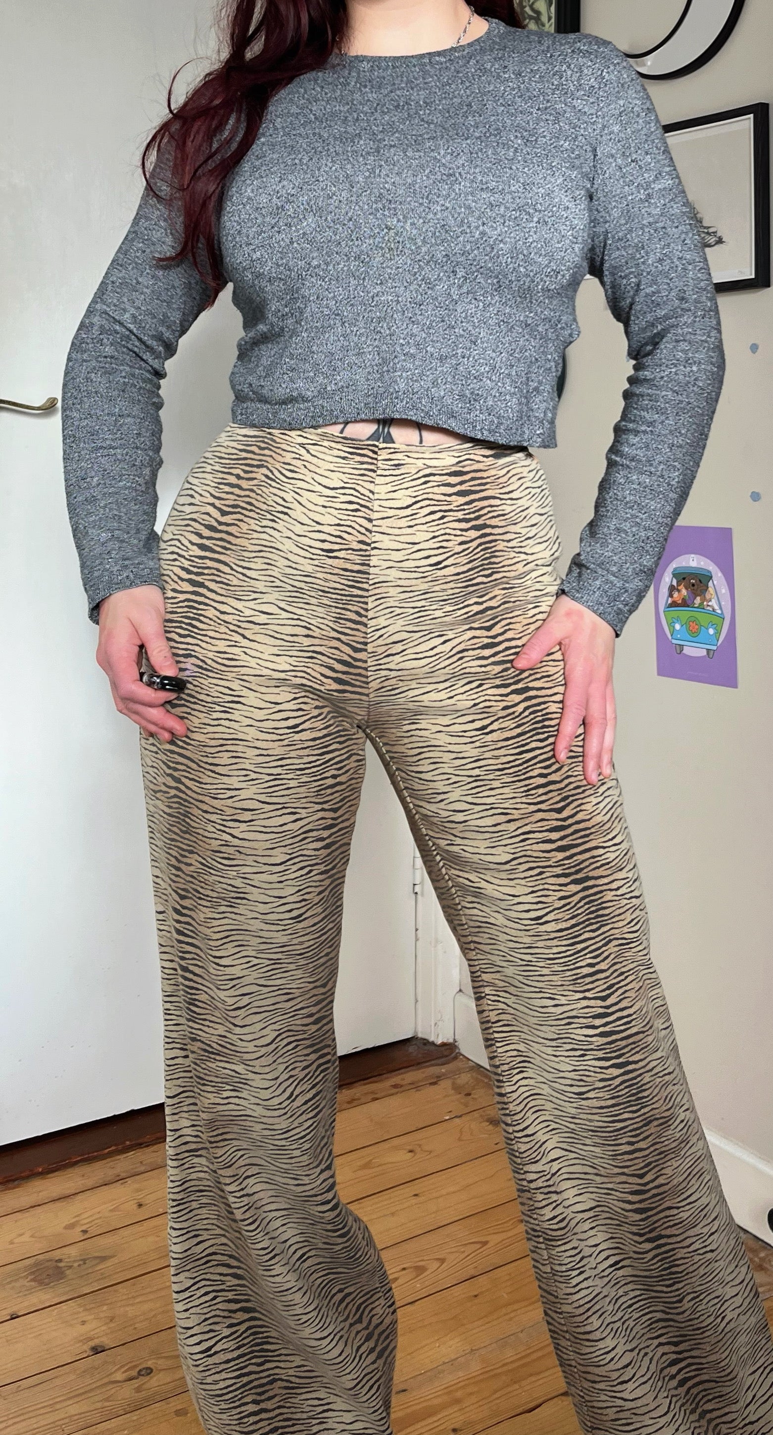 1990s/2000s animal pattern pants! High waisted with a velvet feel and a flared leg. Super flattering! Quite a long leg on these so best for someone tall.