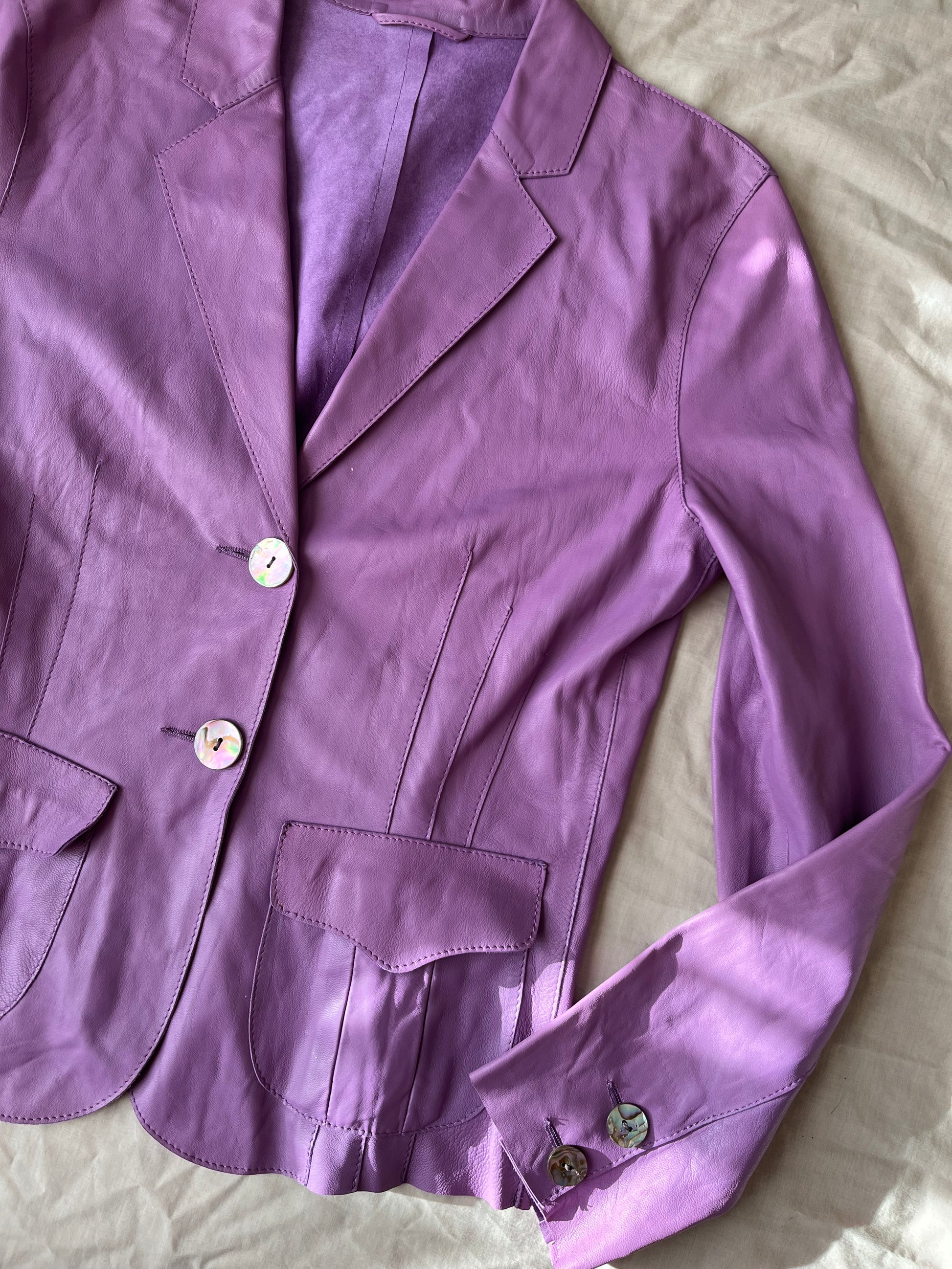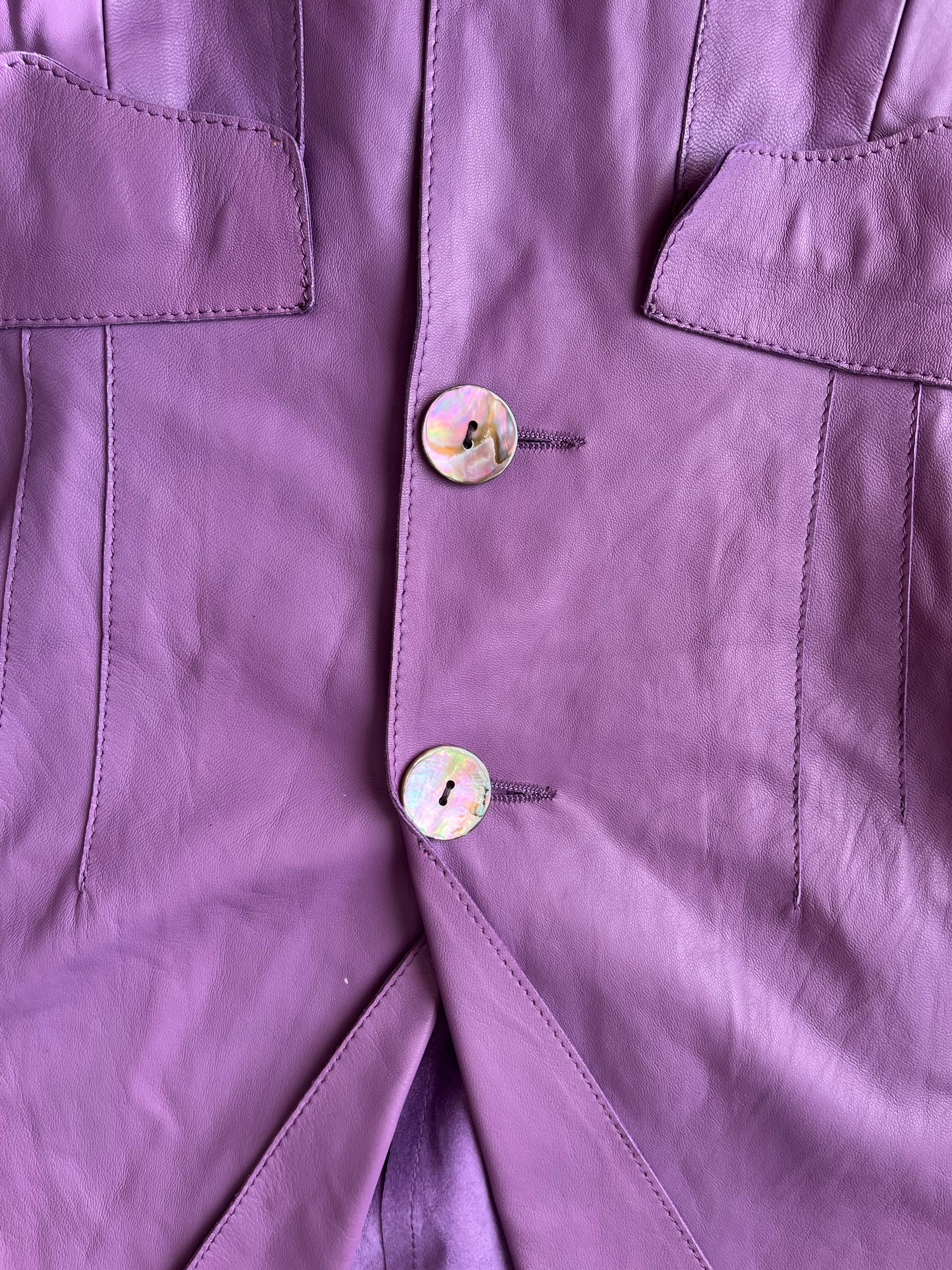 Fab 2000s purple leather jacket! Buttons up the front with a flattering fit.