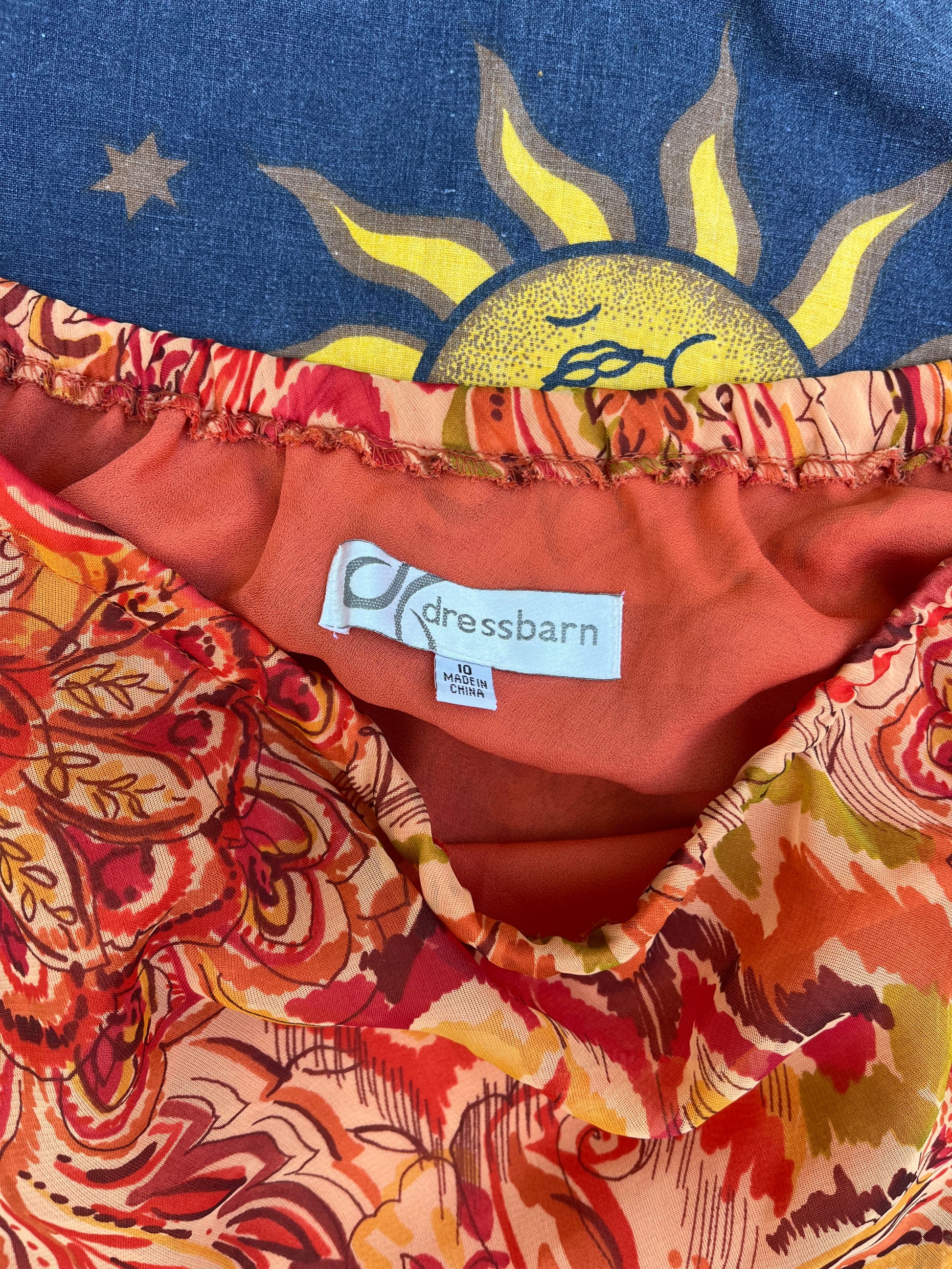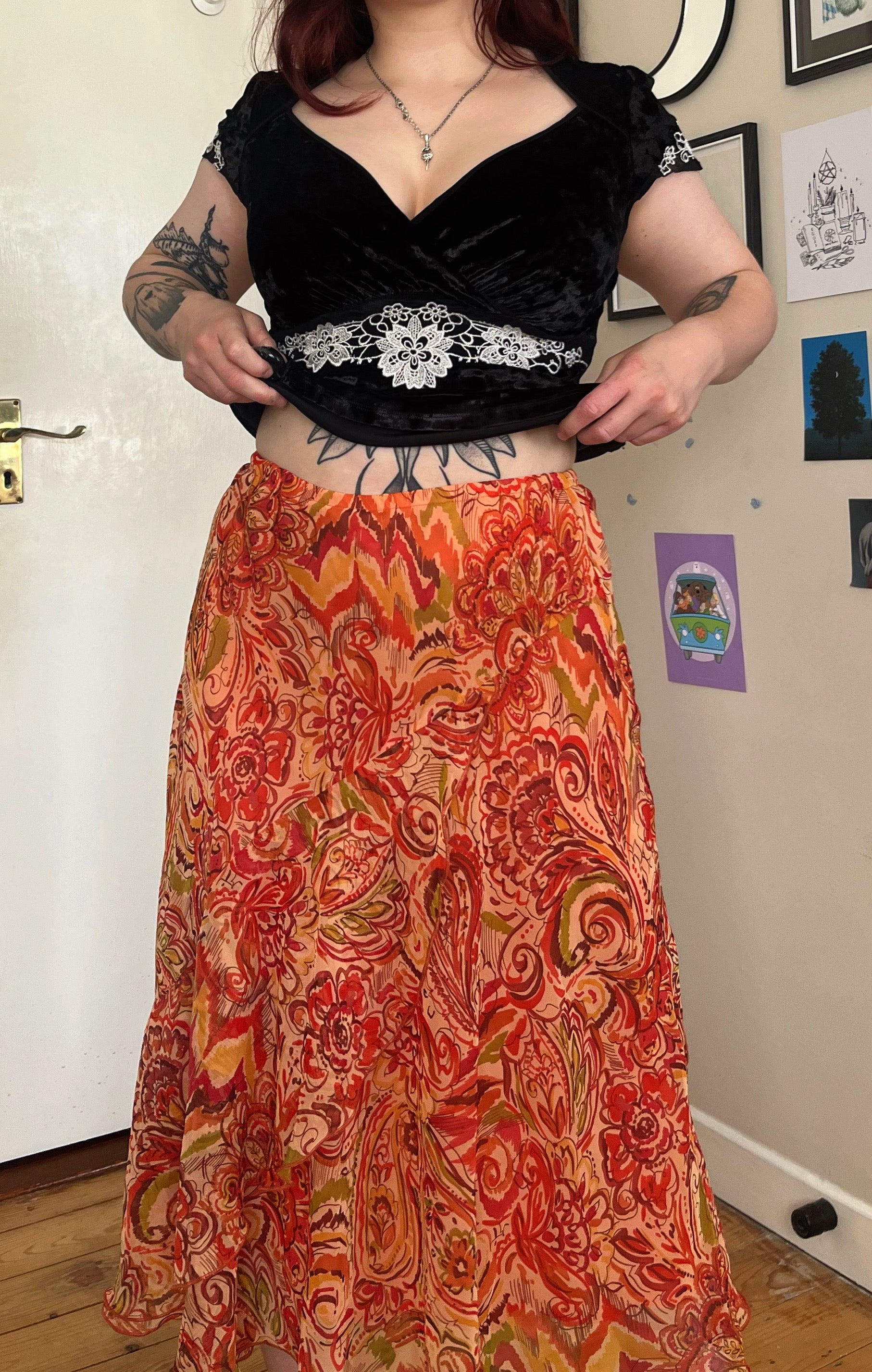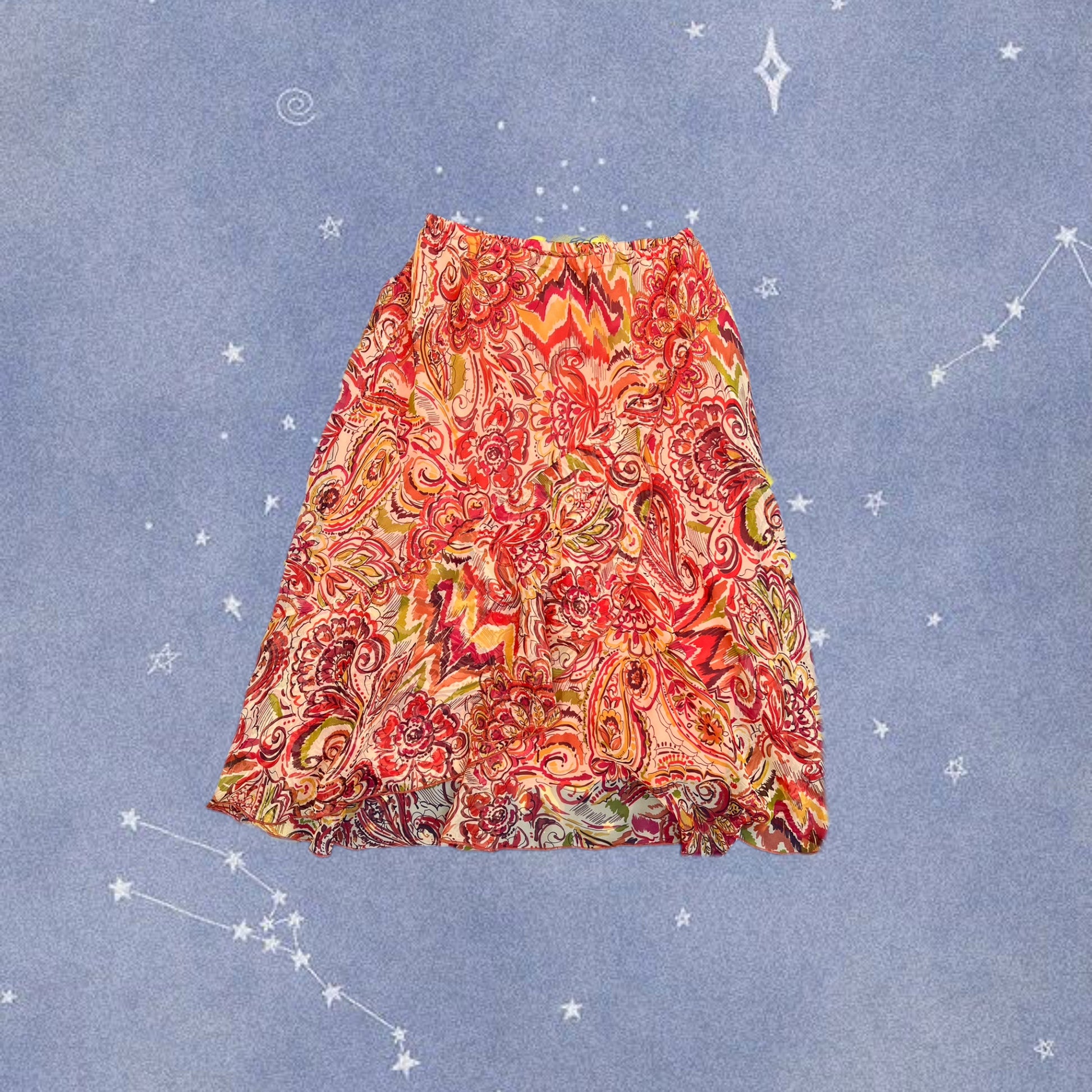 2000s orange floral mesh midi skirt! Stretchy waist. In perfect vintage condition and would best fit UK 10-12 as the waist can stretch.