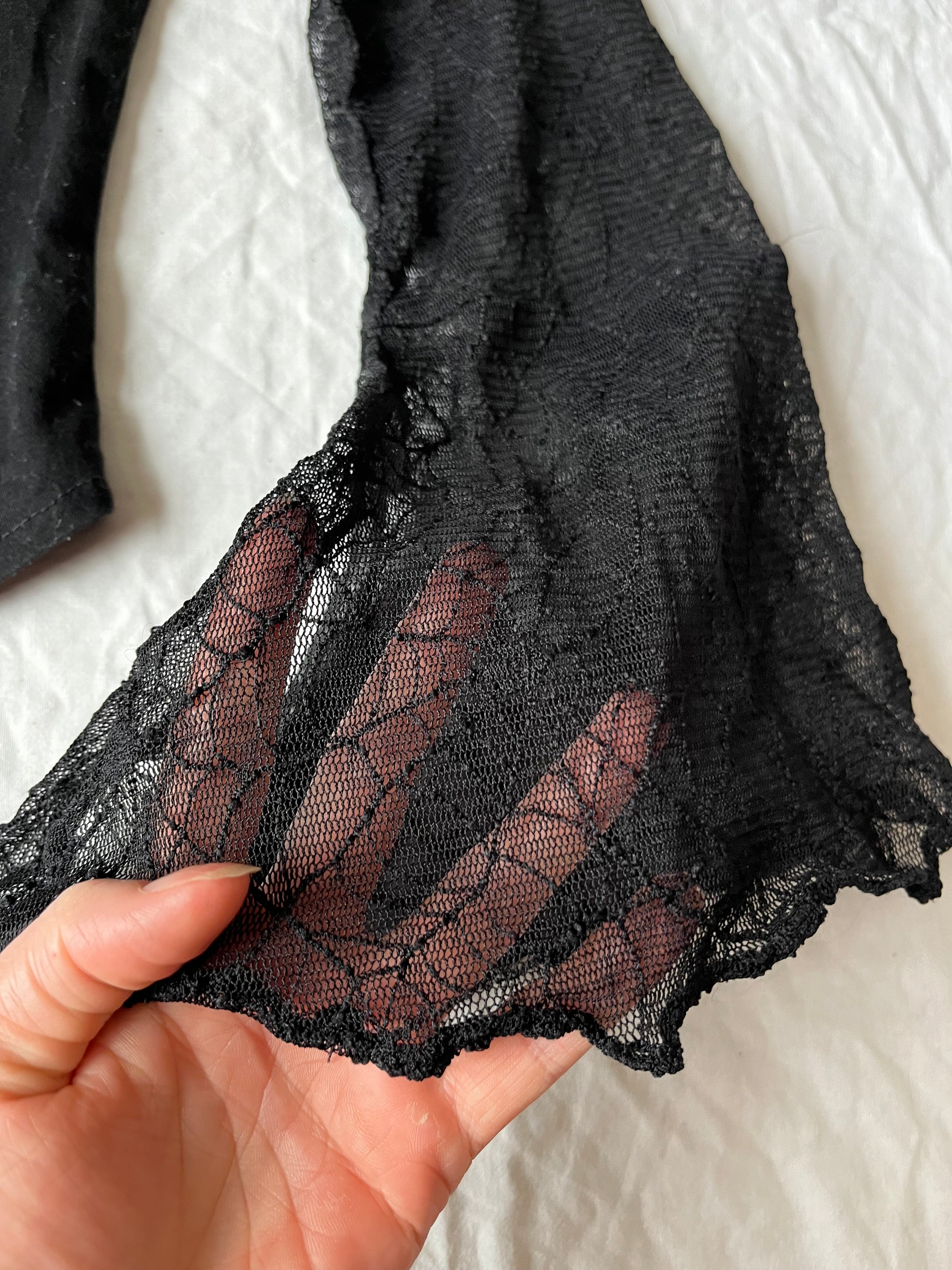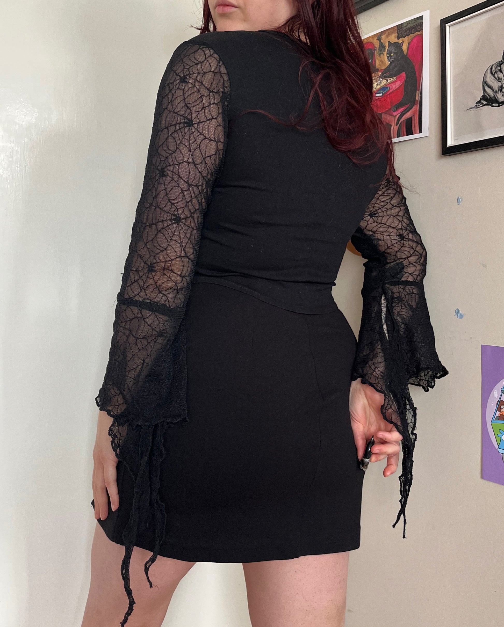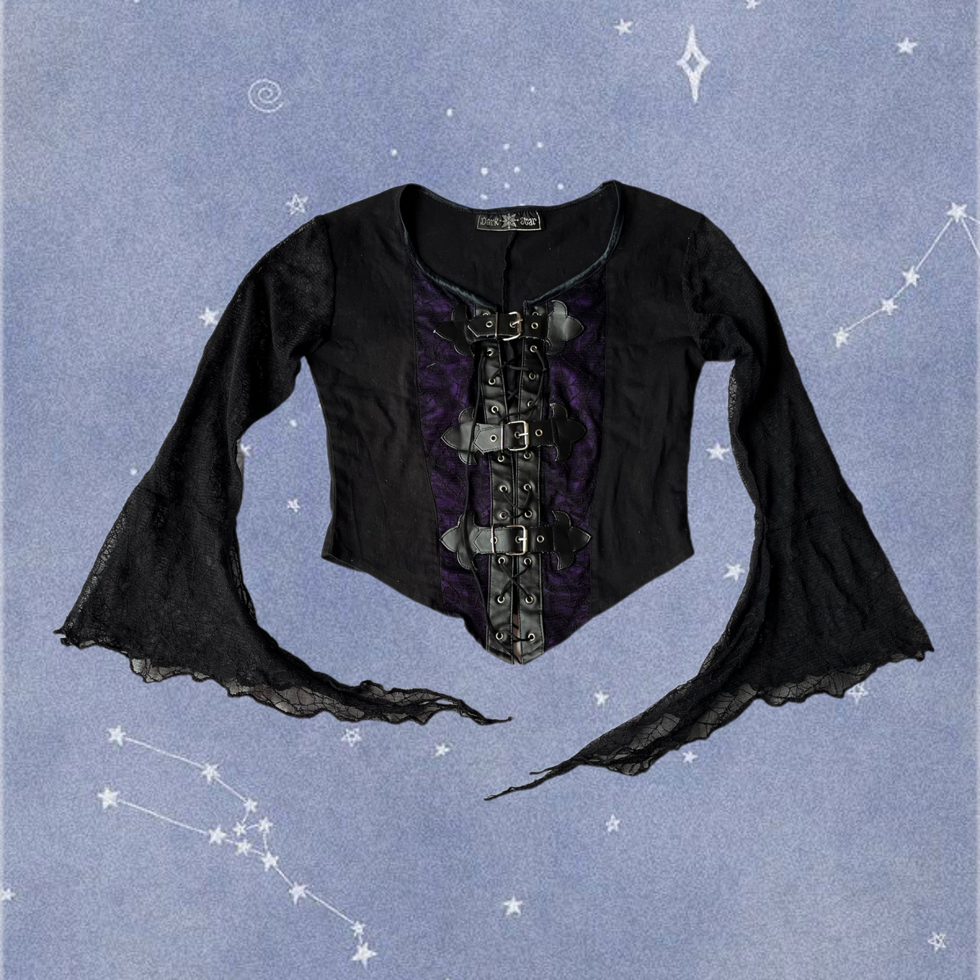 Amazing 1990s gothic top by Dark Star! This has flared sleeves with a cobweb design, buckles on the front and a lace up front.
