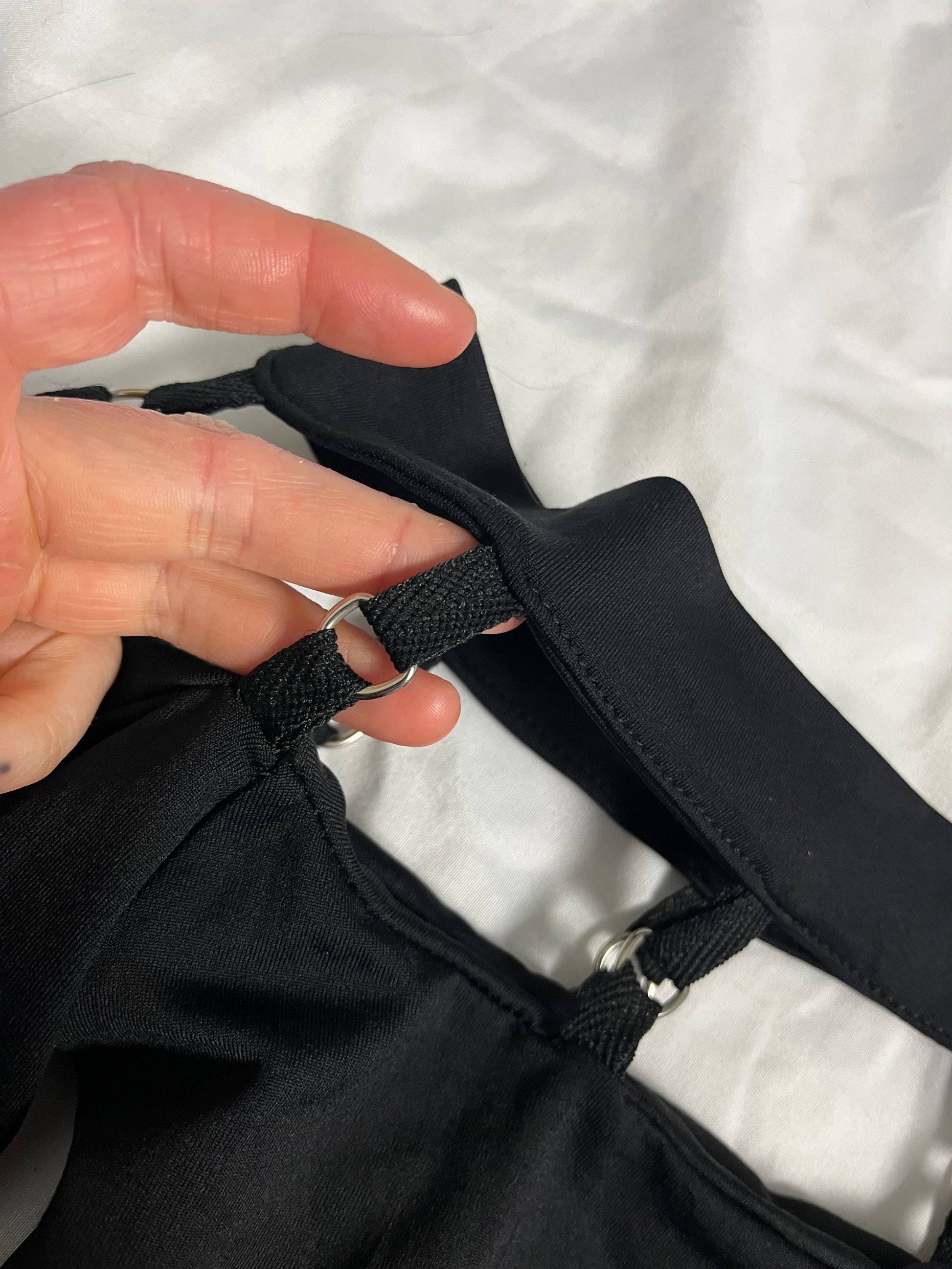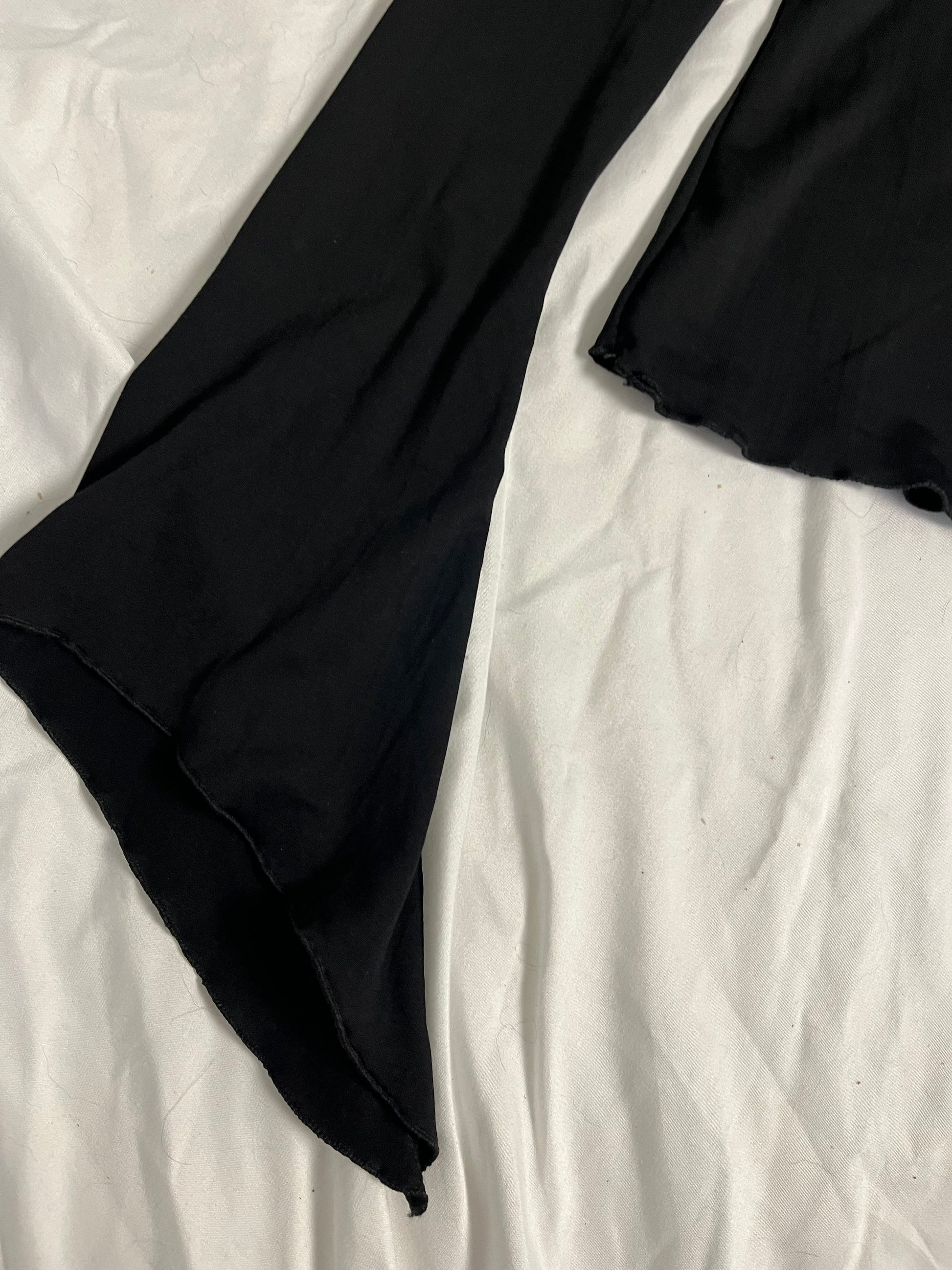 2000s black top! This has flared sleeves and a cool design on the neckline.