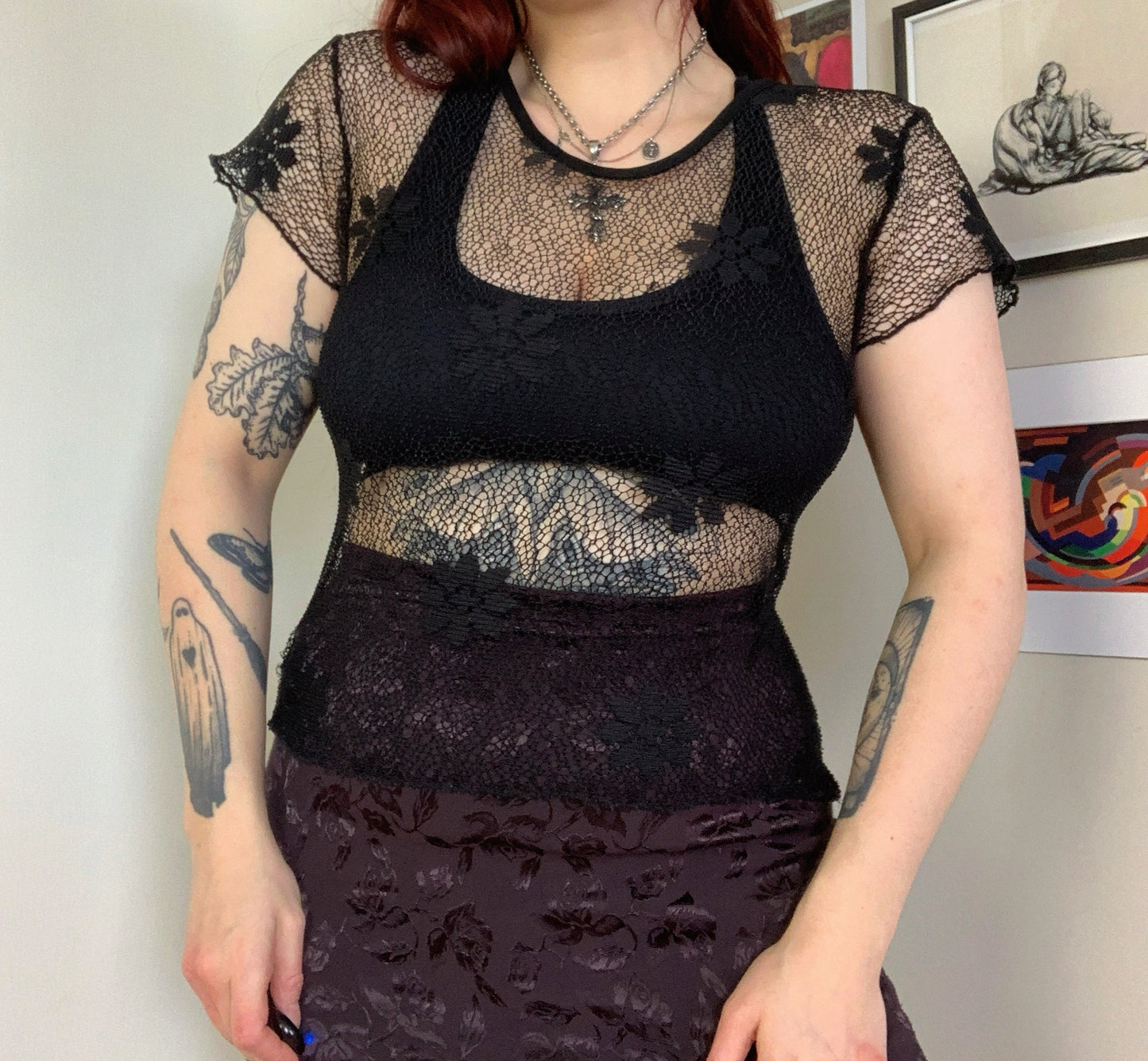 Gorgeous 90s black mesh/net top with a floral pattern all over! Slightly stretchy material with a flattering fit. In perfect vintage condition and would best fit a UK 10.