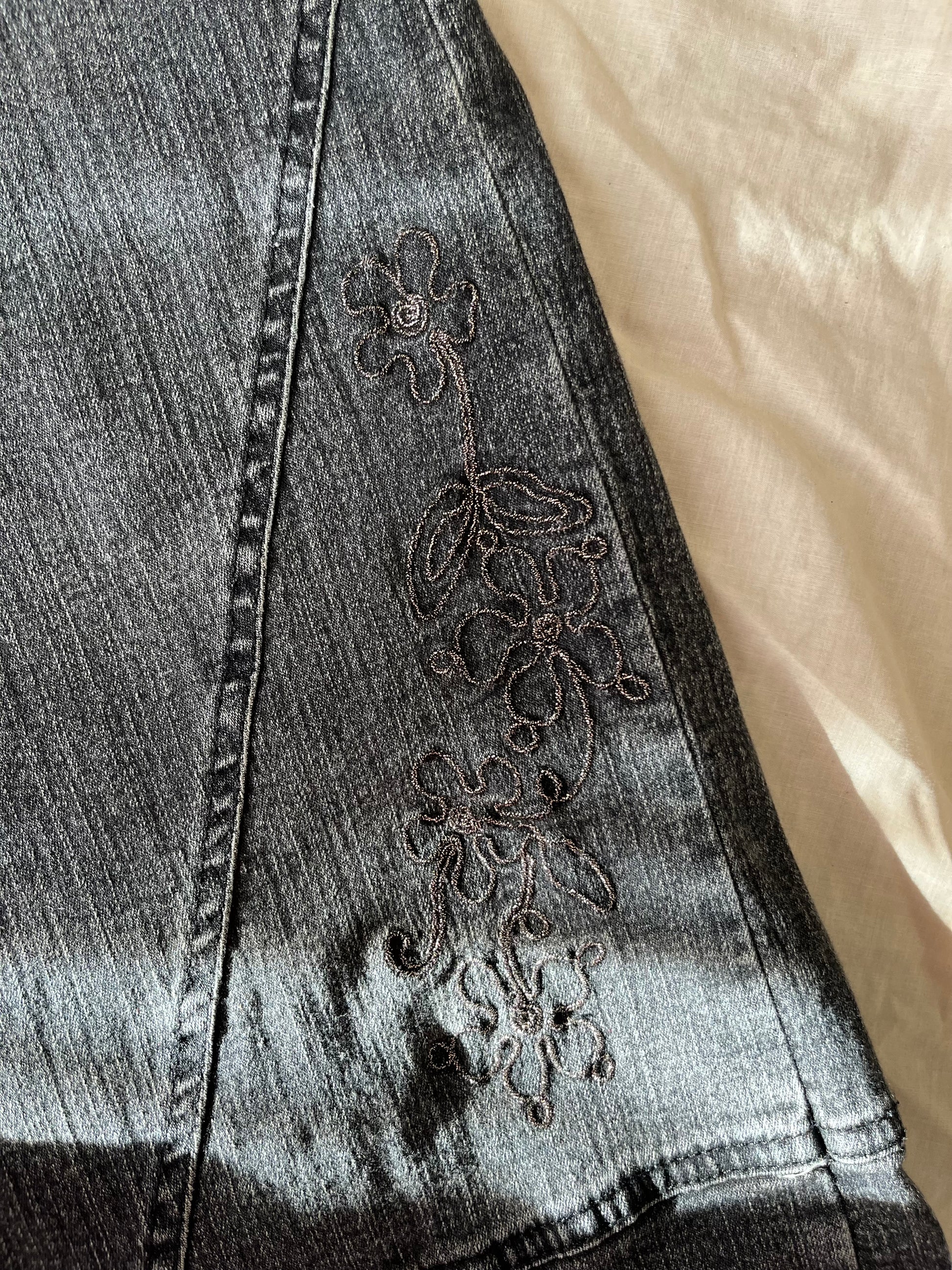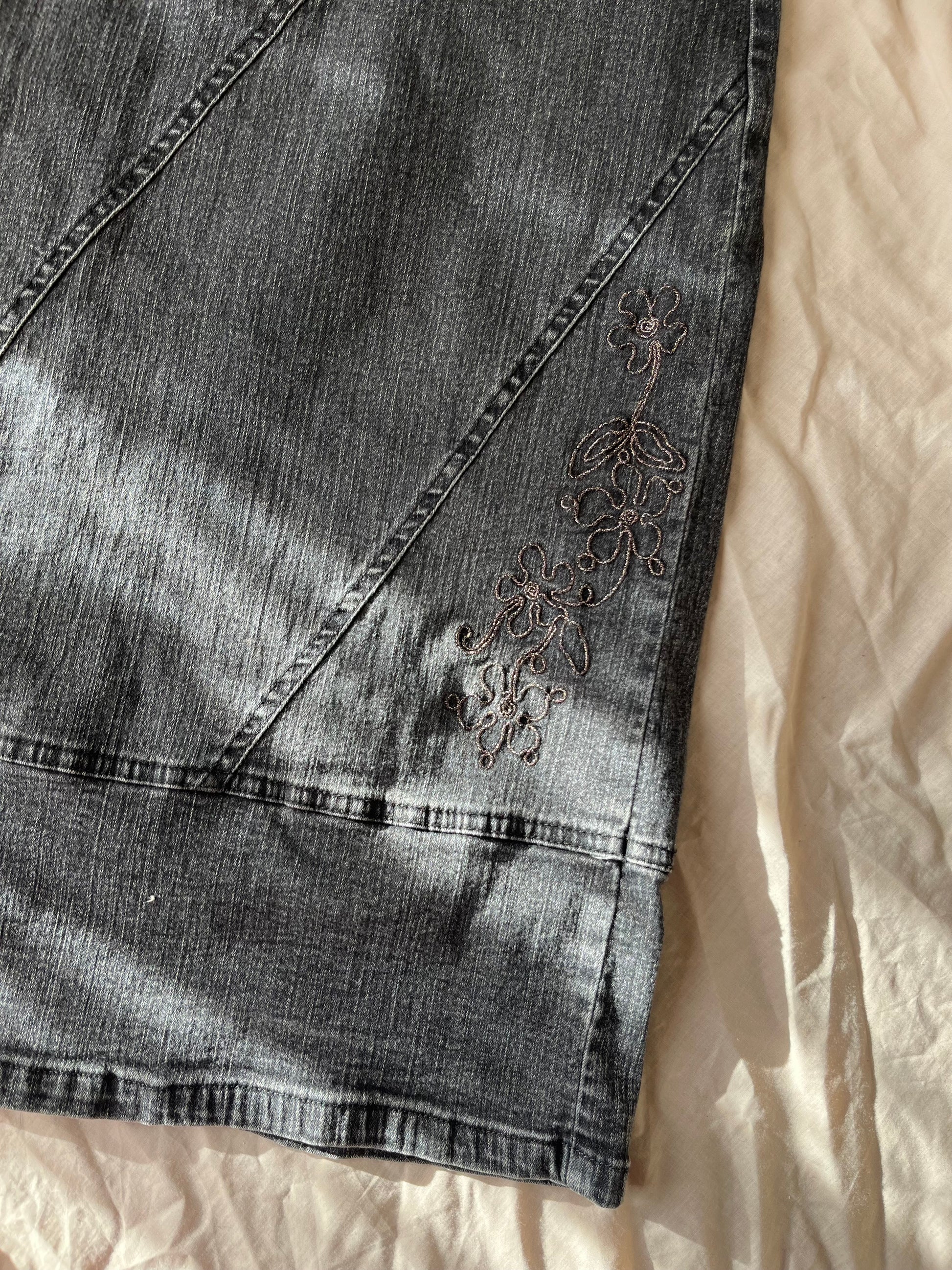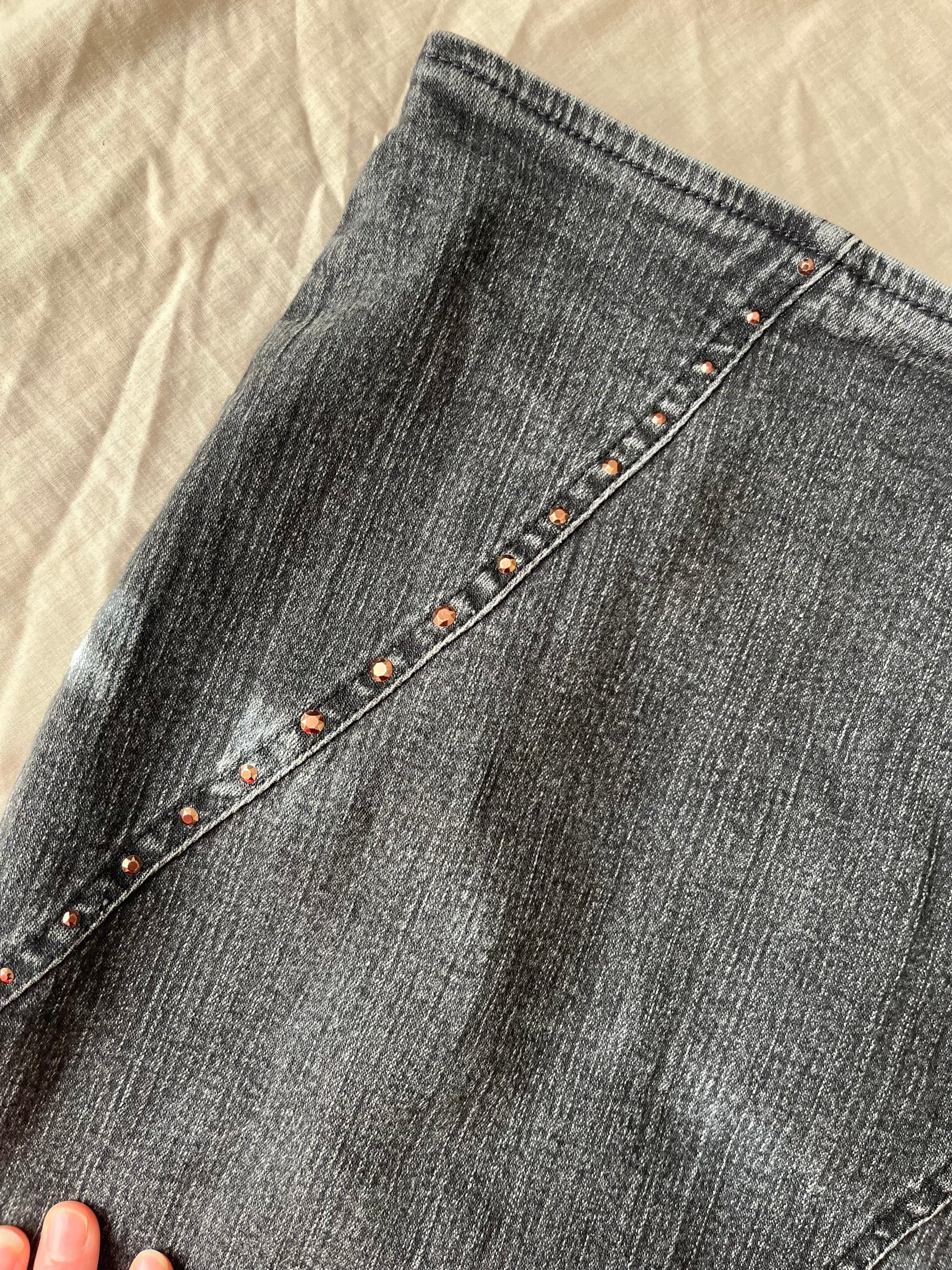 Gorgeous 1990s grey denim midi skirt! Can be worn low waisted on UK 10-12 or high waisted on UK 14.