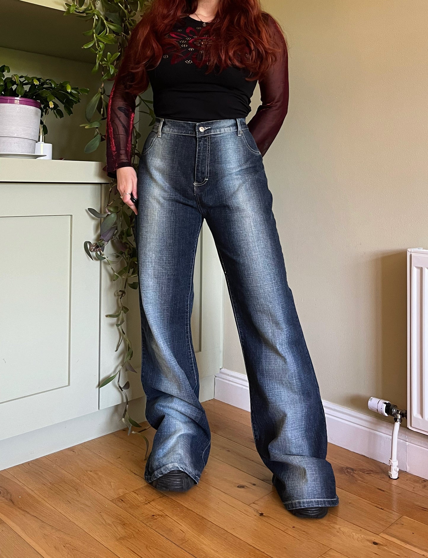 00s faded look flared jeans! High waisted with pockets and a flared leg. In perfect vintage condition and would best fit a UK 18. *Pinned on me here to show intended fit.