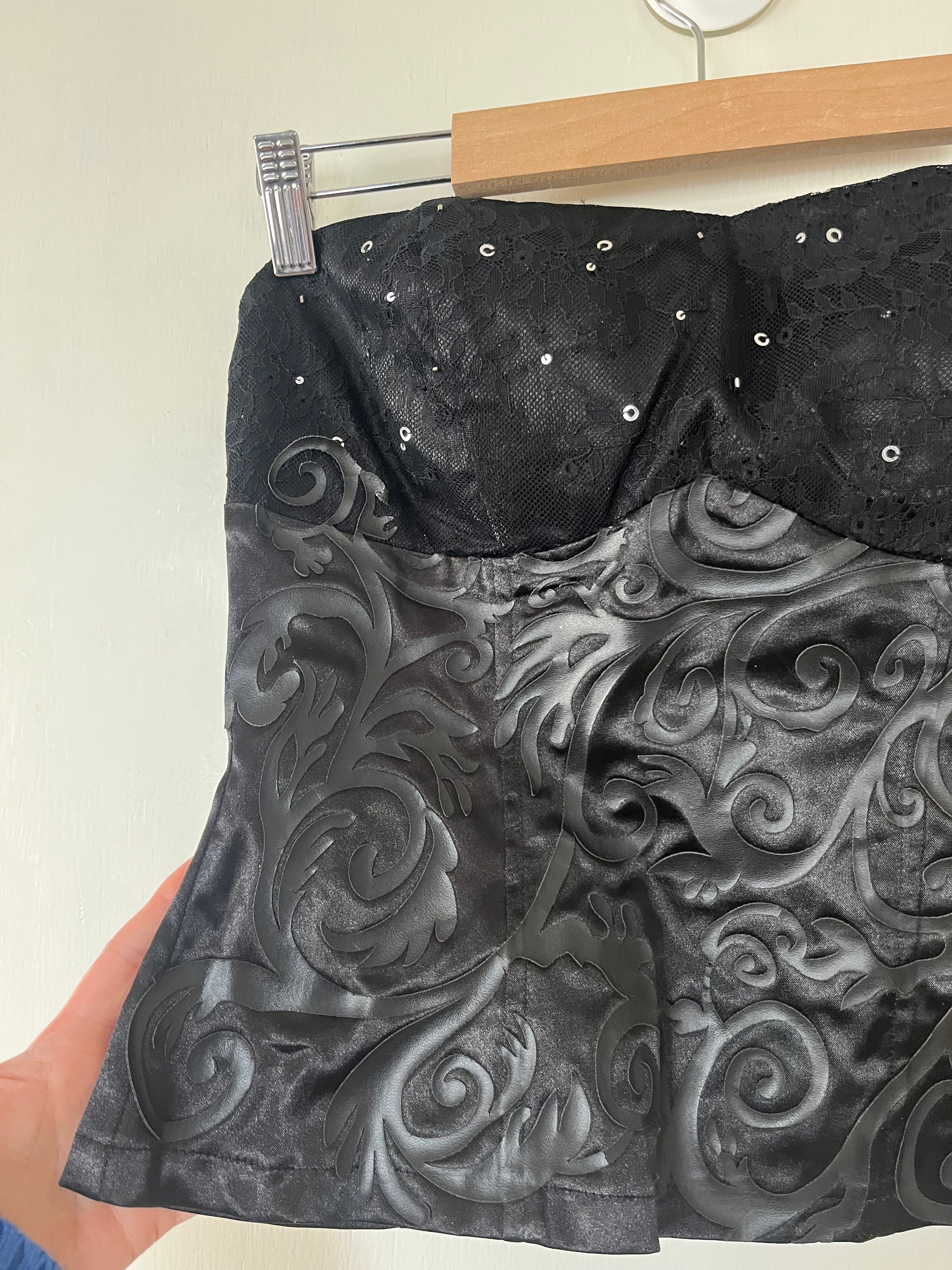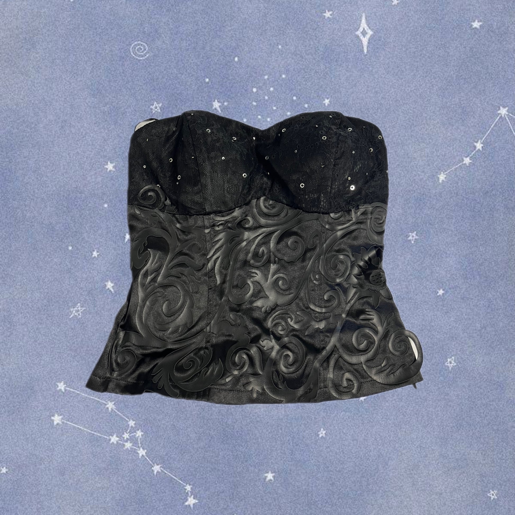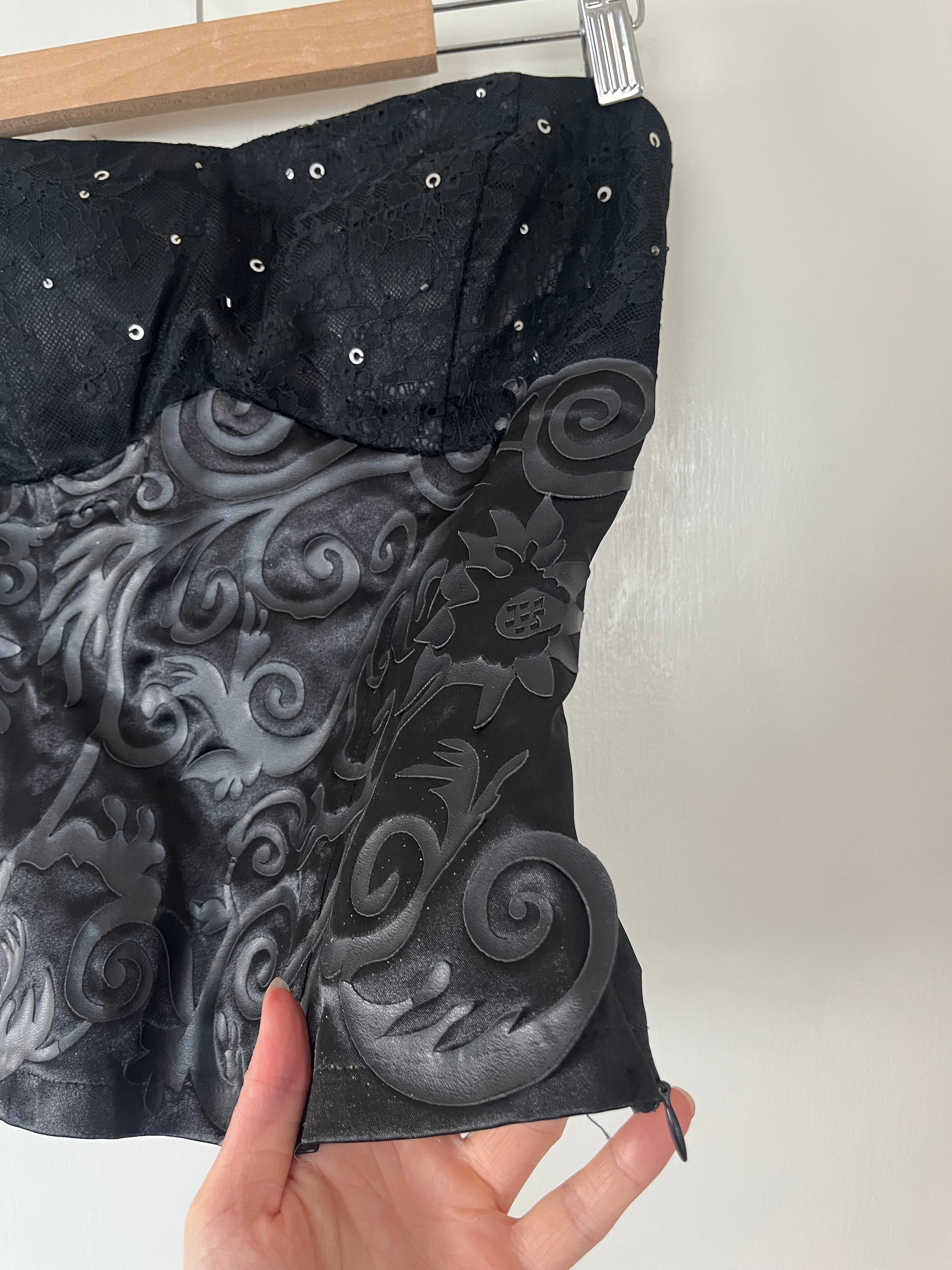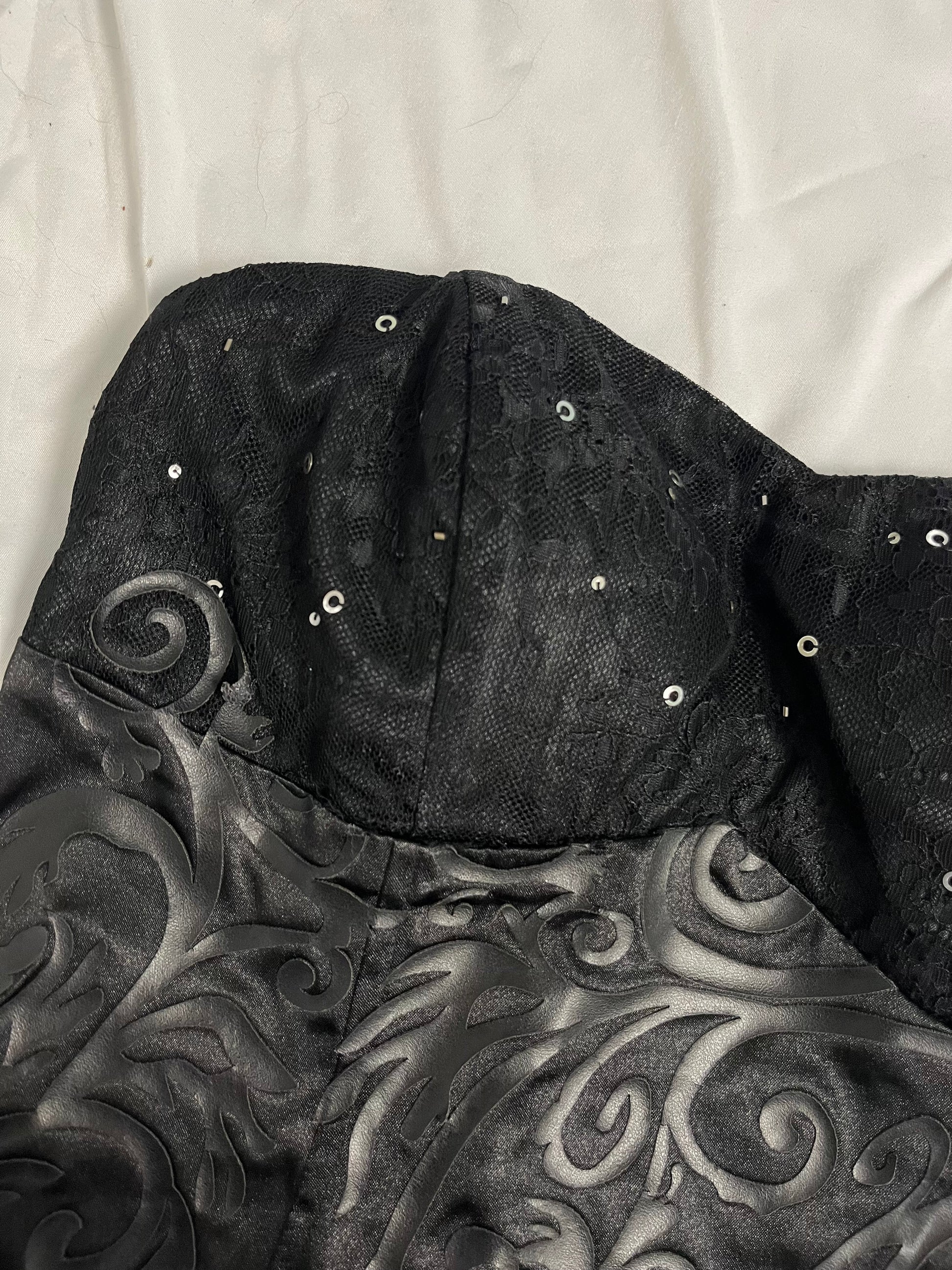 2000s black corset style top! This has a swirly design with sequins on the chest. Stretchy fit.