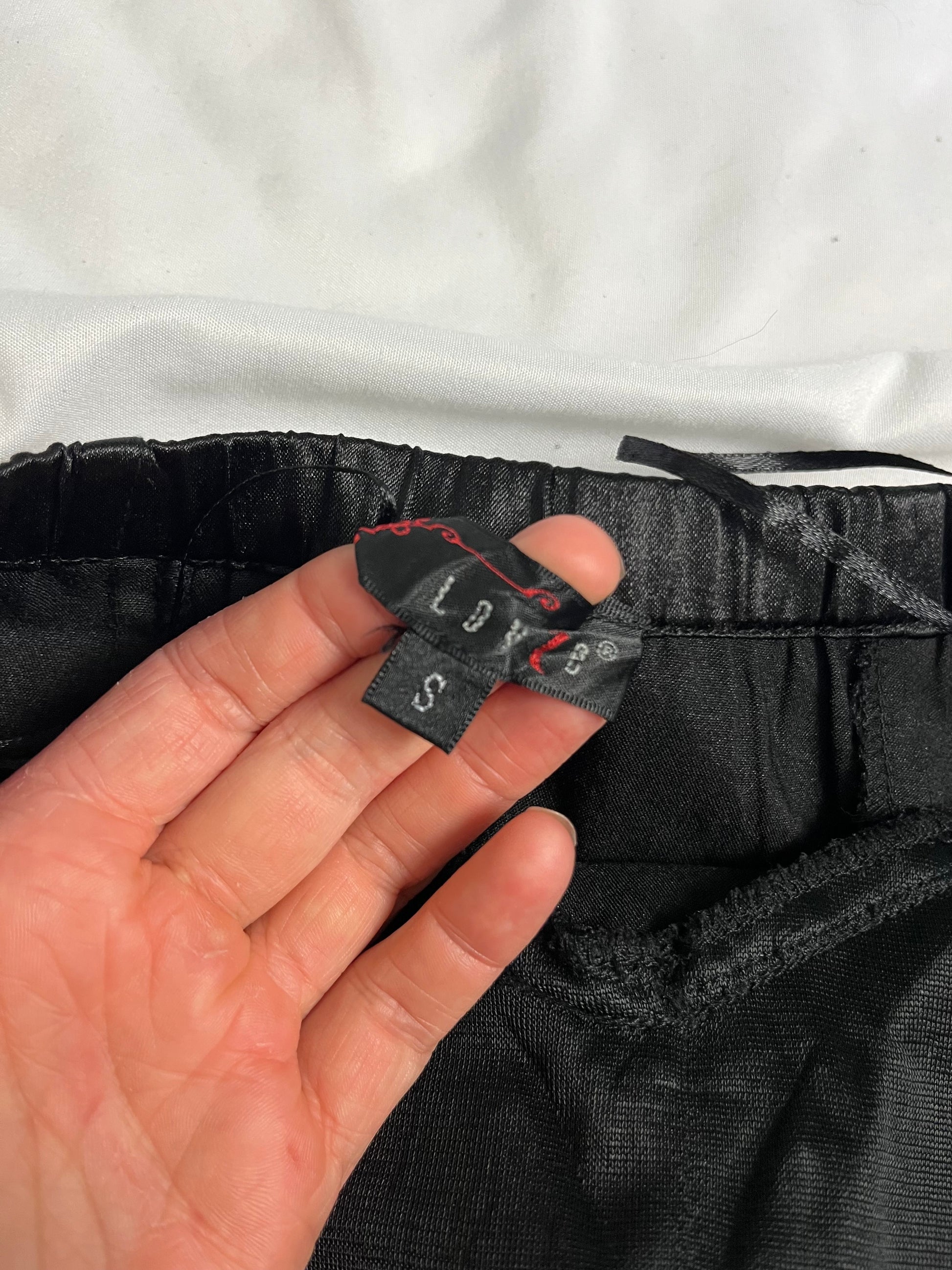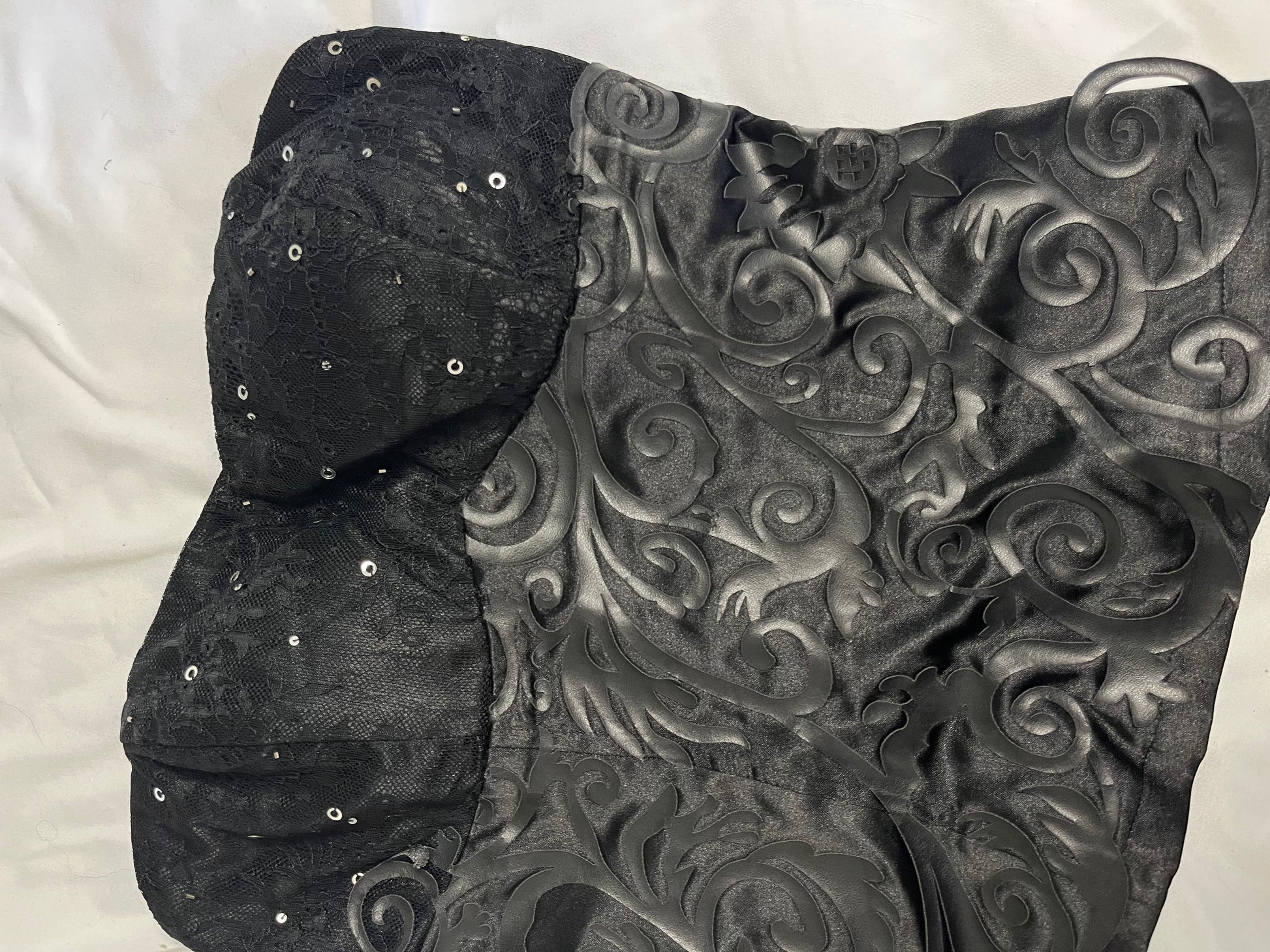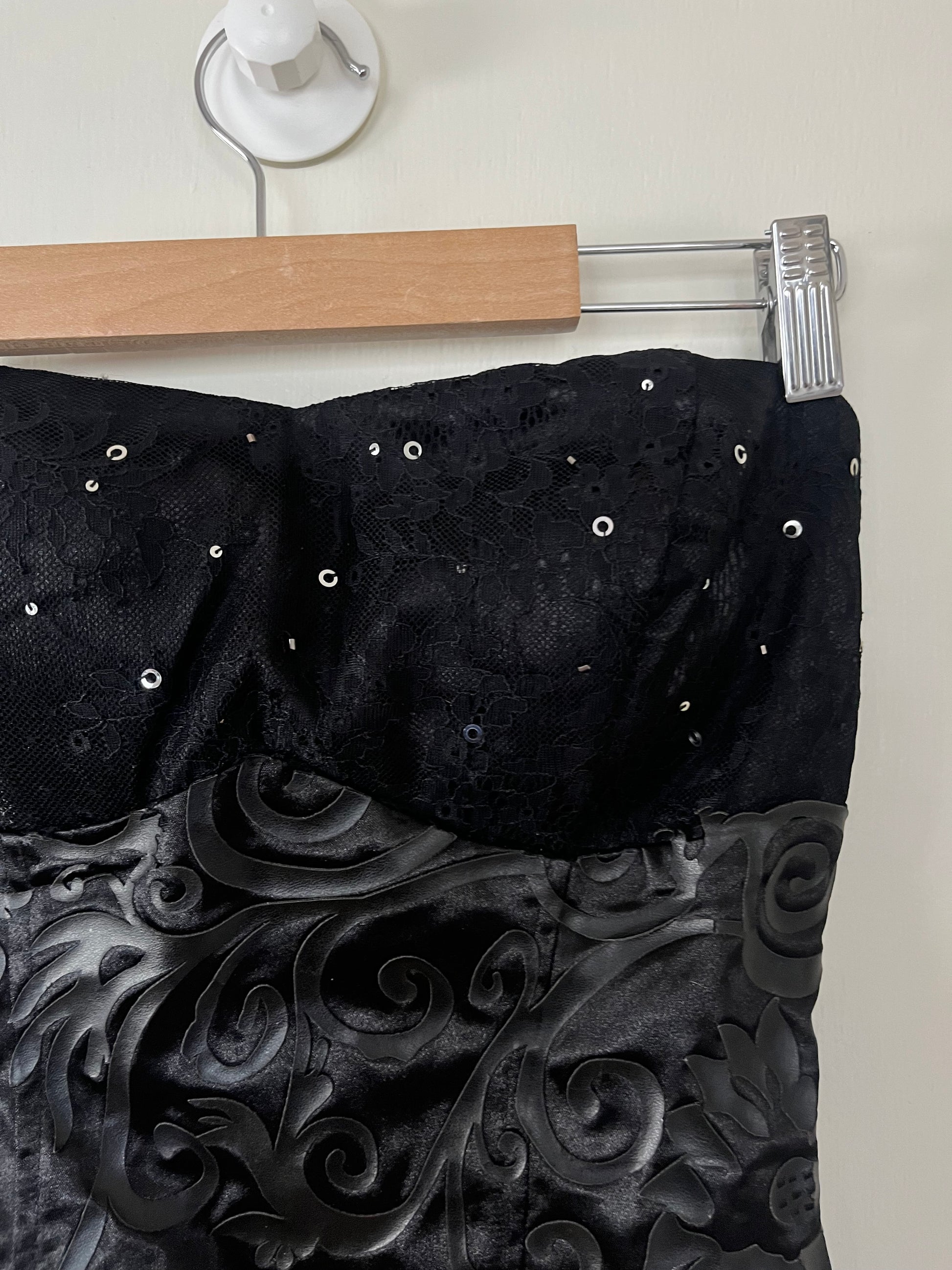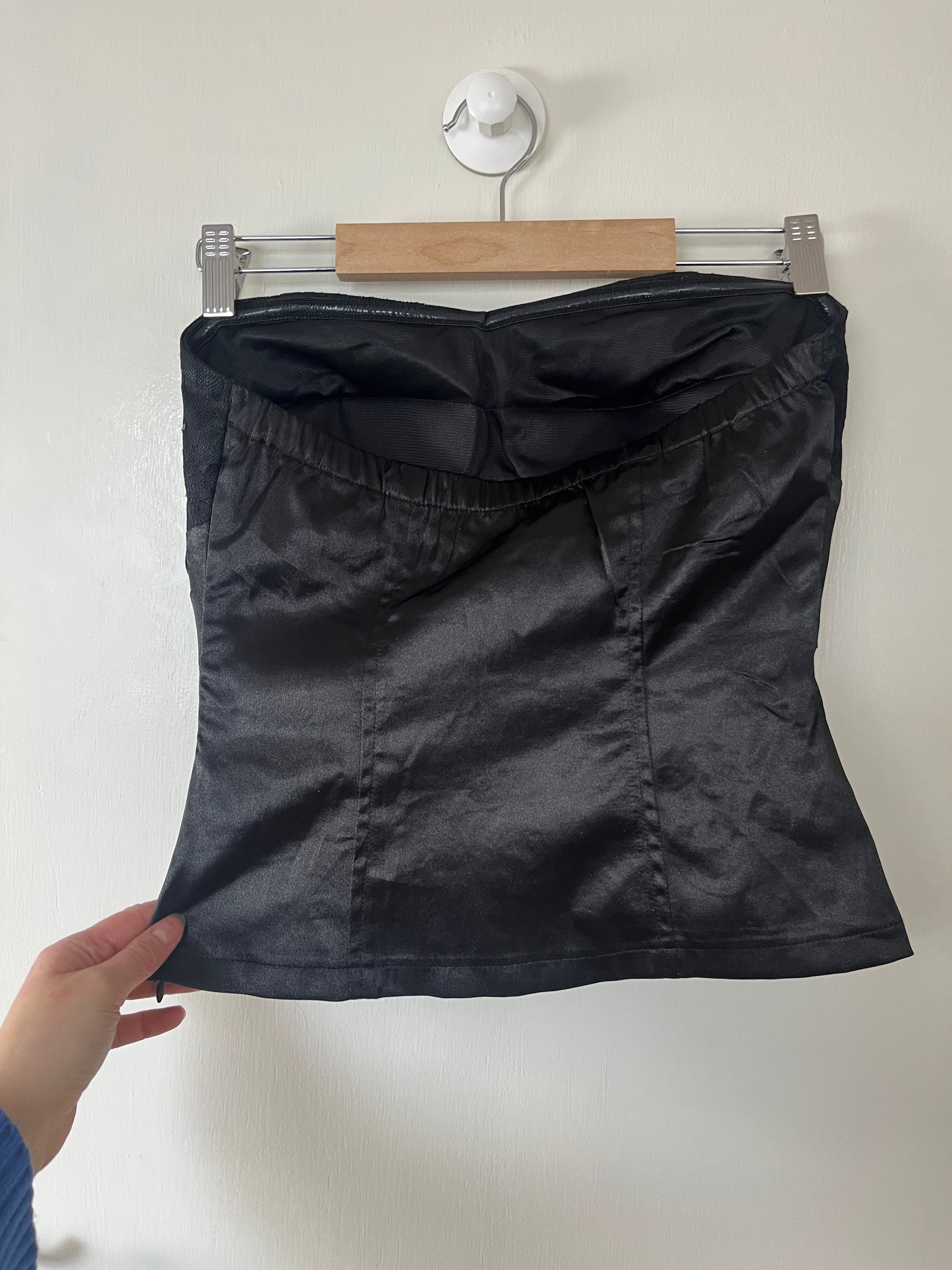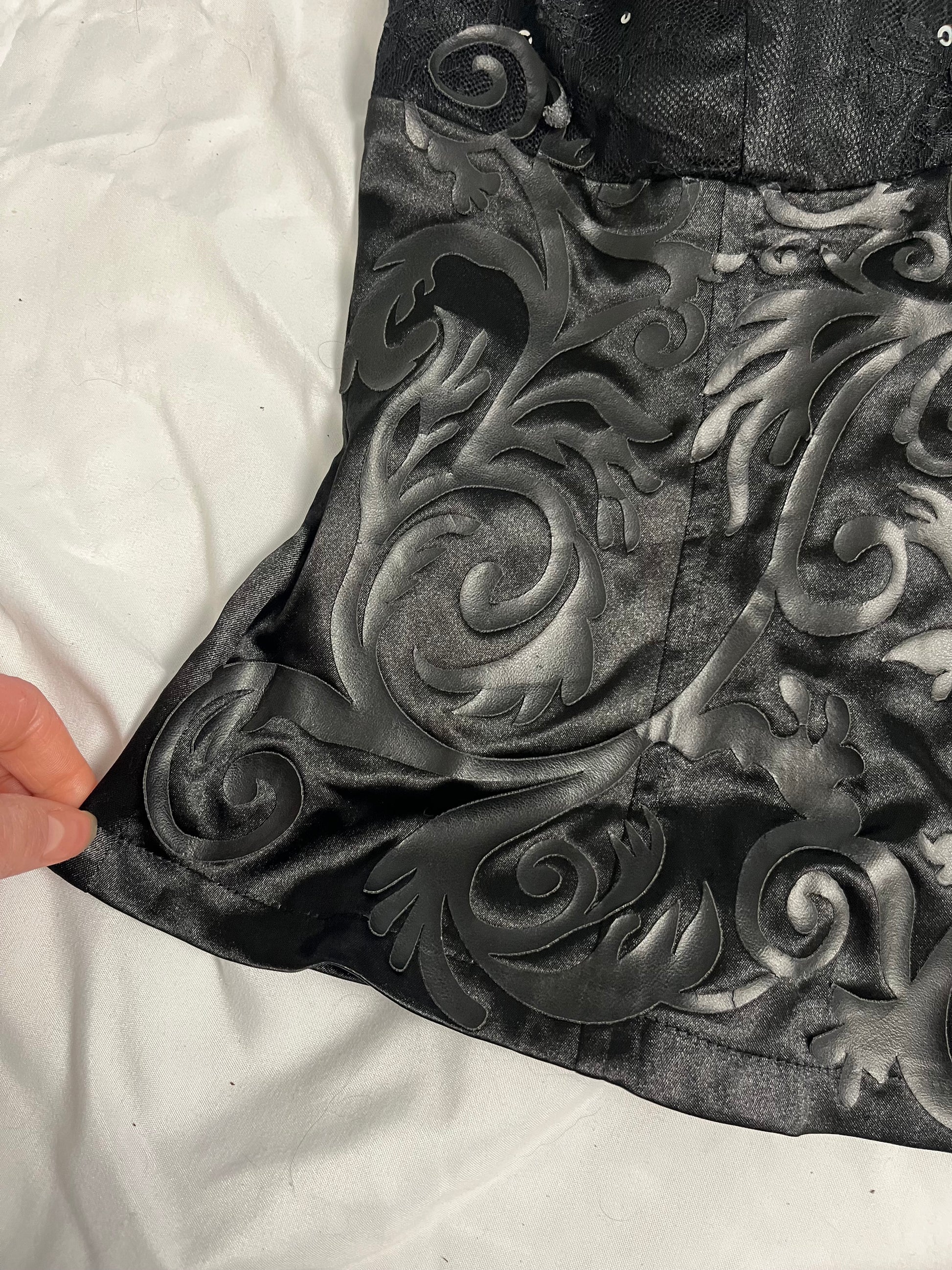 2000s black corset style top! This has a swirly design with sequins on the chest. Stretchy fit.