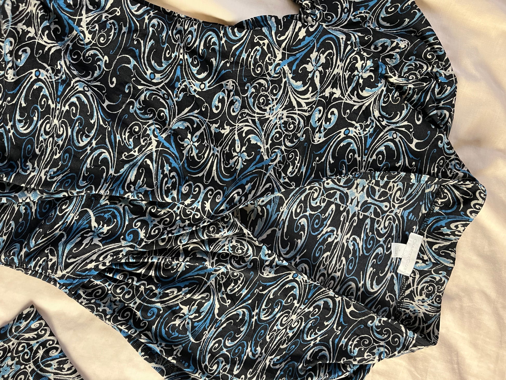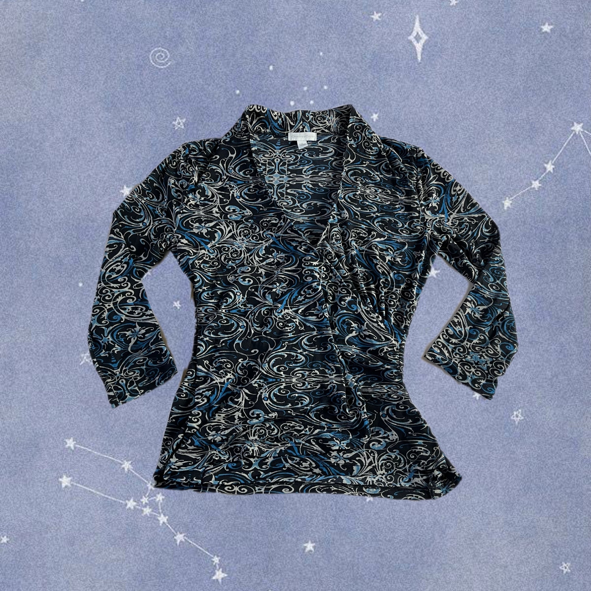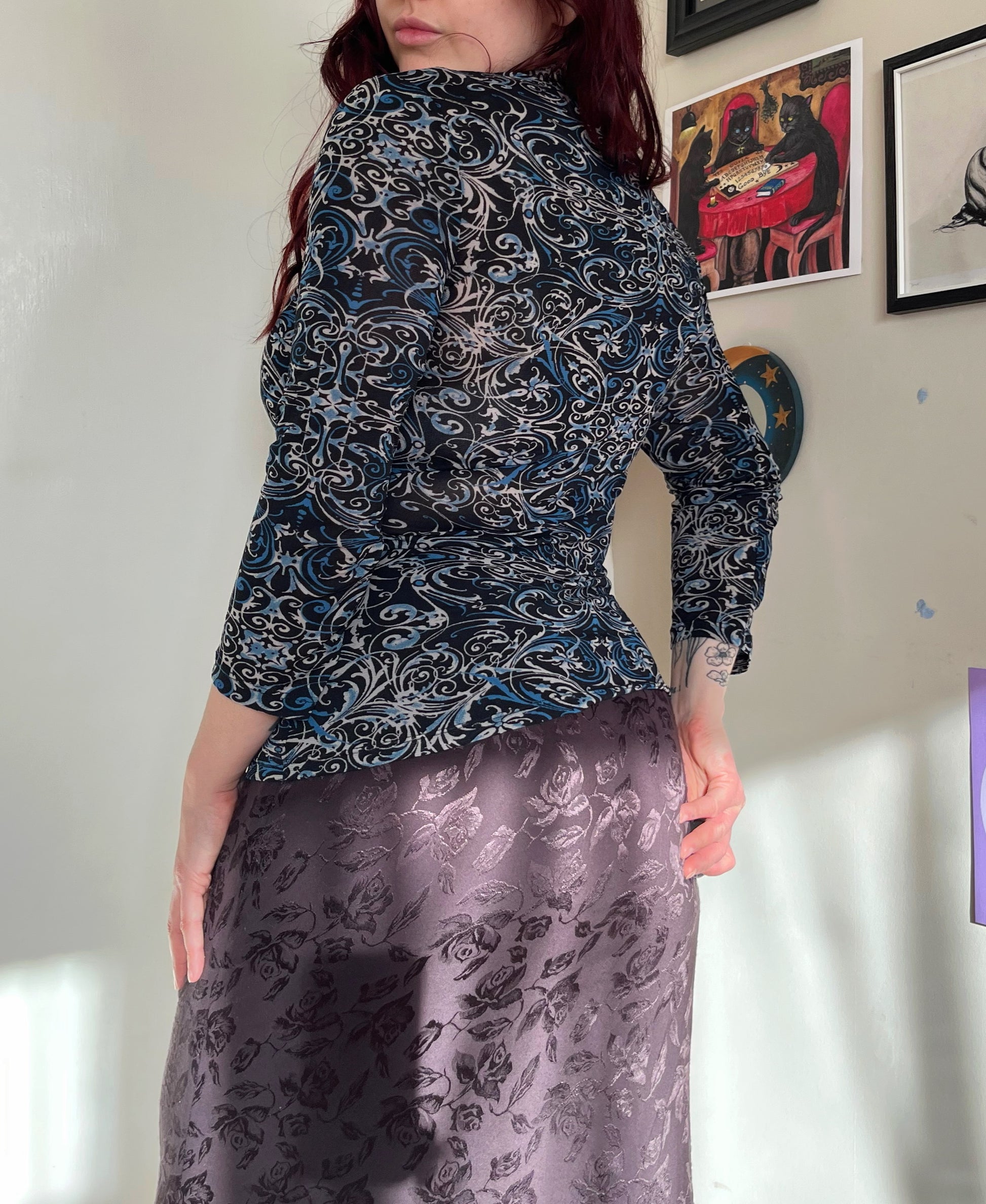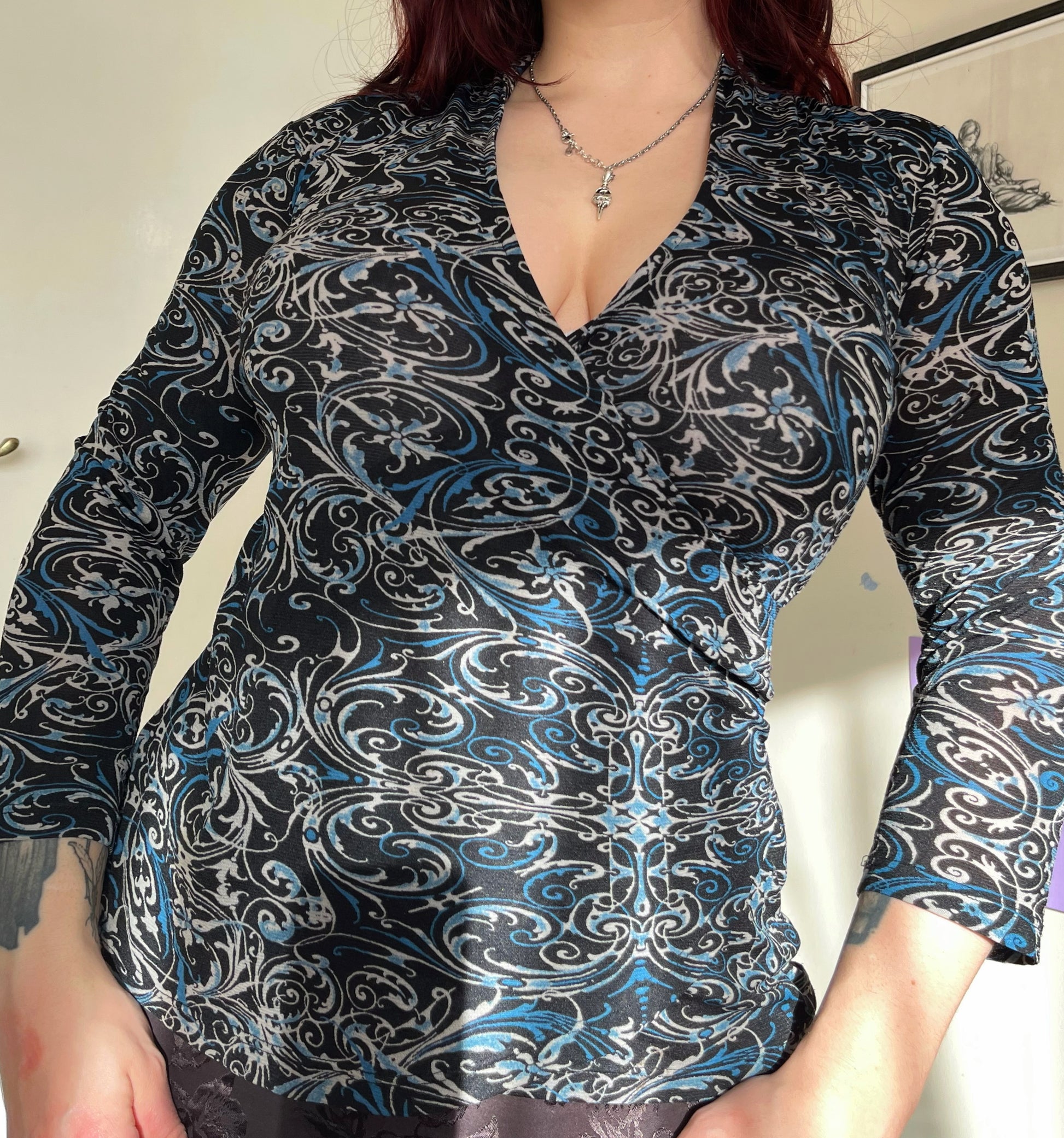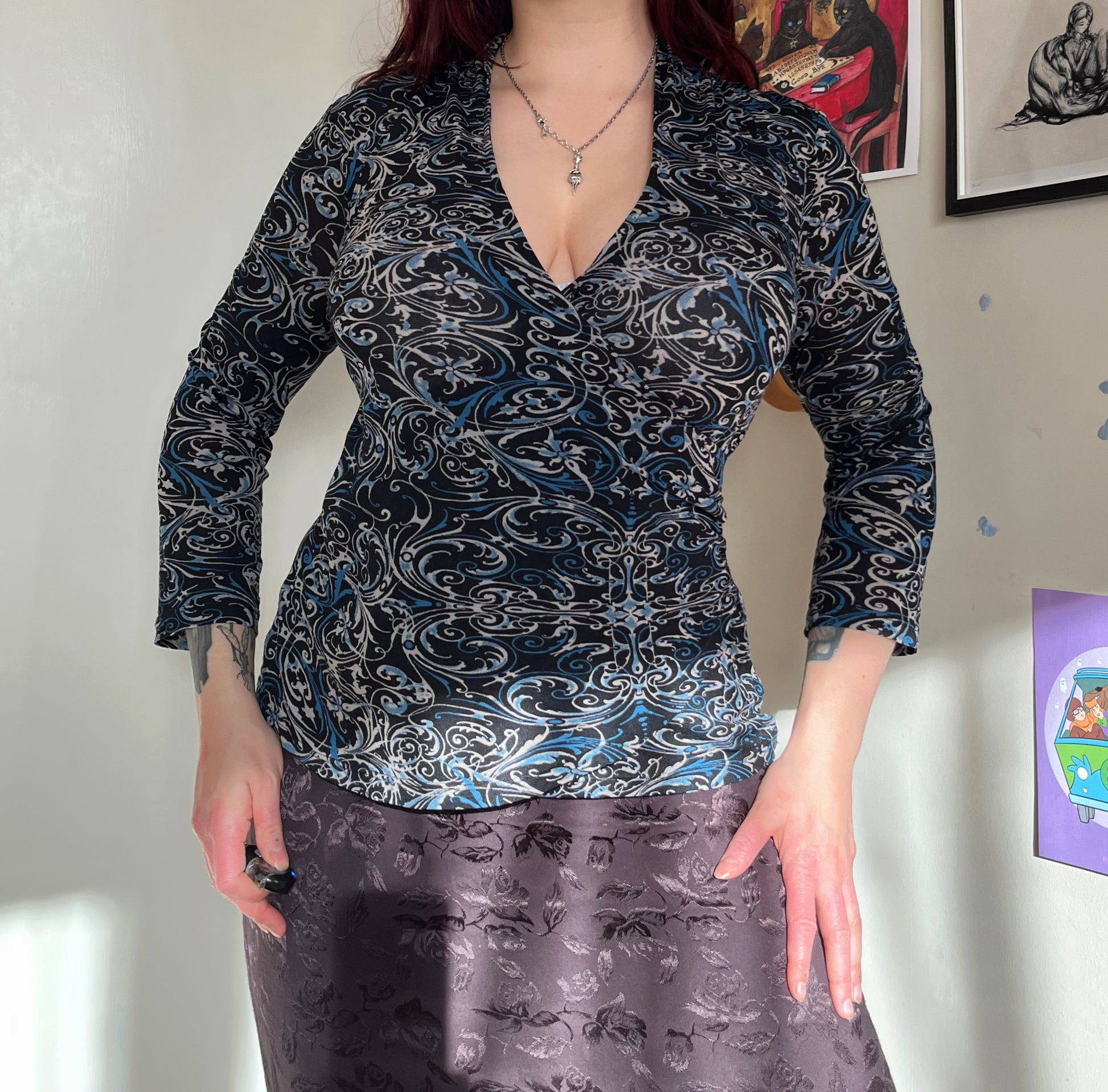 2000s blue and black mesh top! Stretchy fit with a cool design.