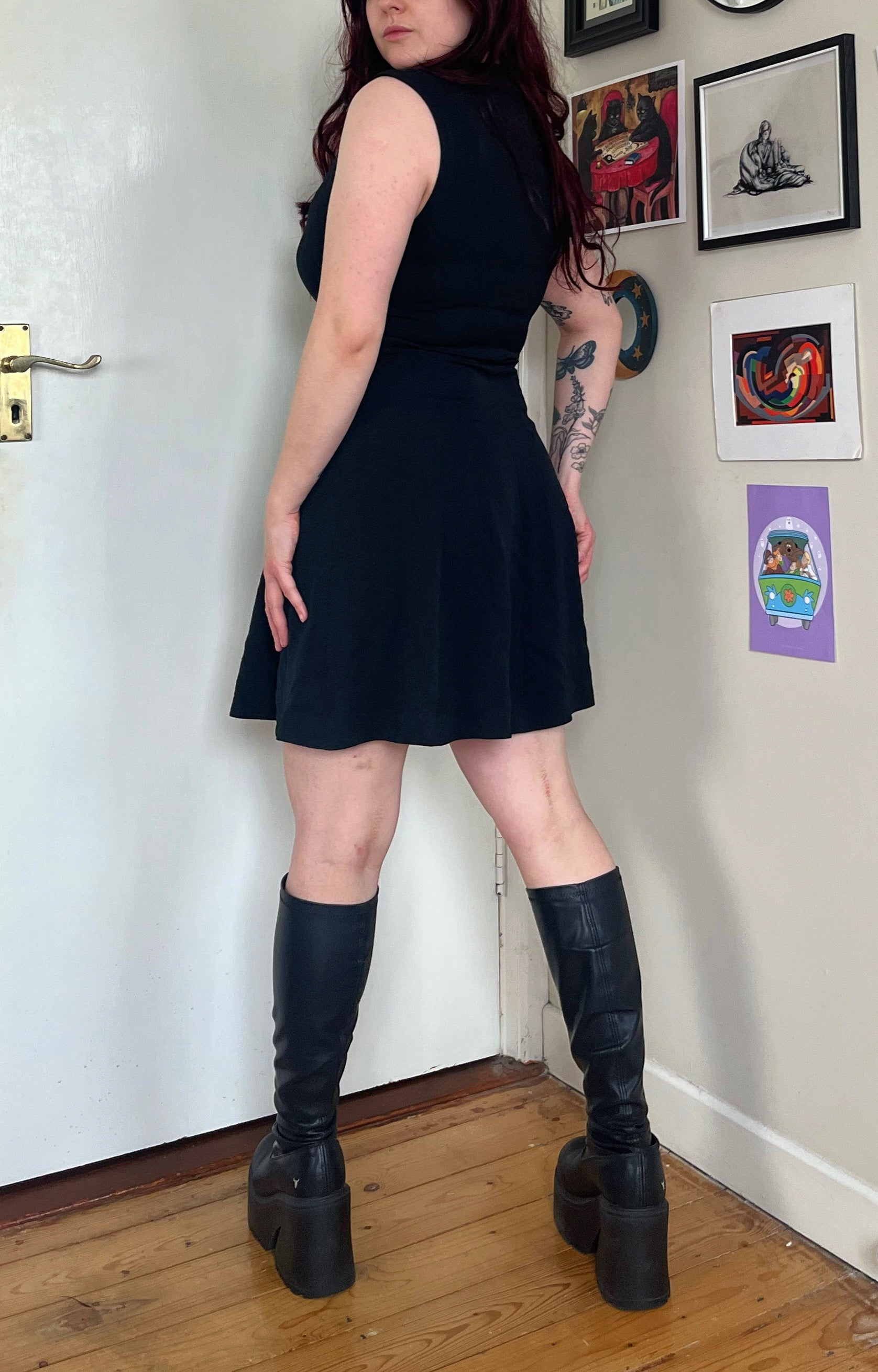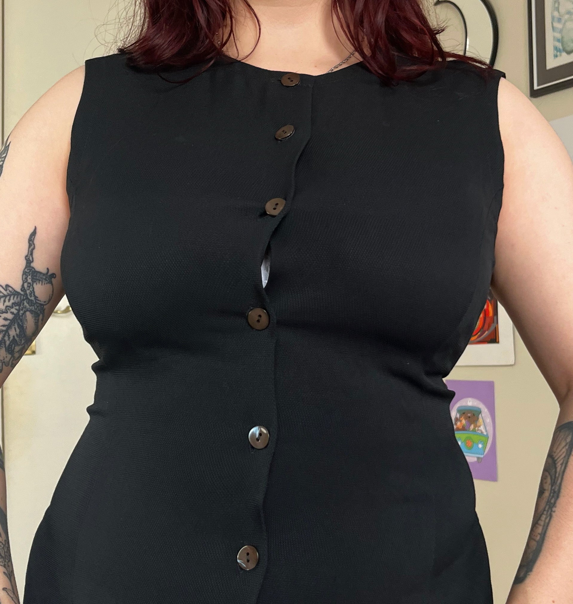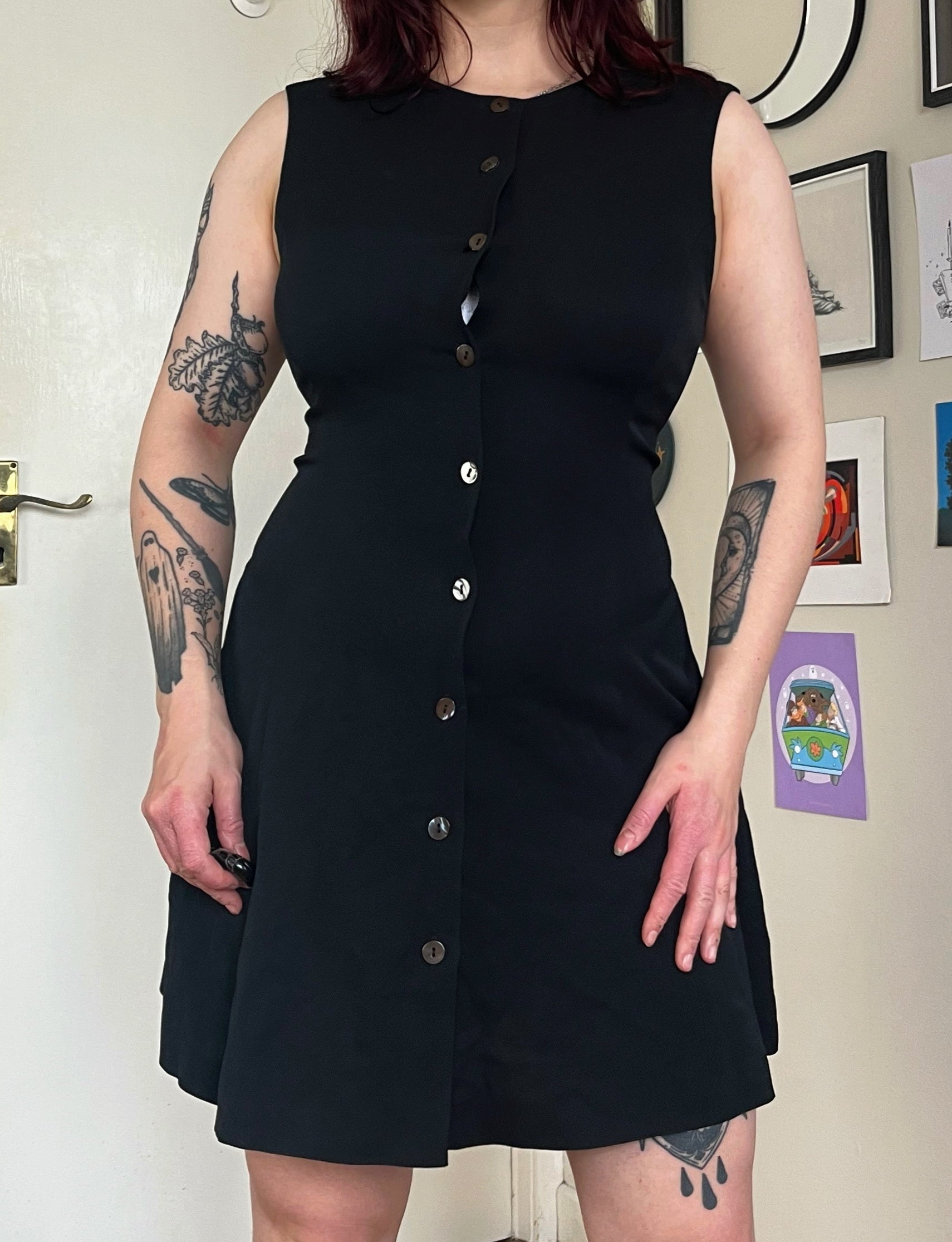 1990s black mini dress! Buttons up the front with a flattering fit.