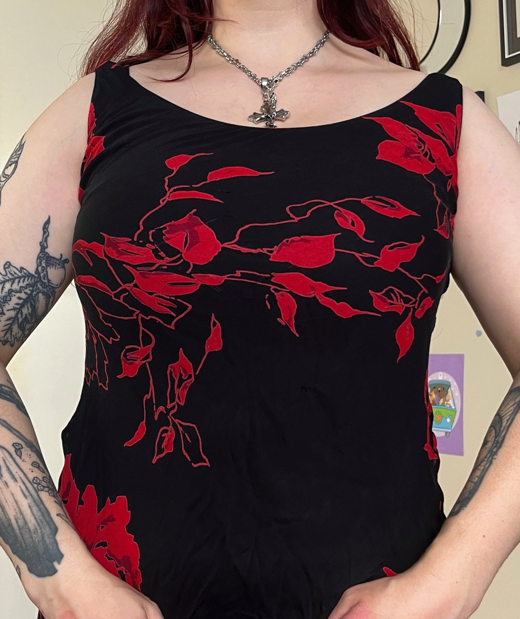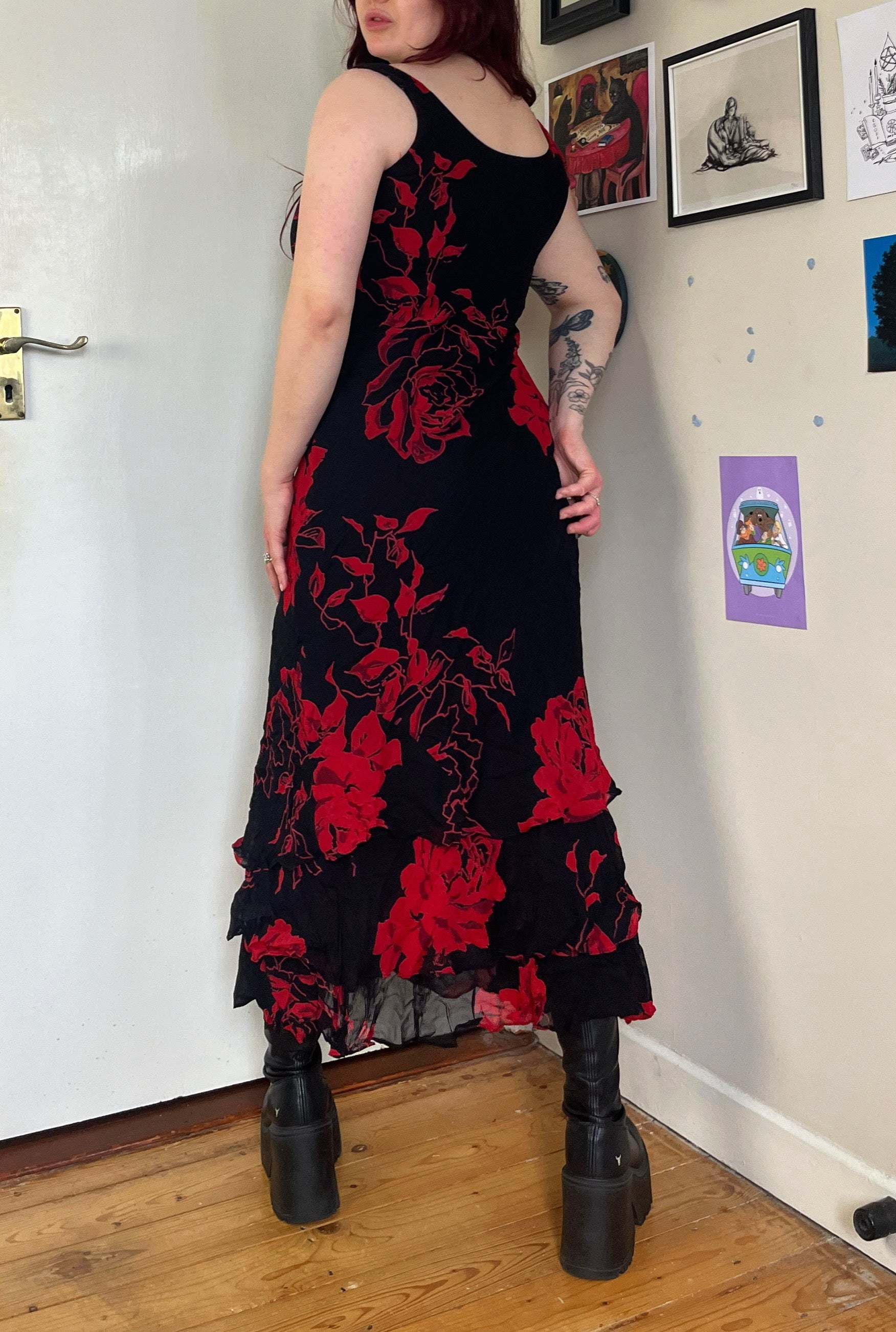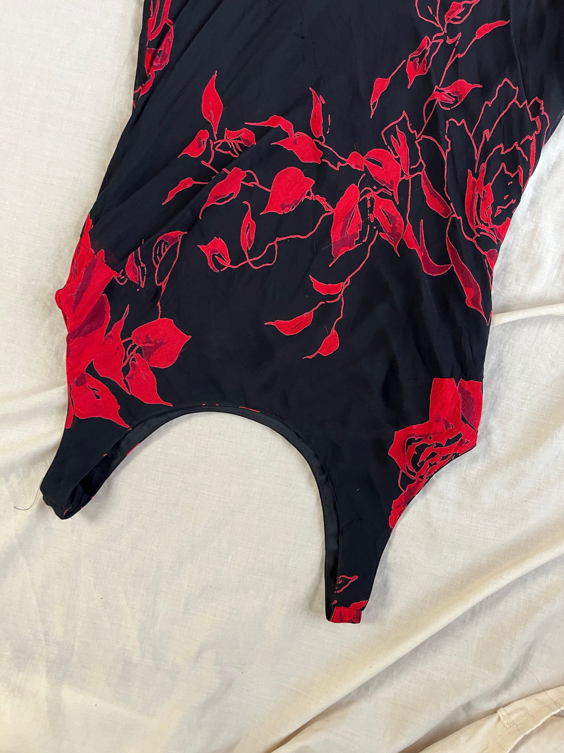 Gorgeous 1990s red and black floral design mesh maxi dress! This has some slight stretch to it and a maxi length fit.
