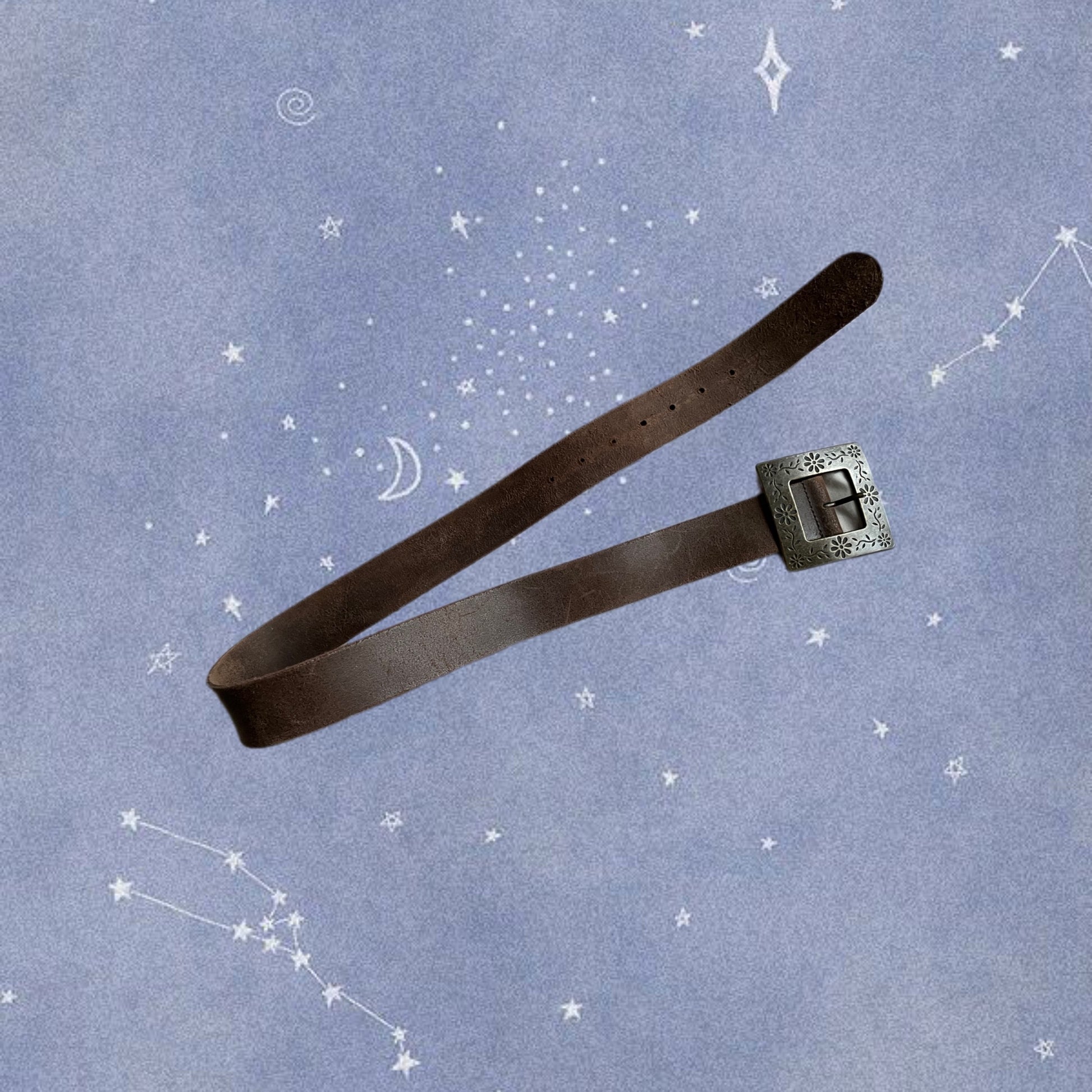 Gorgeous brown leather 90s belt. This has a floral design on the buckle.