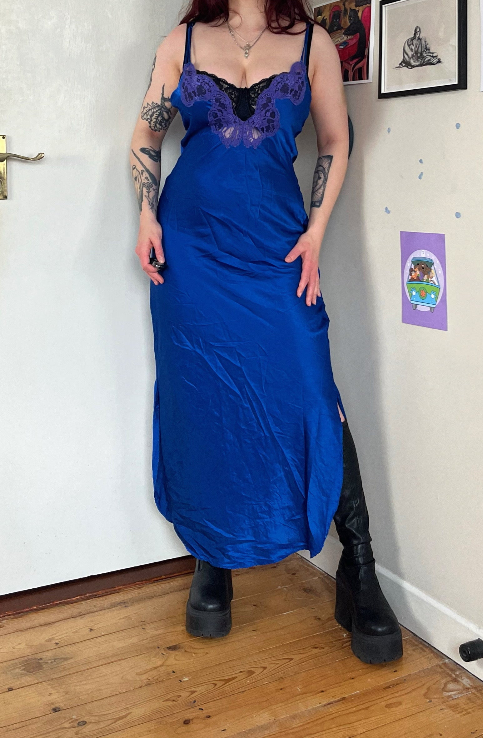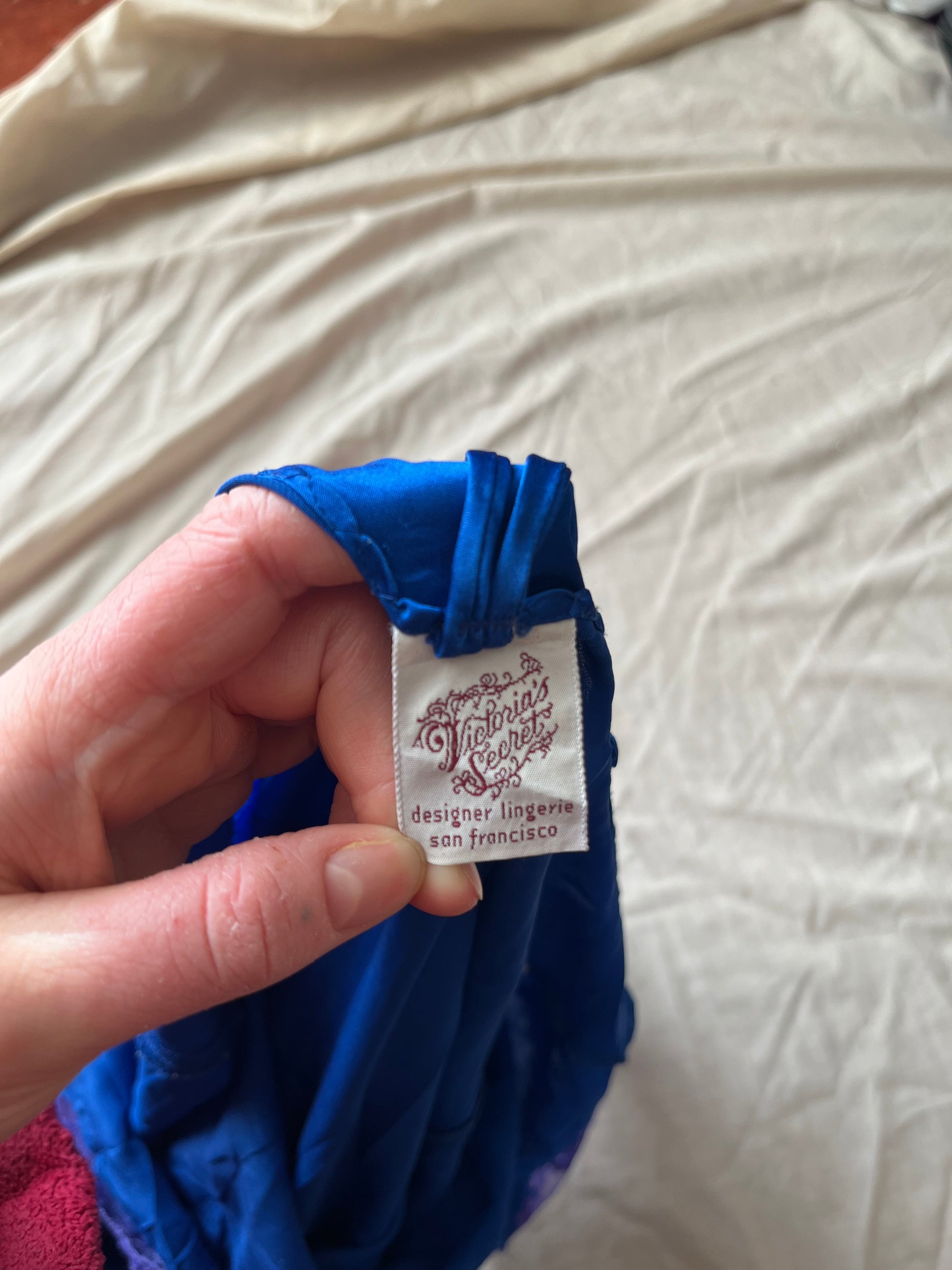 Amazing 1977 blue and purple slip dress by Victoria's Secret! Has a loose and comfy fit and a butterfly lace design on the front.