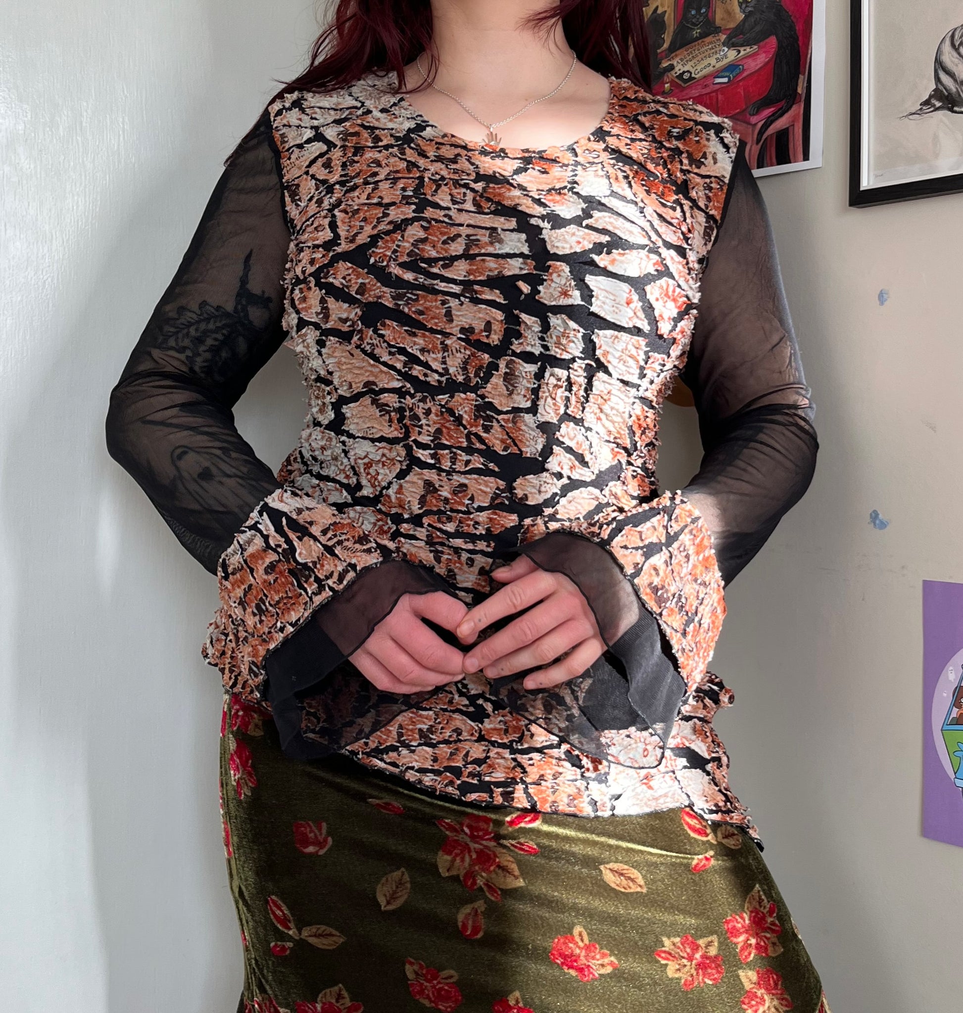 1990s/2000s mesh top with flared sleeves and a cool pattern! Asymmetrical hem with a stretchy fit.