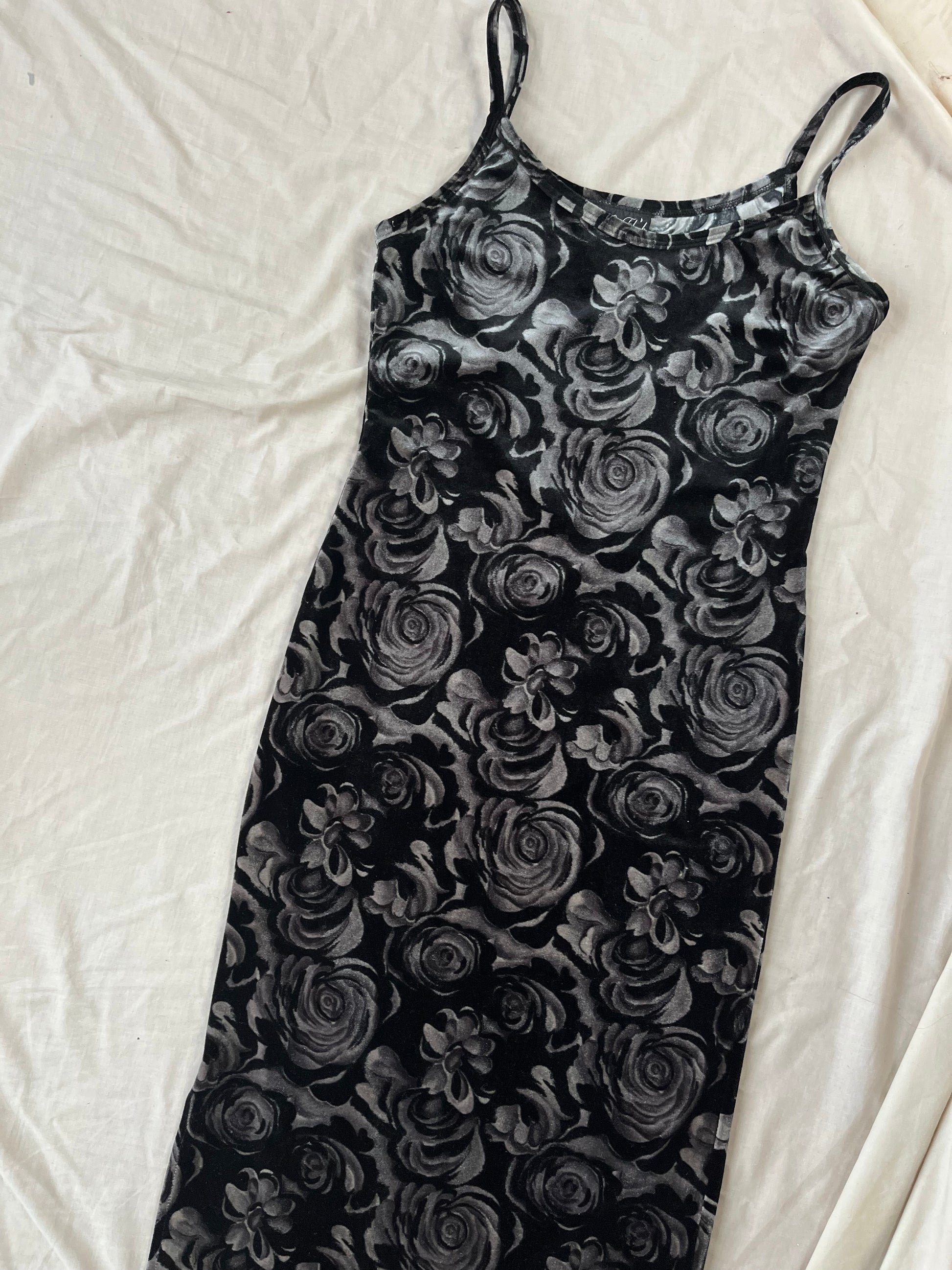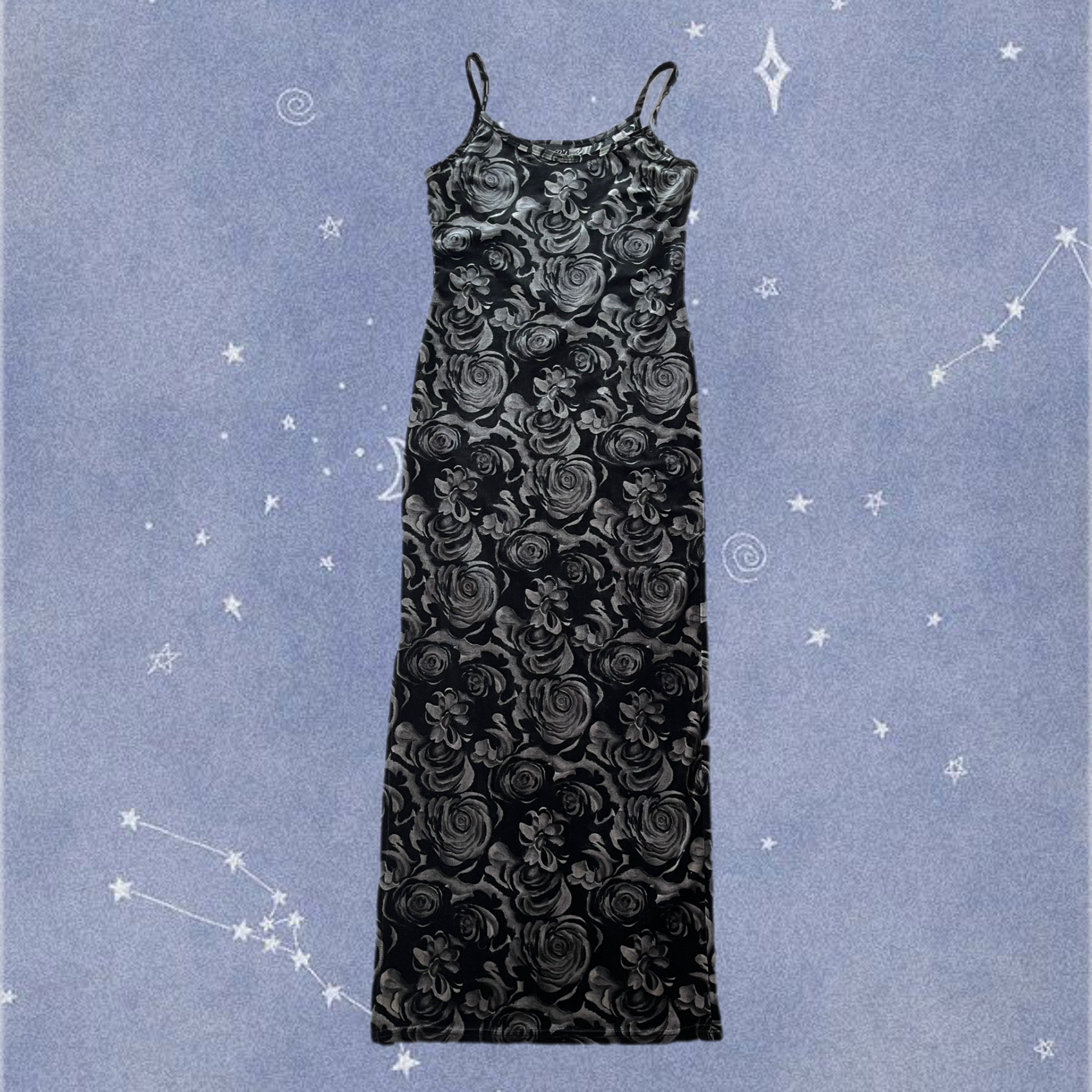 Stunning 1990s black and grey velvet maxi dress! This has a stretchy fit, flattering shape and a floral design all over.