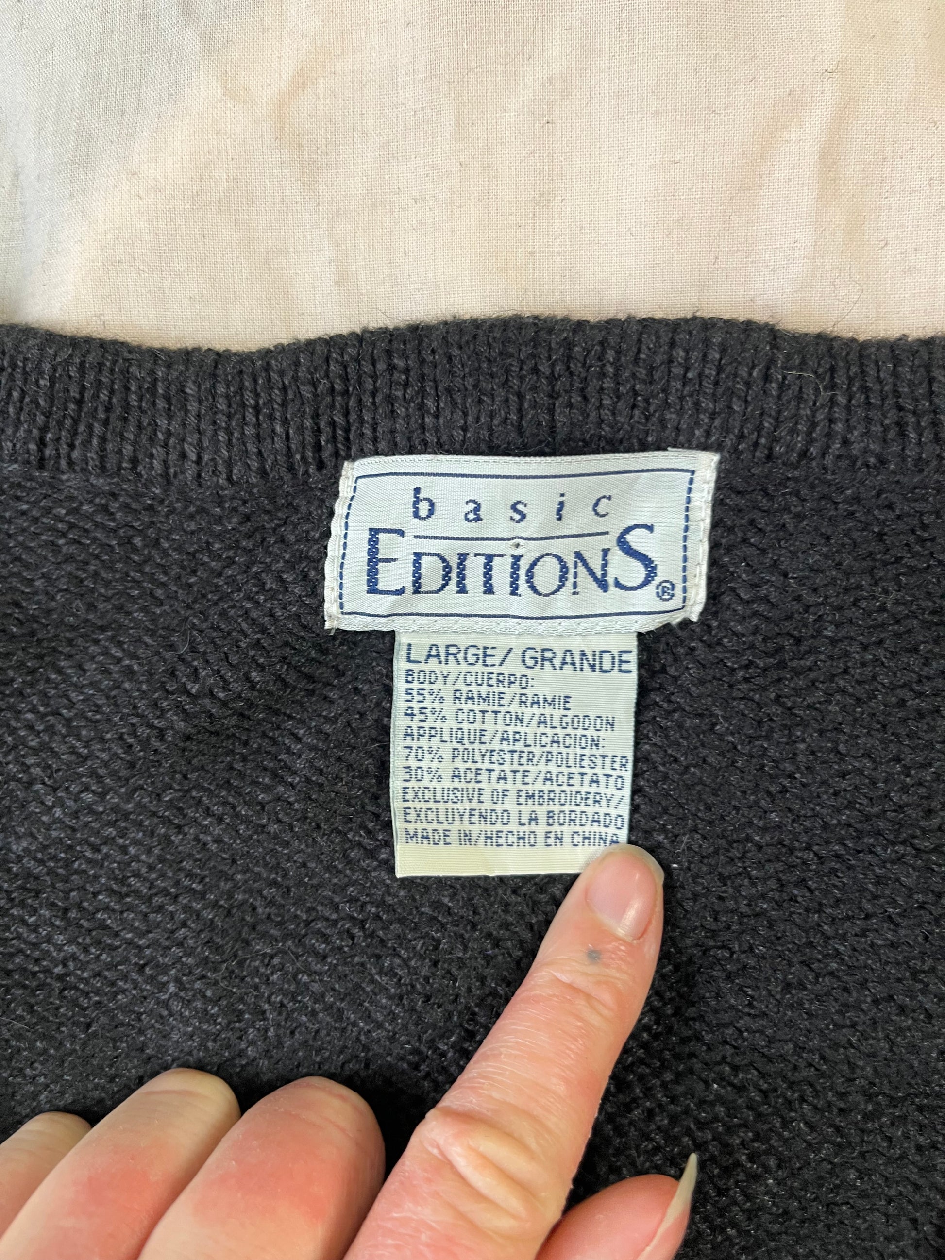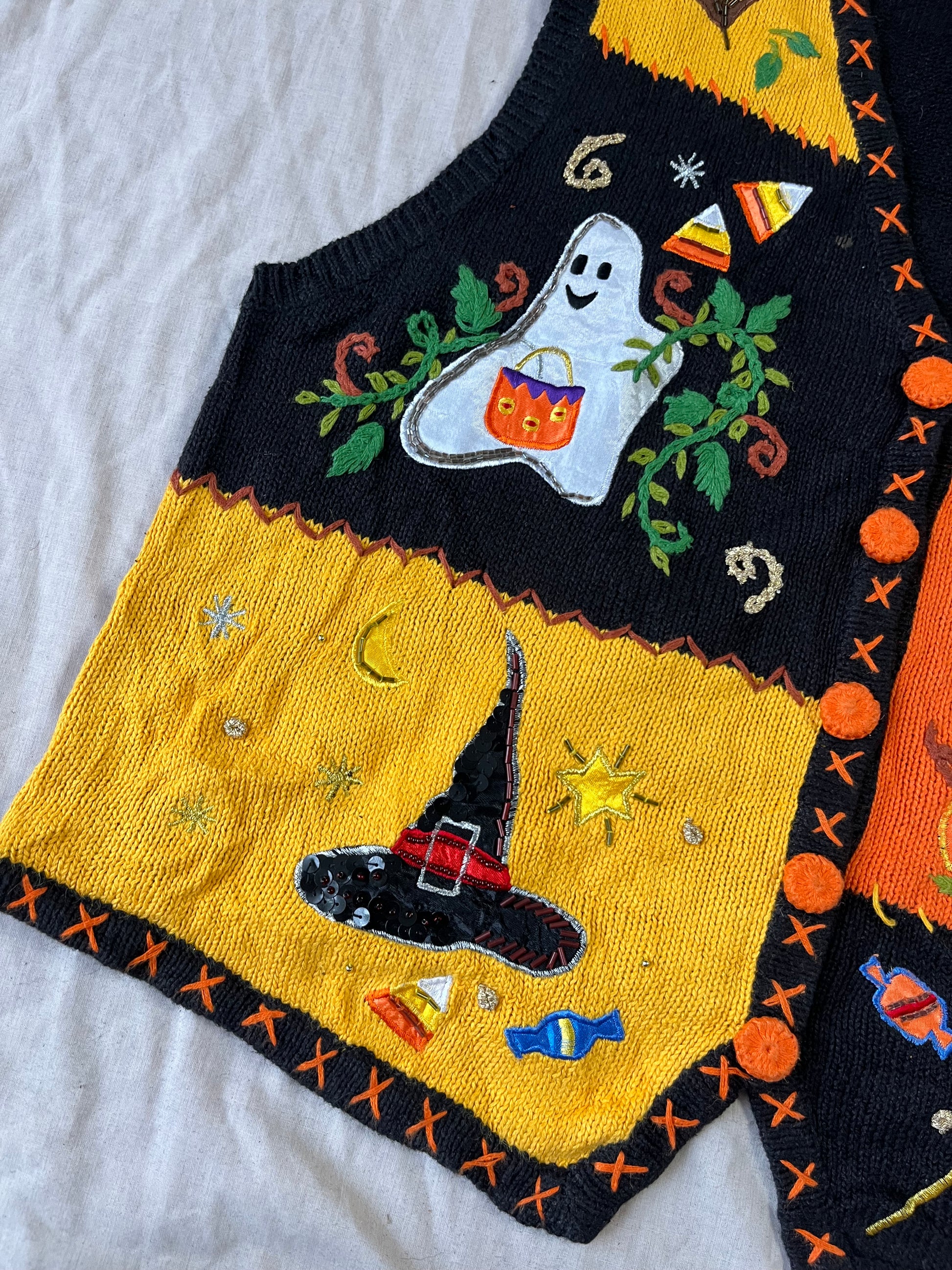 1990s Halloween button up front sweater vest! Has a patchwork Halloween design on the front. Labelled L, fits like true to size.