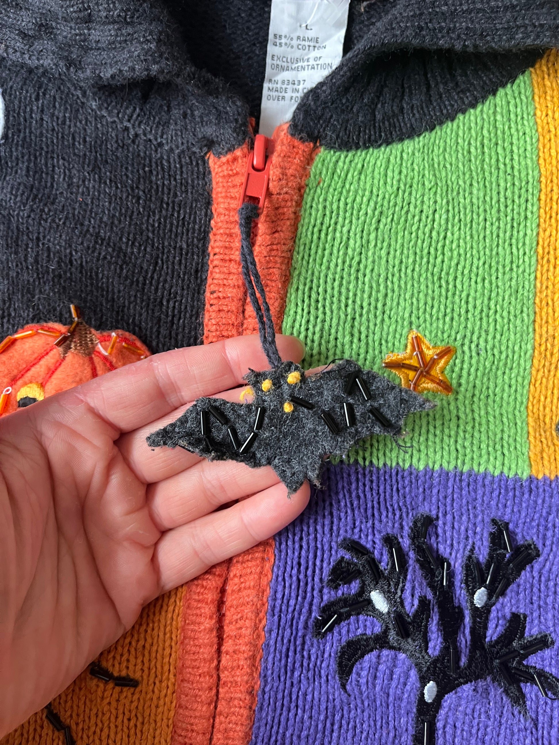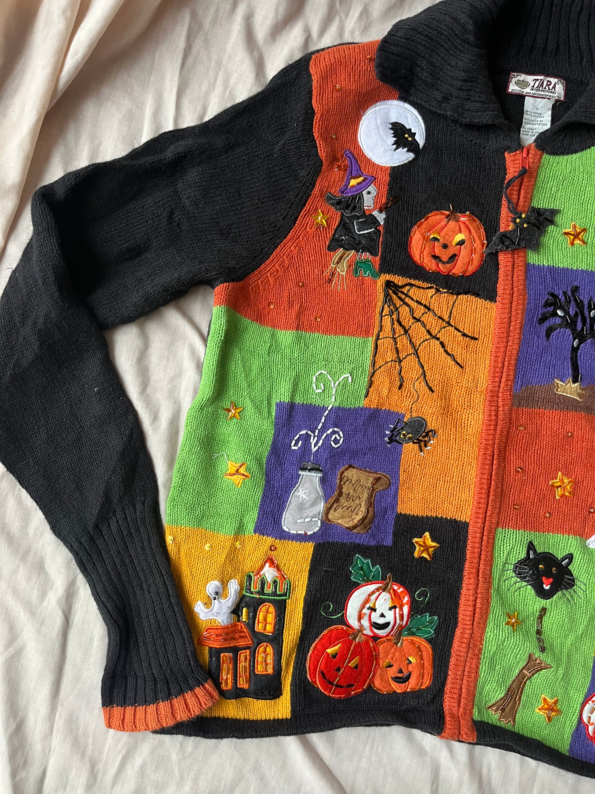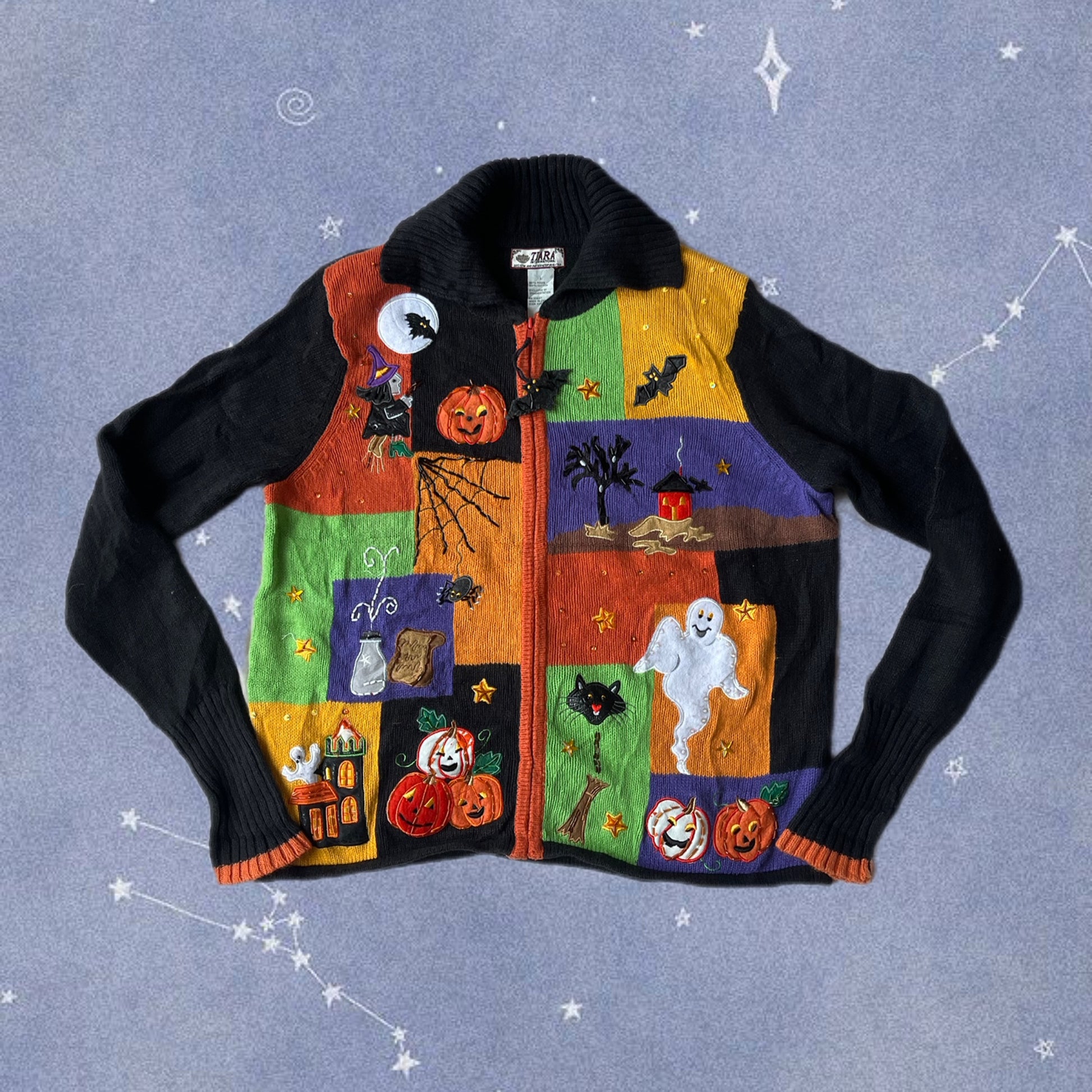 1990s Halloween zip up front cardigan! Has a patchwork Halloween design and a zipper on the front with a bat on it! Labelled L, fits like M-L.