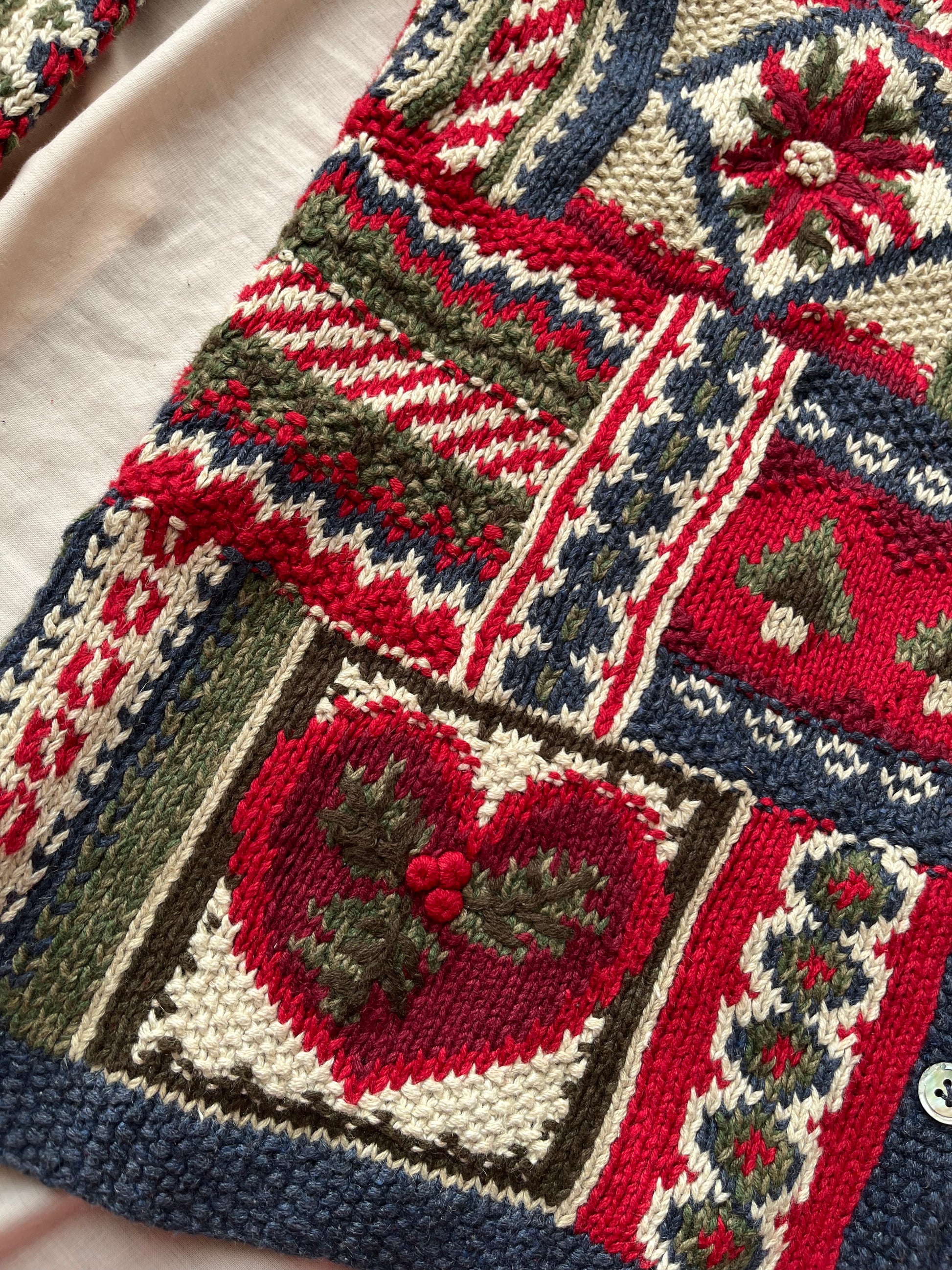 1990s festive cardigan! Features a button up front and a design of trees, hearts and holly.