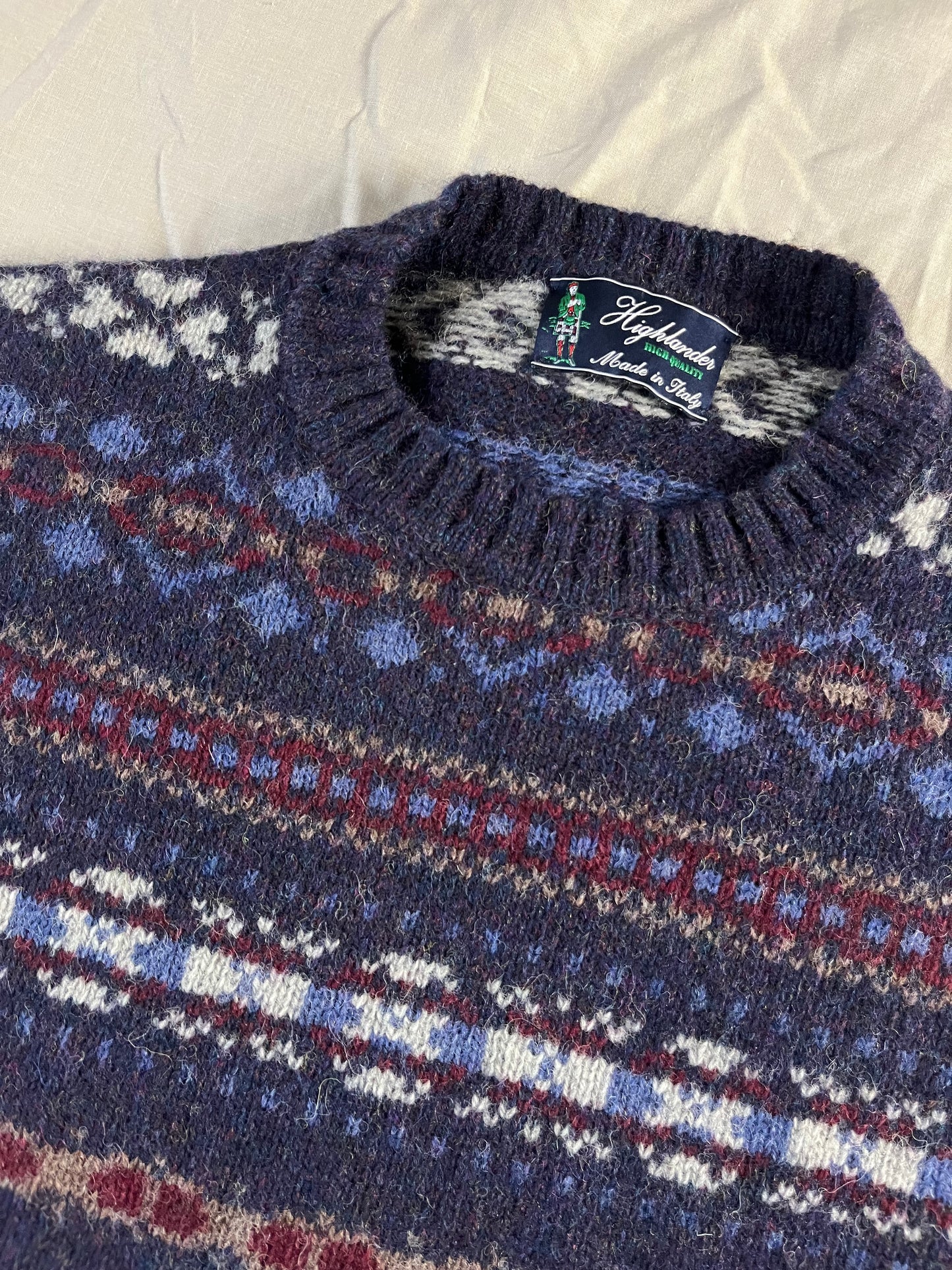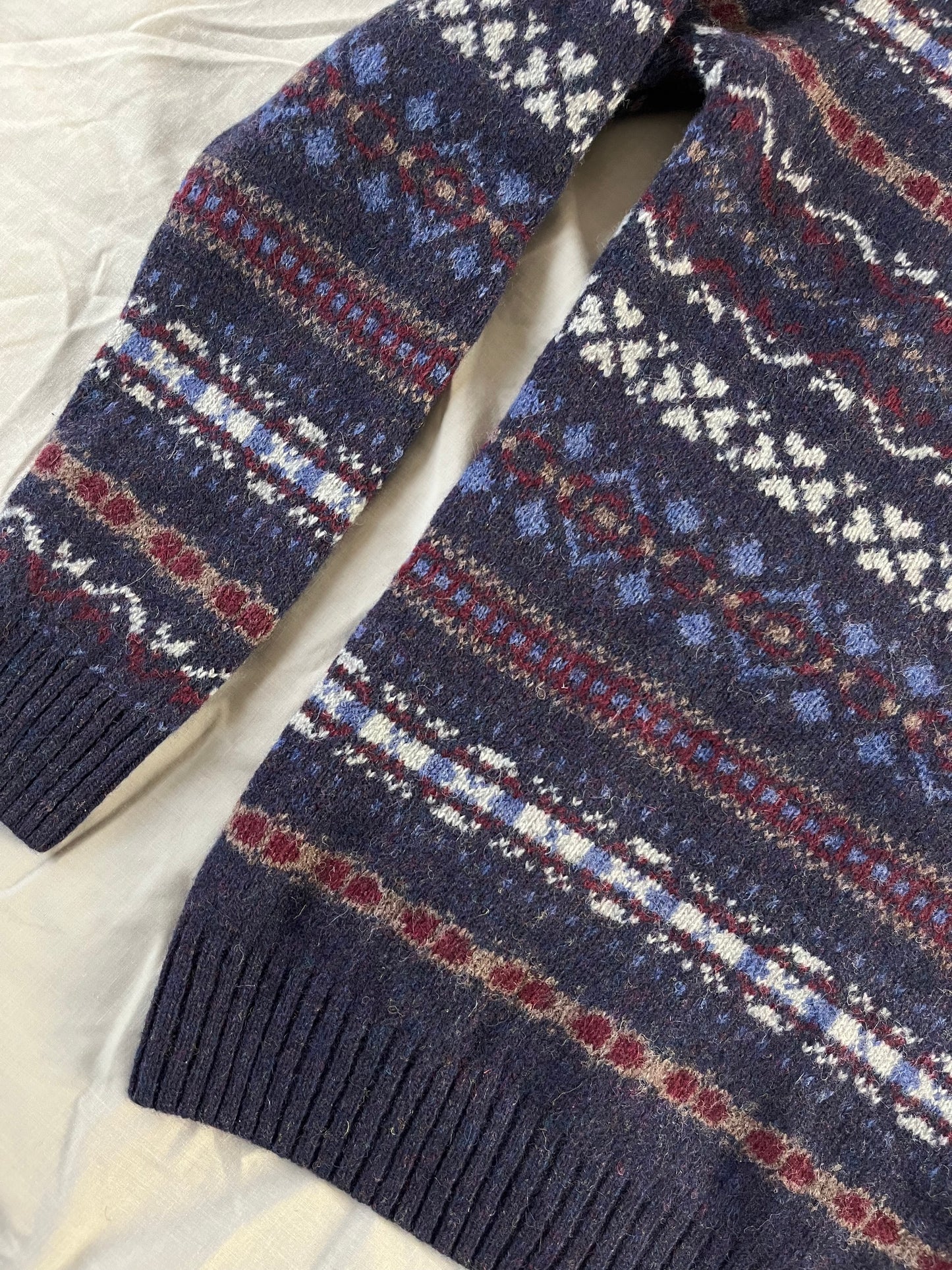 Gorgeous 90s blue and purple patterned jumper! Super cosy and chunky fit. In perfect vintage condition and would best fit UK 6-16 depending on desired fit. Made from wool.