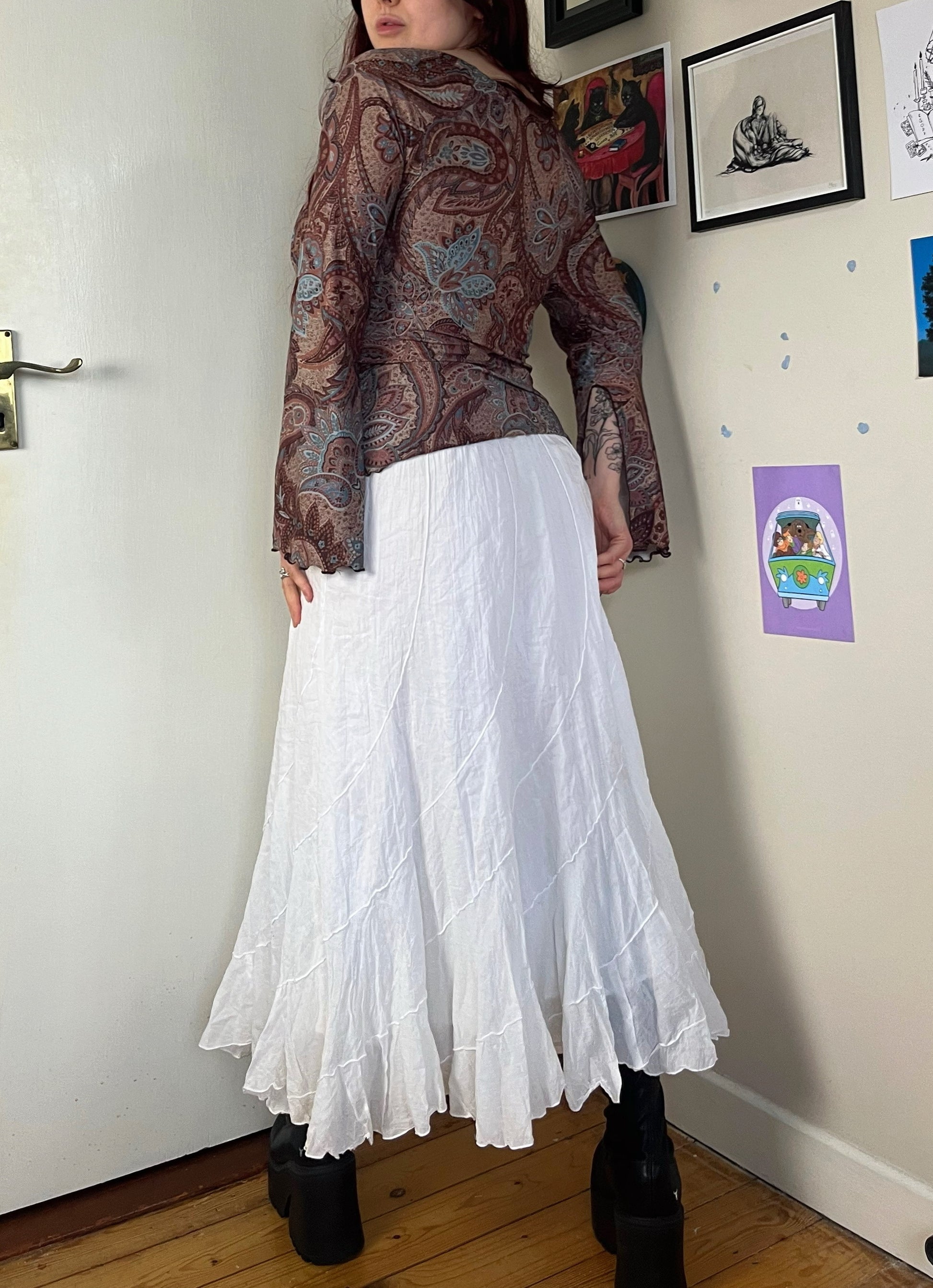 2000s long white skirt! This has a stretchy waist and a tiered shape to it.