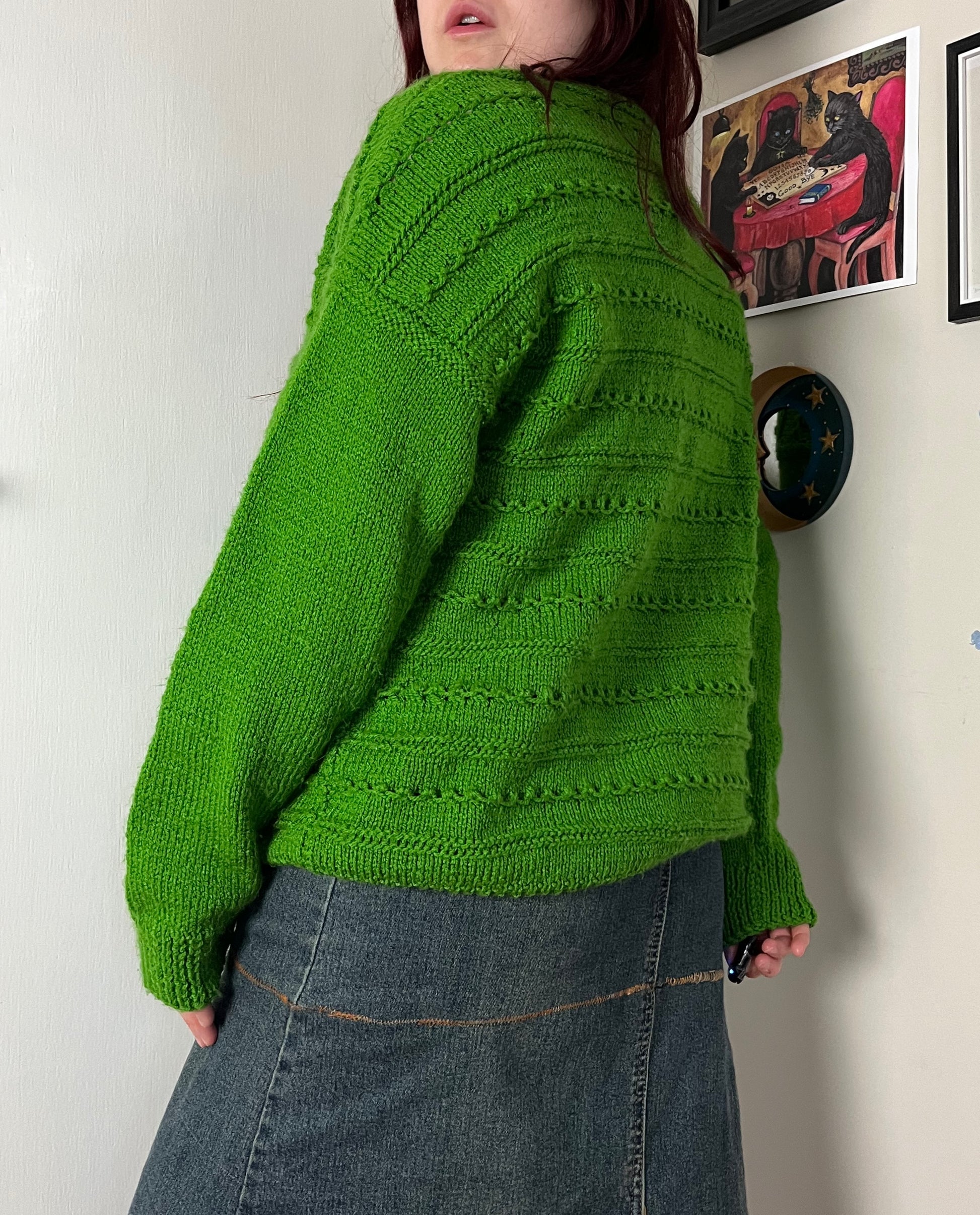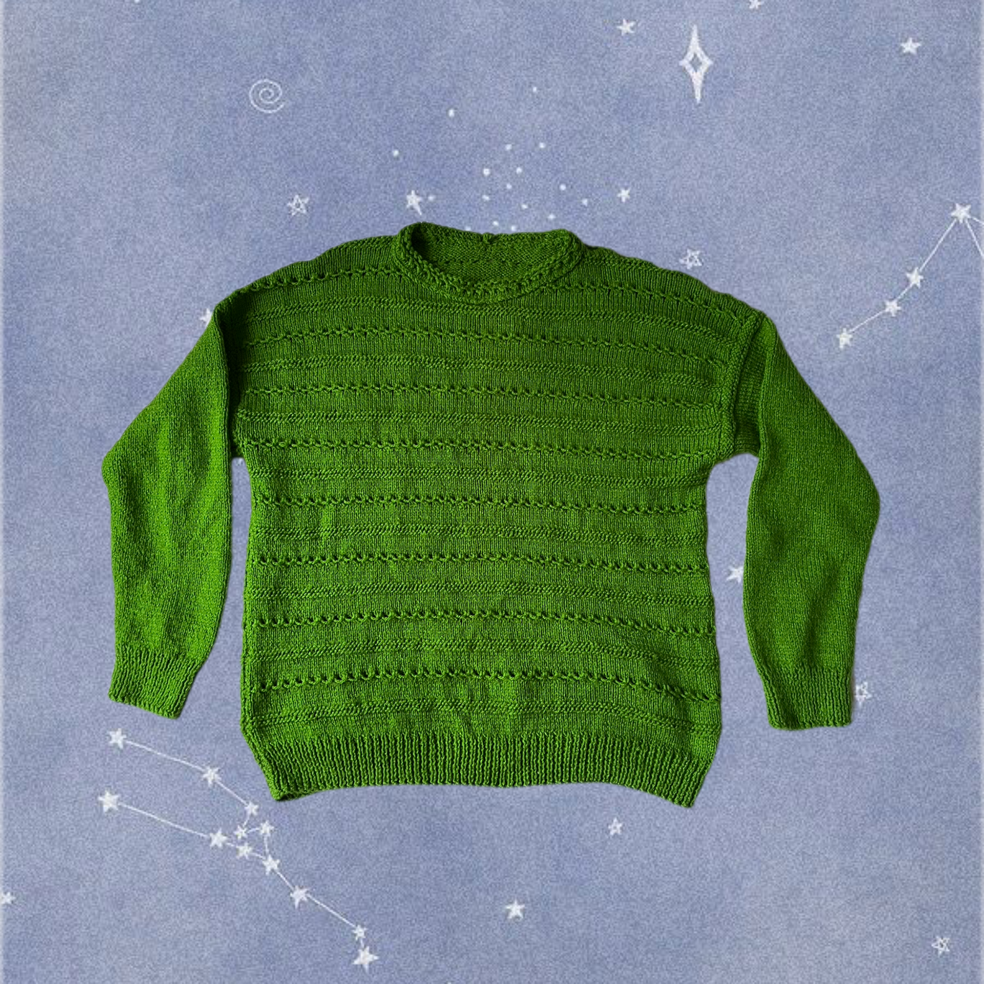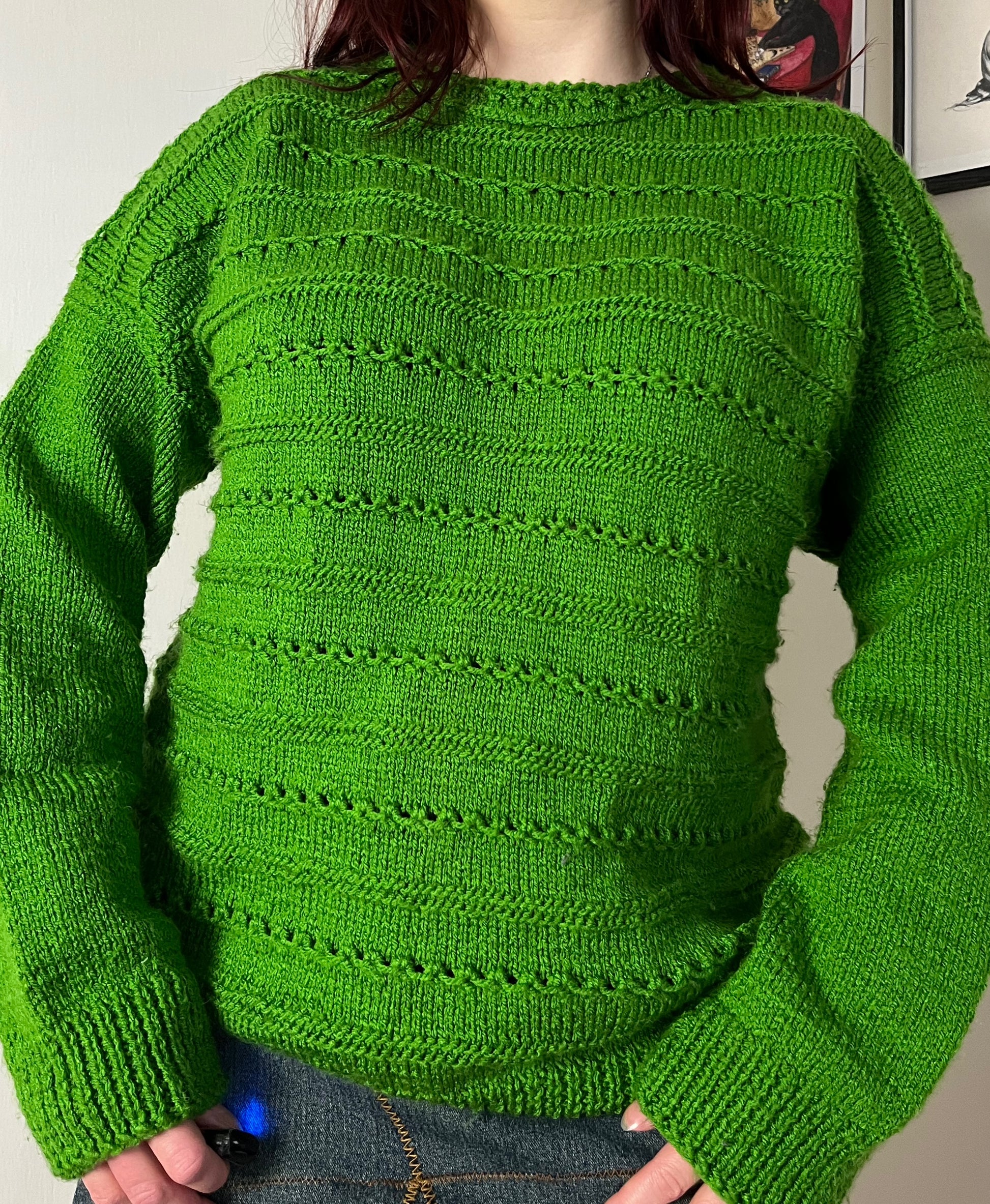 Mossy green cable knit style jumper! This is a handmade piece made from acrylic materials. Super soft and cosy.