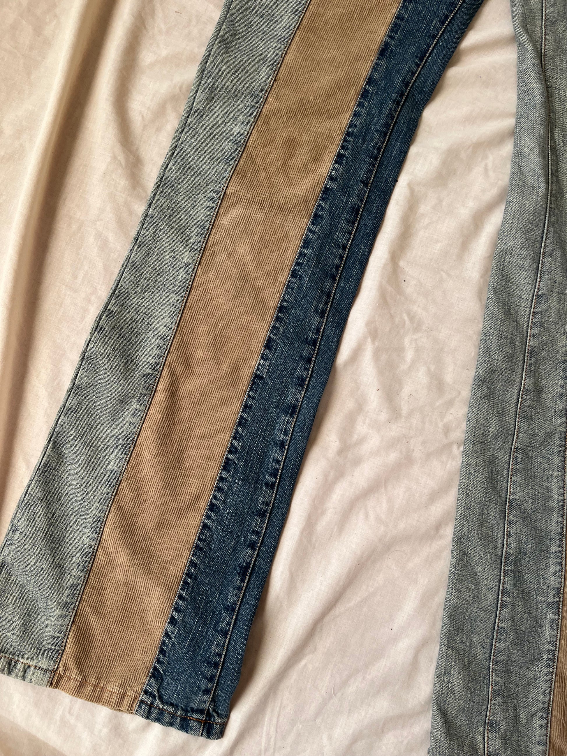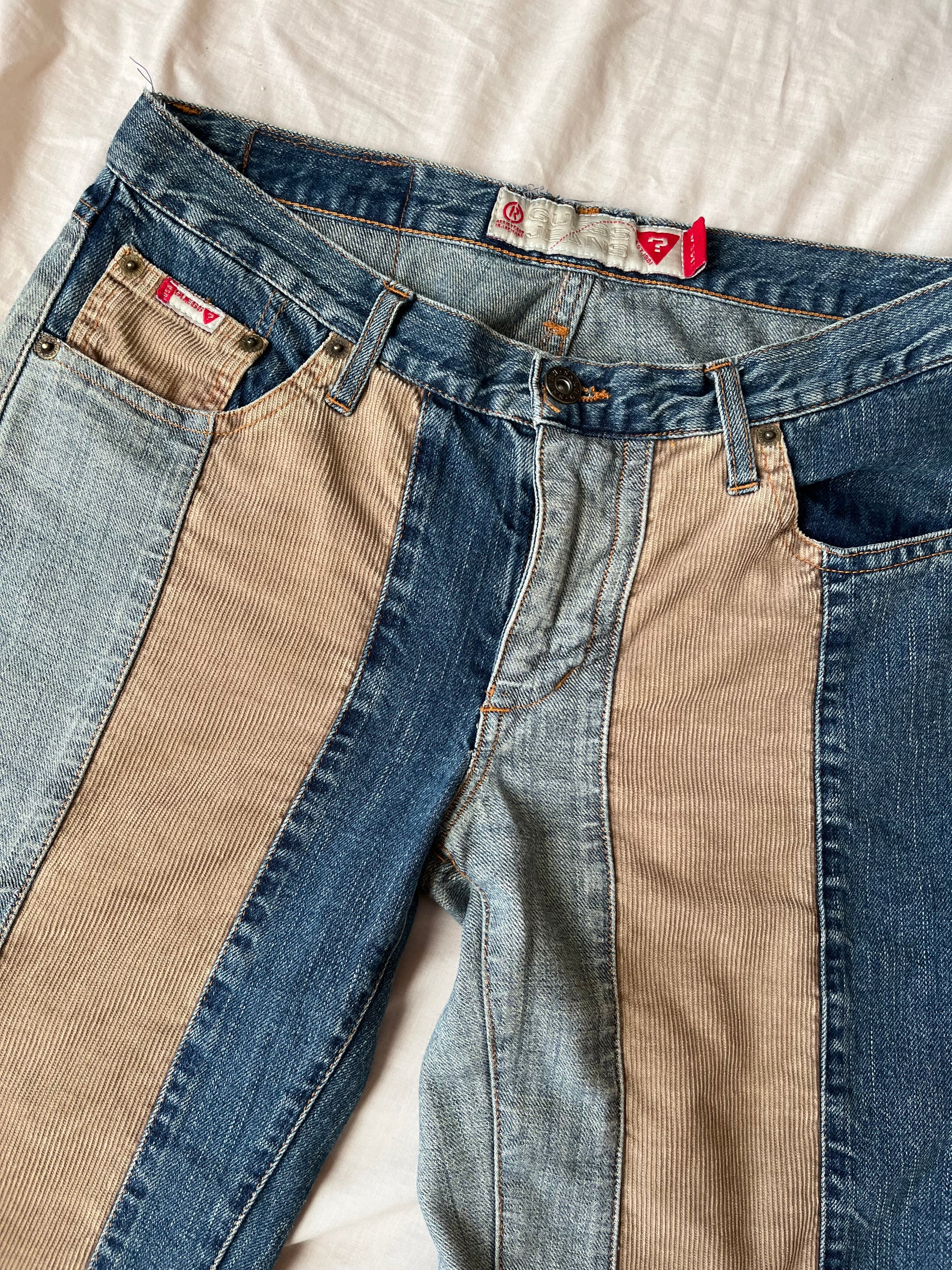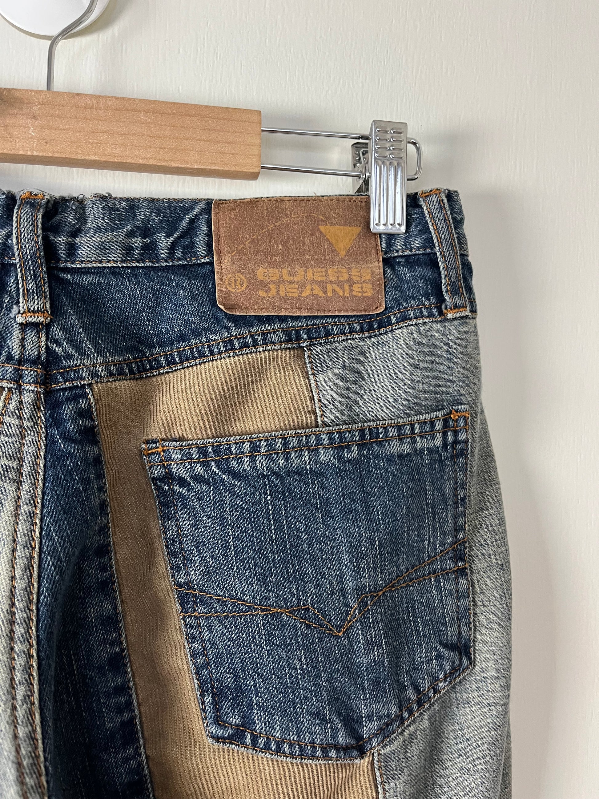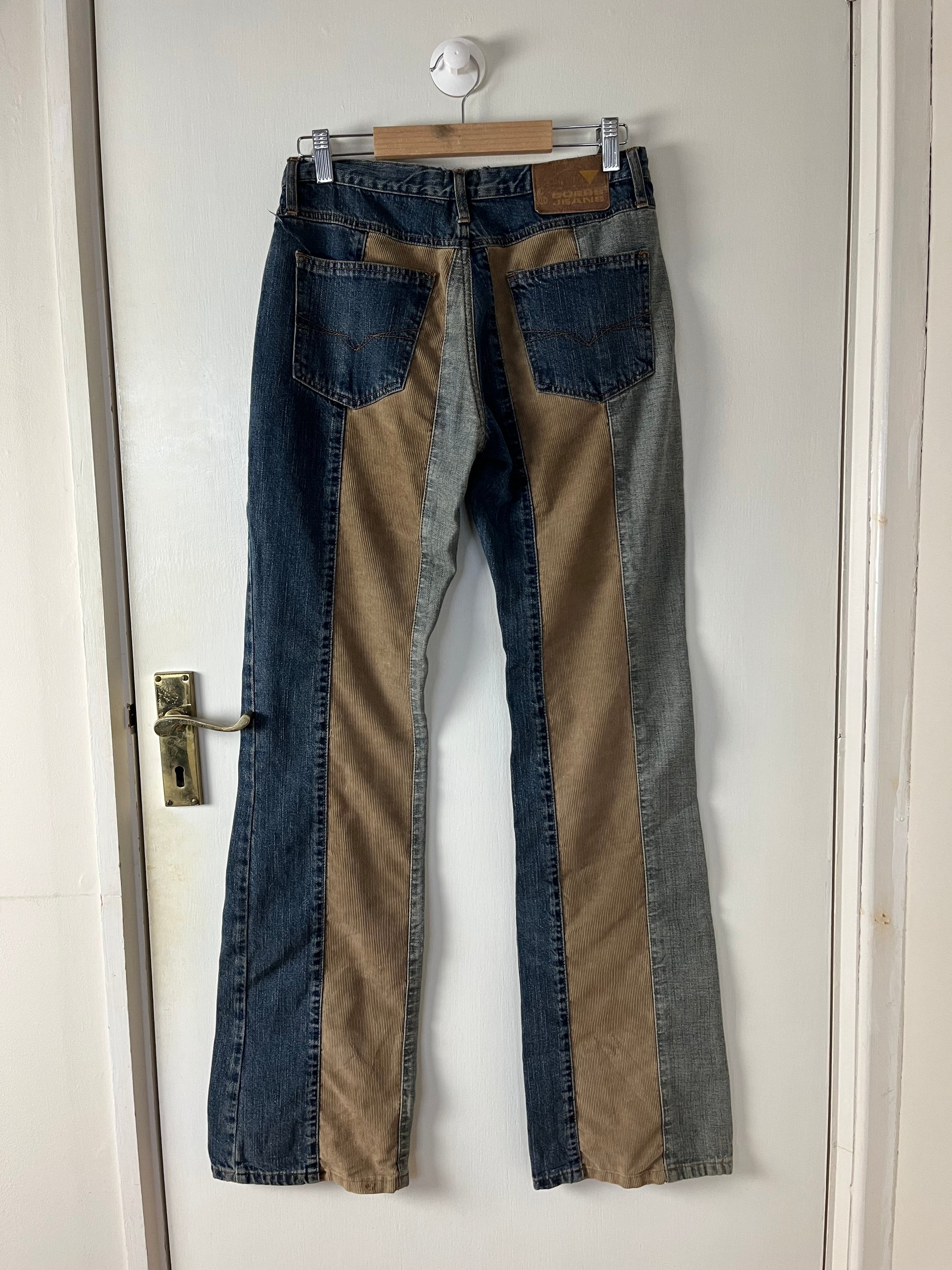 1990s/2000s jeans by Guess! These have a low waist, flared leg and corduroy and denim panels! Super cool and rare design.