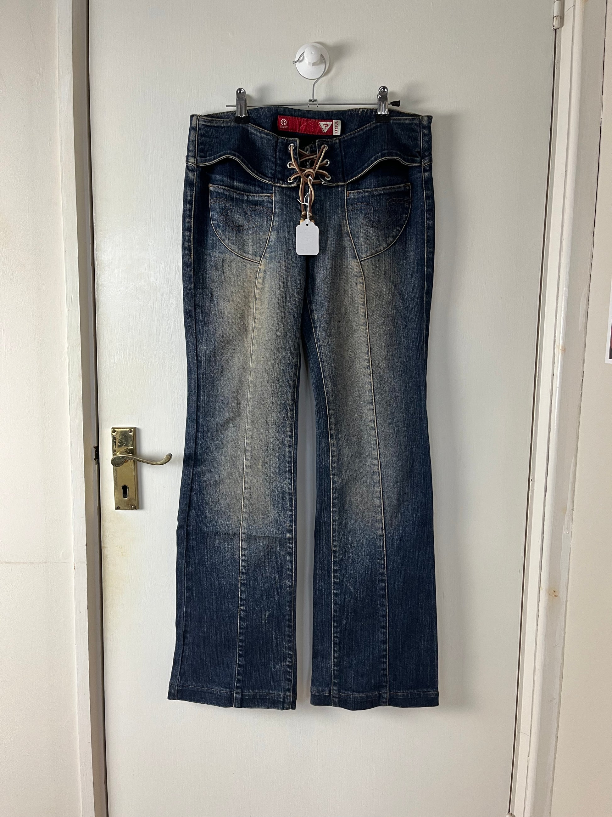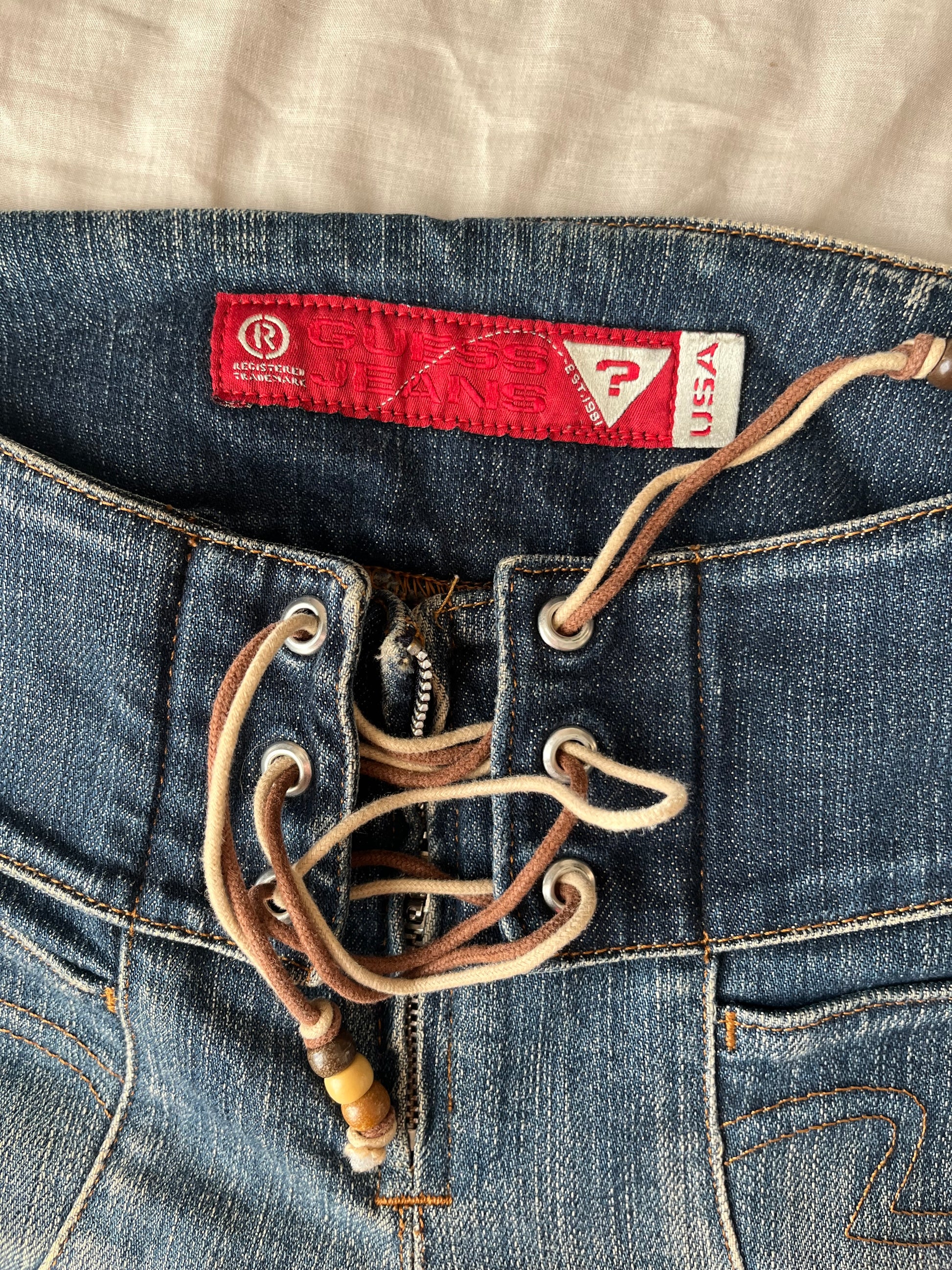 1990s/2000s jeans by Guess! These have a low waist, flared leg and a cool tie front design. Super cool and rare design.